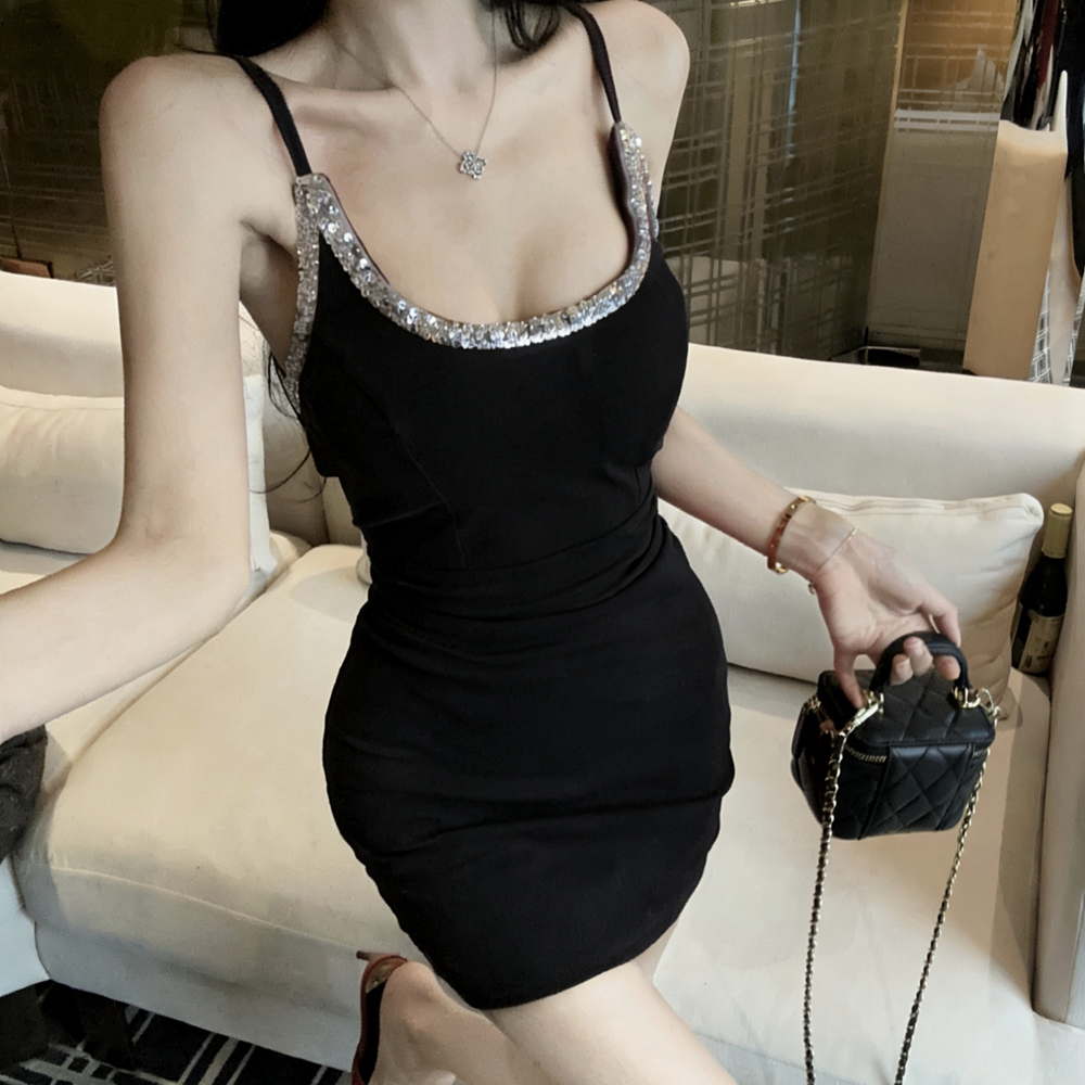 실사 순수한 욕망 스팽글 슬립 여성 드레스 몸매 가꾸기 타이트 스커트 미니 스커트 섹시함 낮은 가슴 백리스 예복 치마