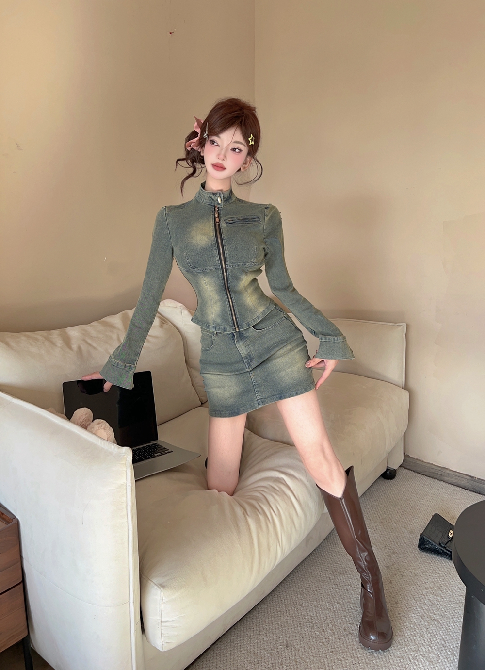 실사 아메리칸 레트로 패션 데님 길다 소매 커버 척 오래된 쇼트 스타일 트렌디 타이트 데님 재킷 미니 스커트 세트