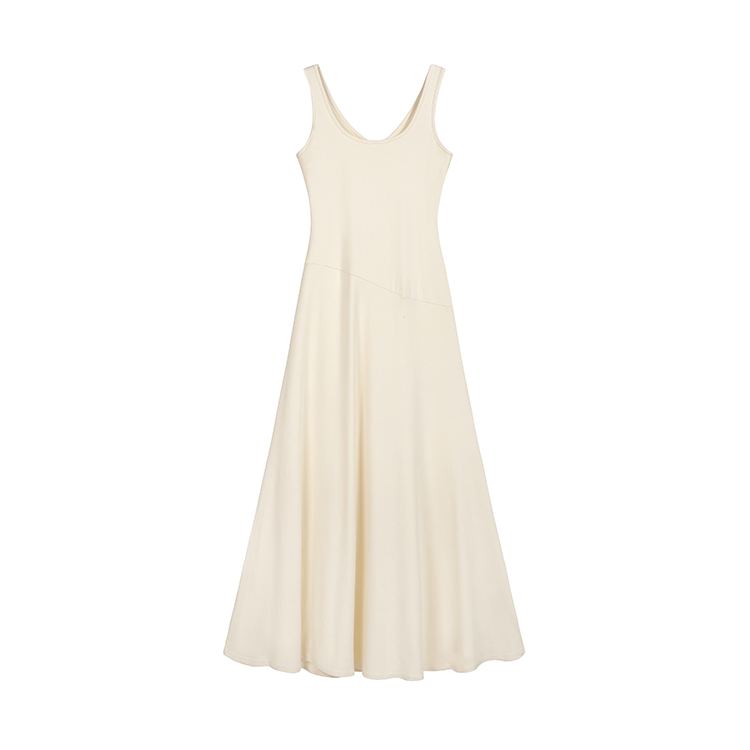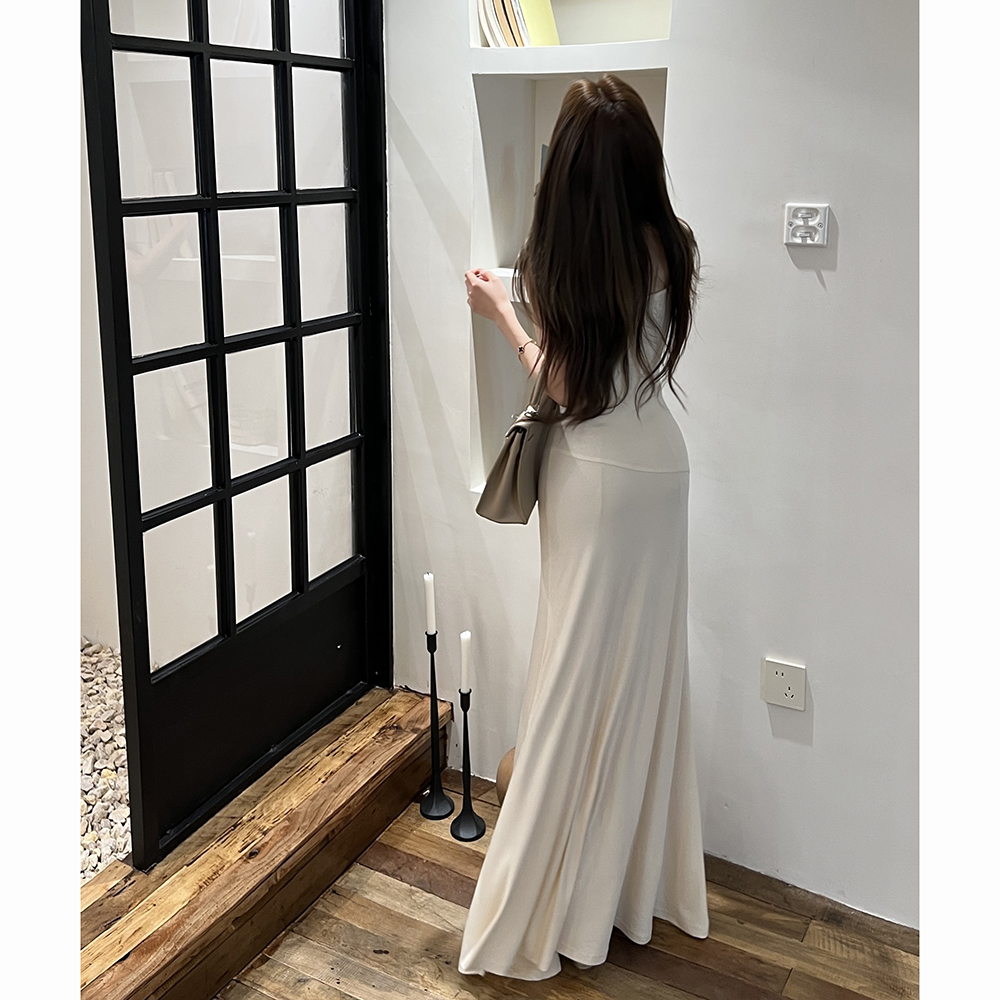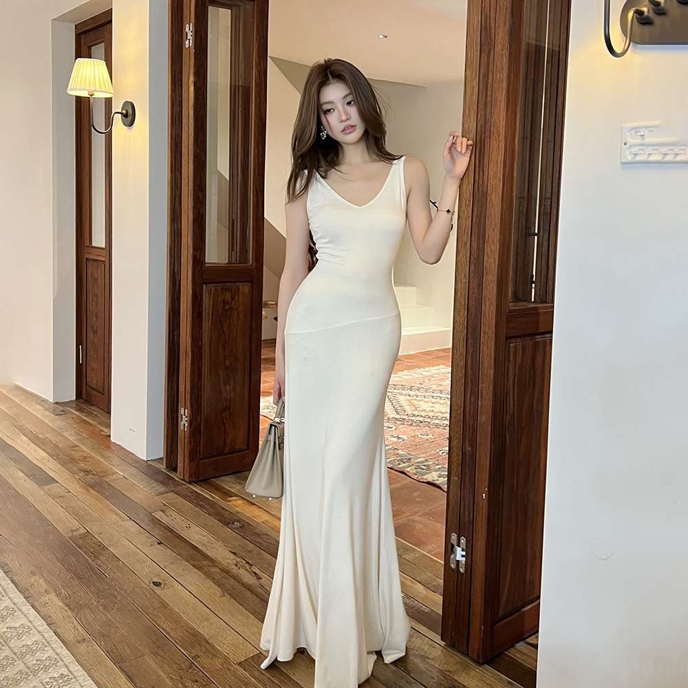 실사 2026 봄 여름 새로운 백리스 홀로우 아웃 품격 몸매 가꾸기 허리 수축 큰 진자 롱 스커트 단어 조끼 여성 드레스