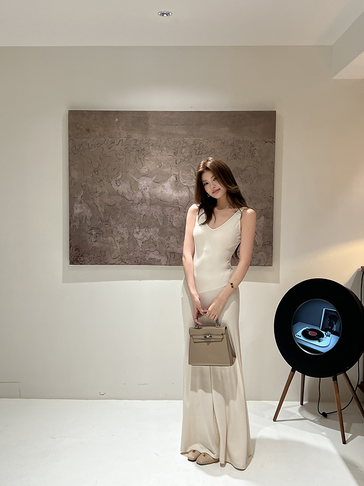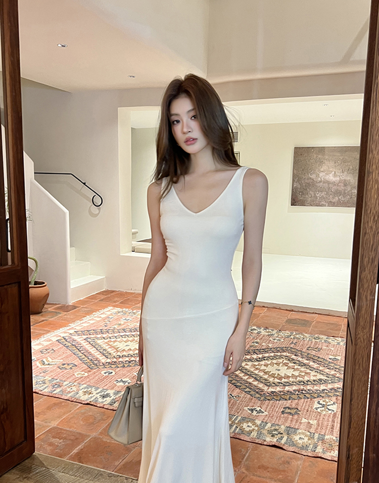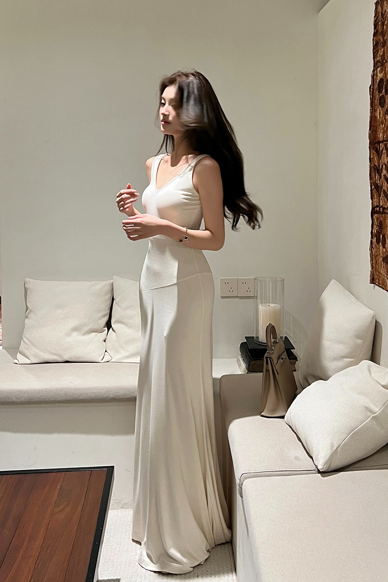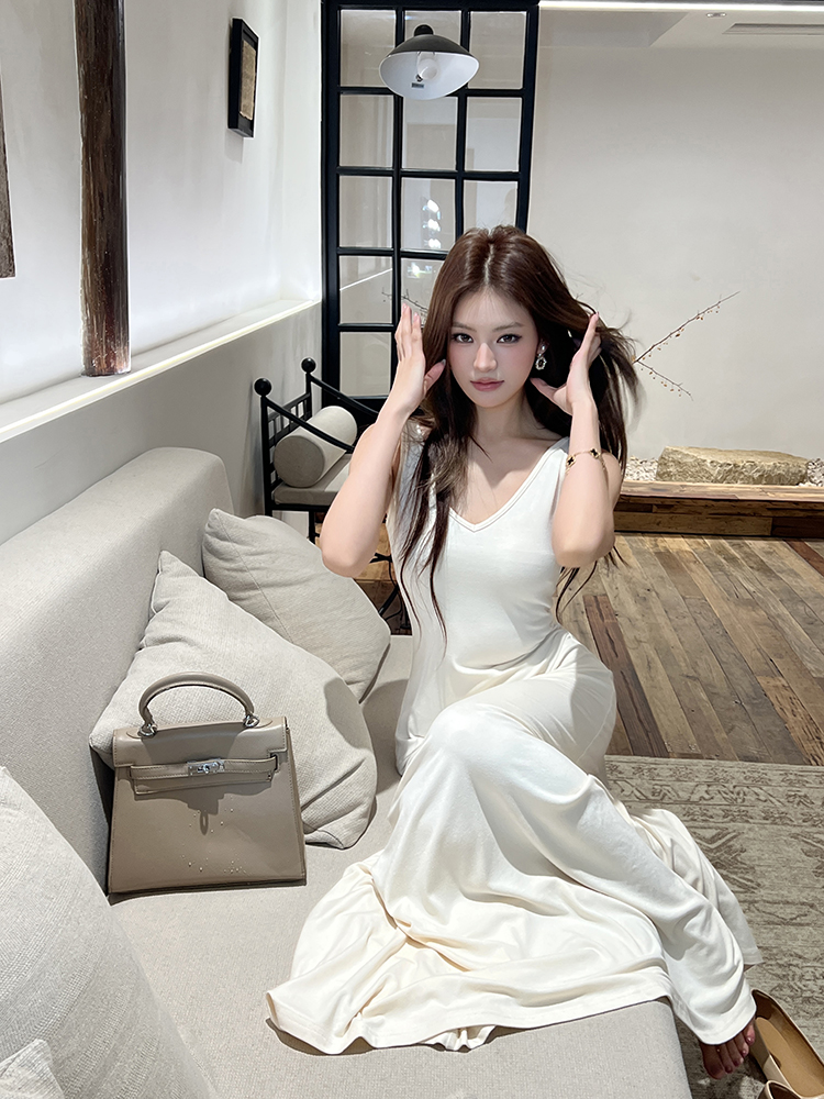 실사 2026 봄 여름 새로운 미니멀리즘 디자인 센스 품격 몸매 가꾸기 한 마디 익스트림 제인 V넥 여성 드레스 길다 치마