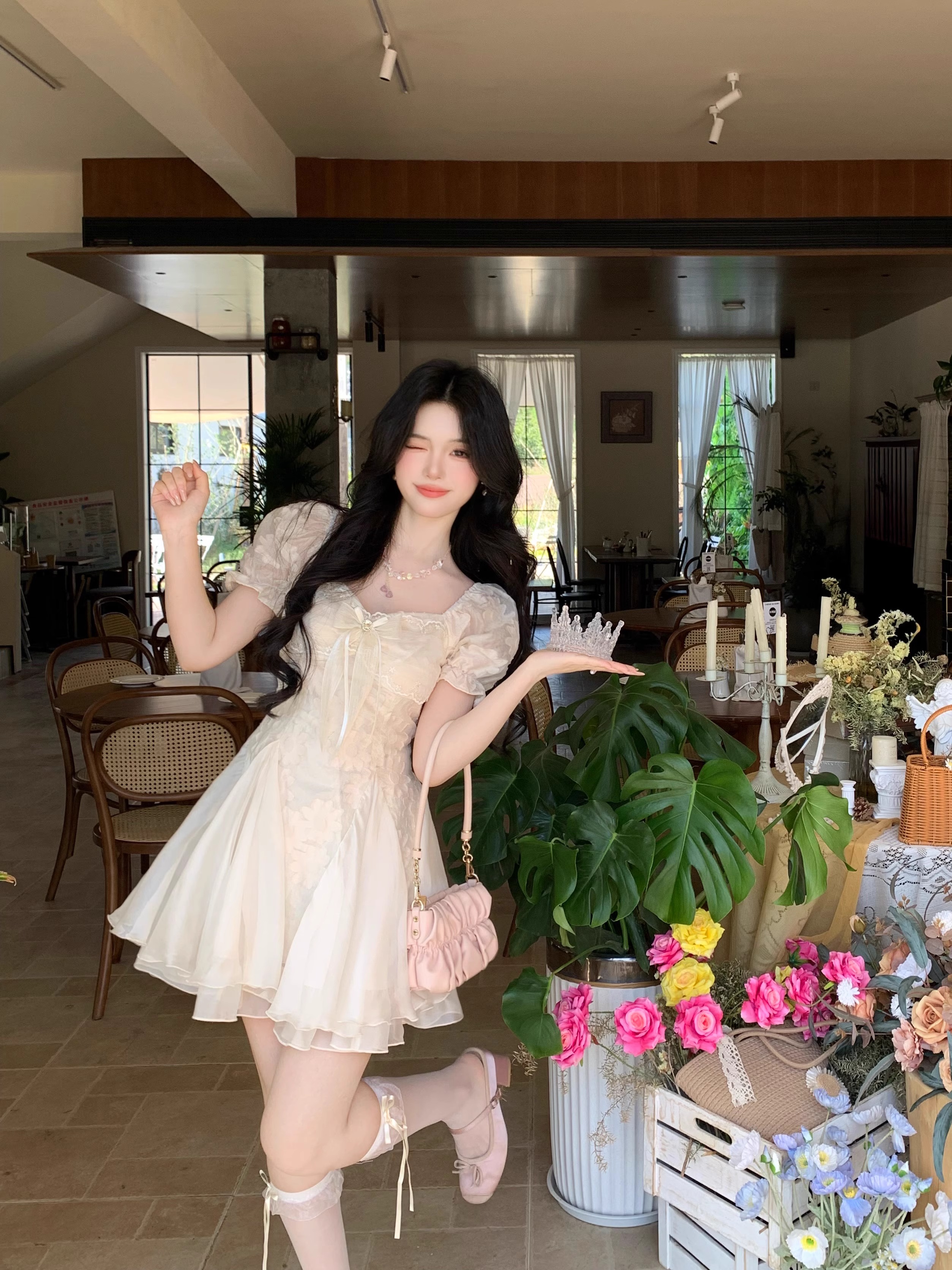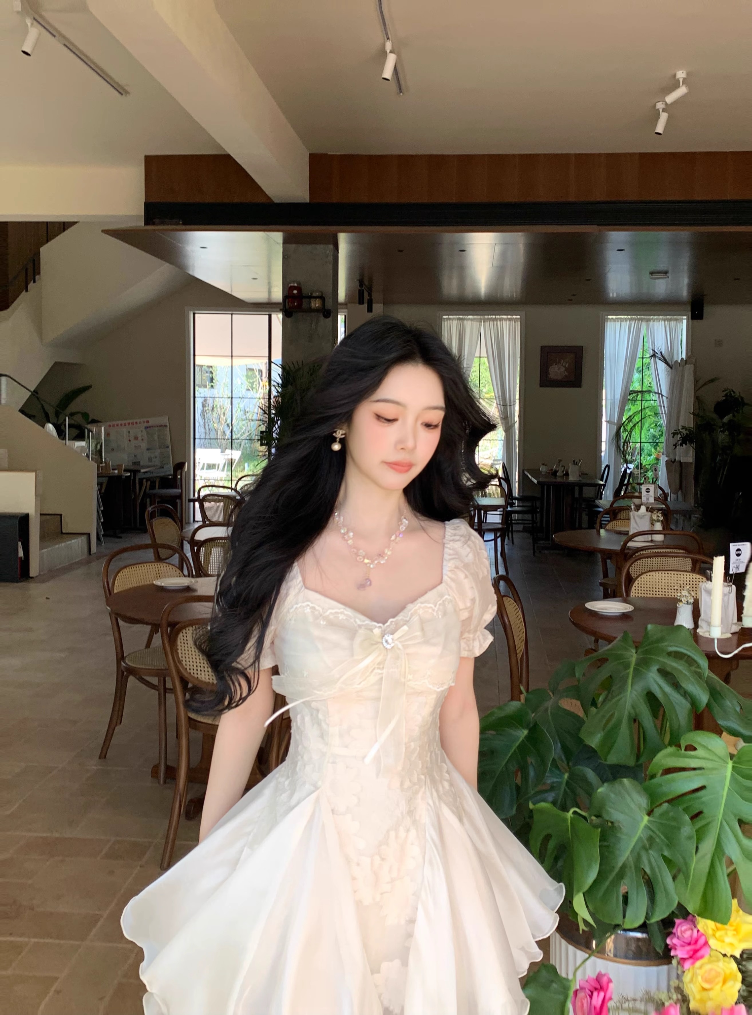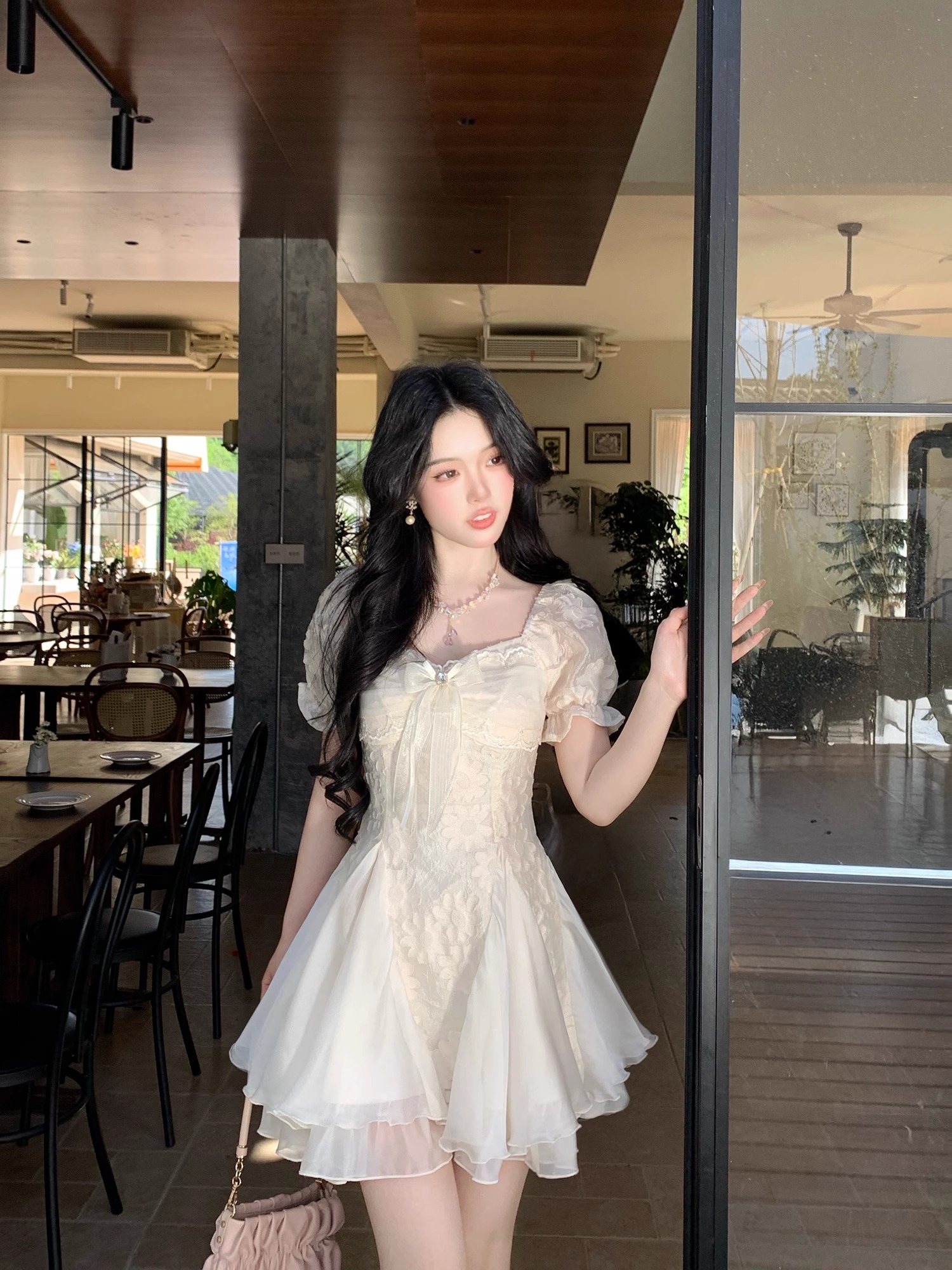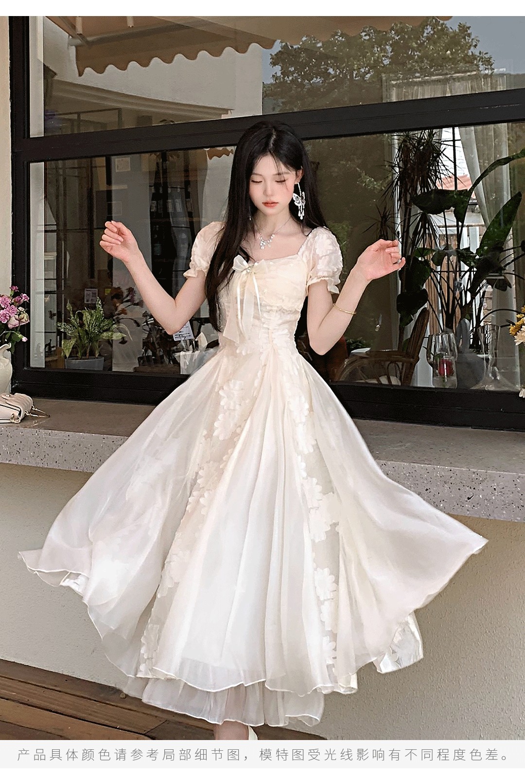 blovelan 화이트 티 와 바람 순수한 욕망 하얀 달빛 품격 자수 꽃 퍼프 드레스 휴가 바람 롱 스커트 여성