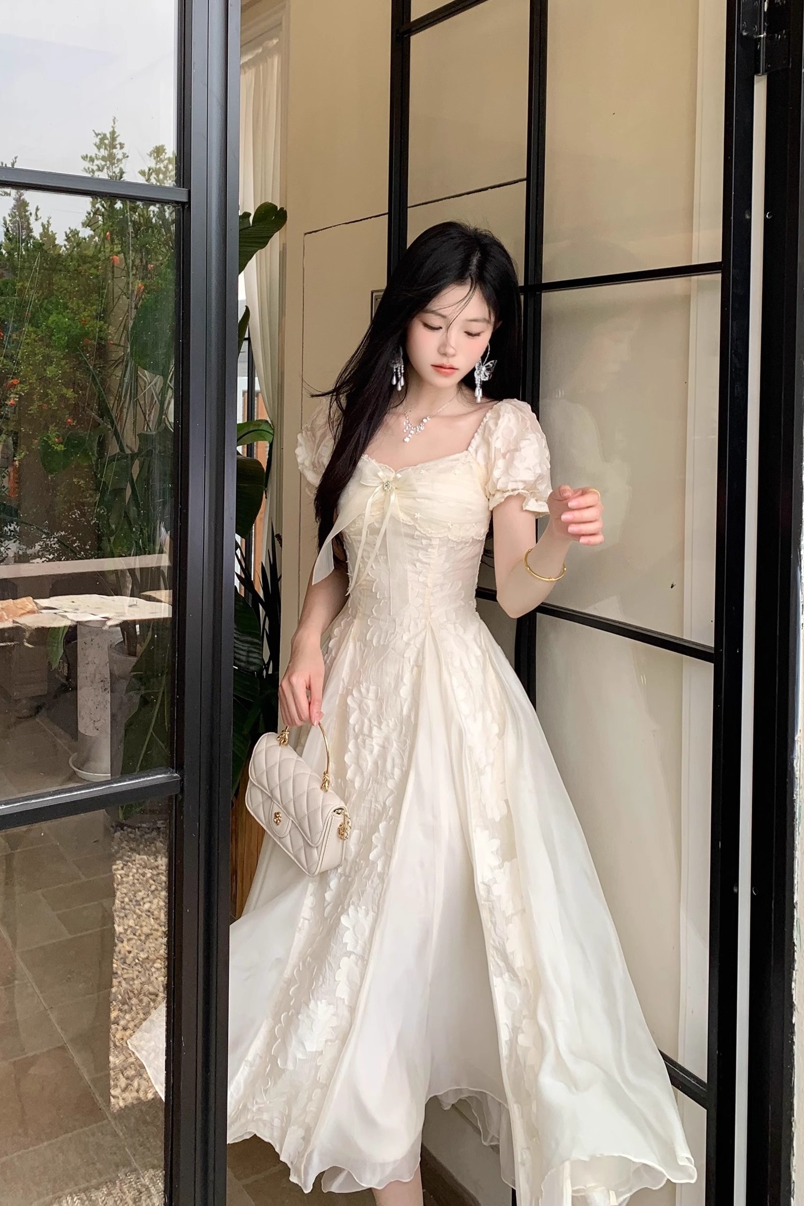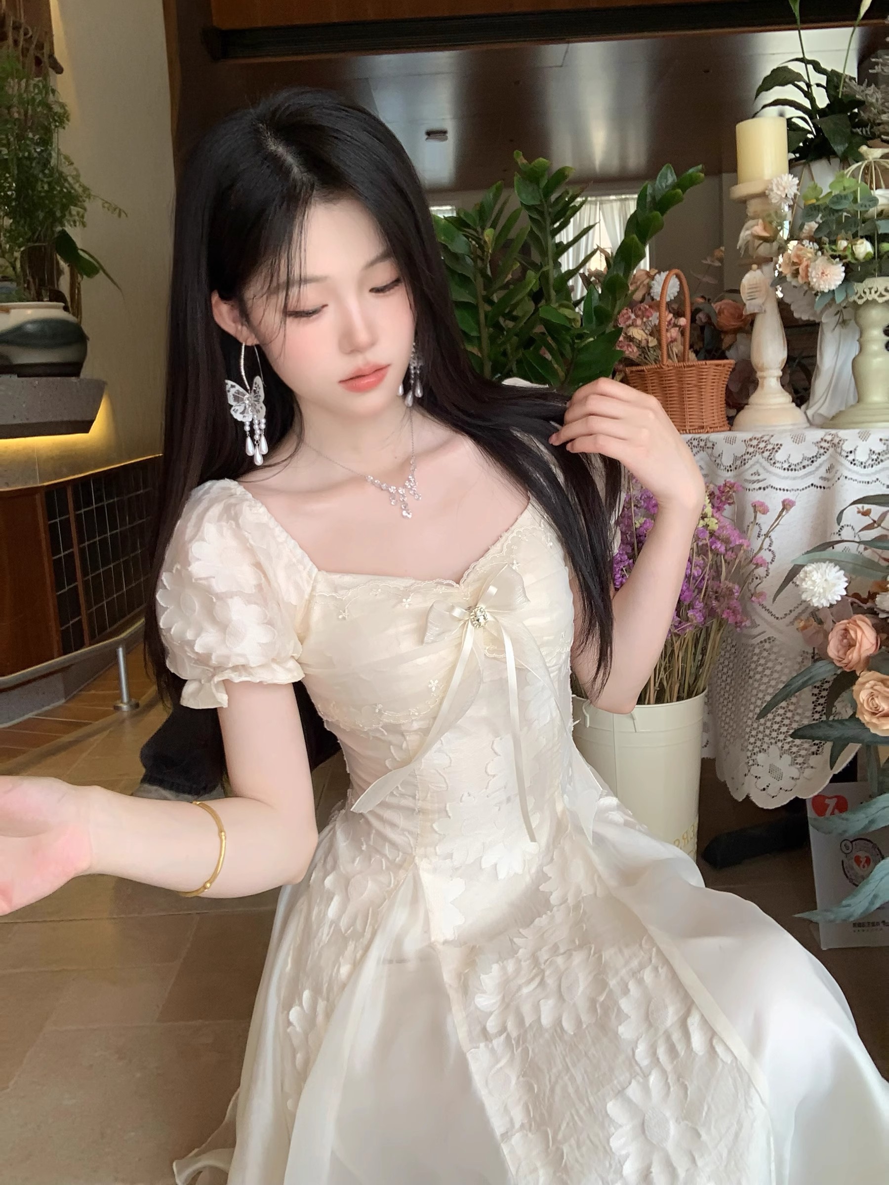 blovelan 화이트 티 와 바람 순수한 욕망 하얀 달빛 품격 자수 꽃 퍼프 드레스 휴가 바람 롱 스커트 여성