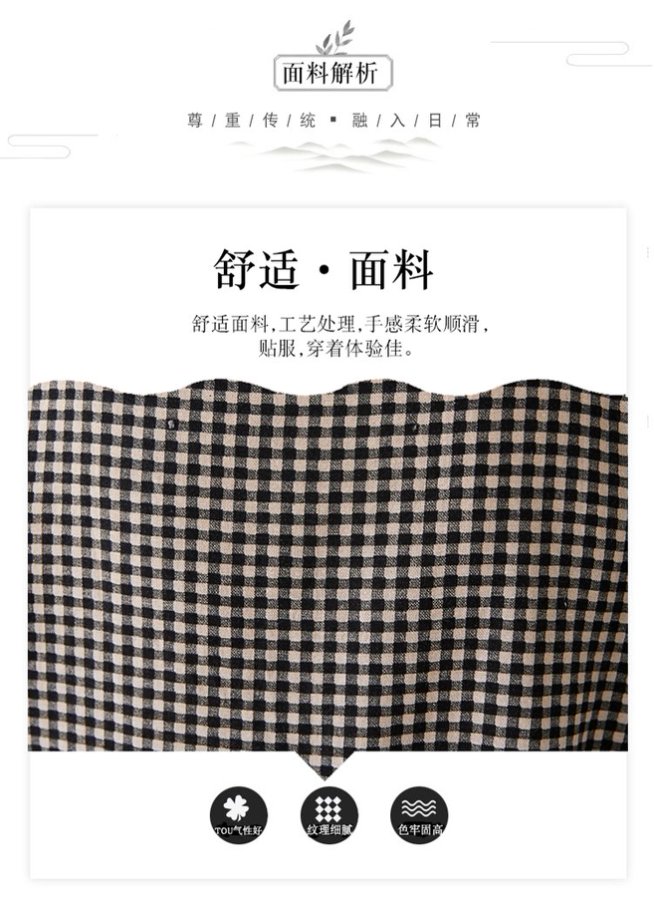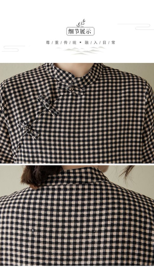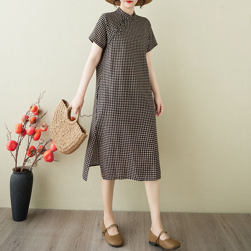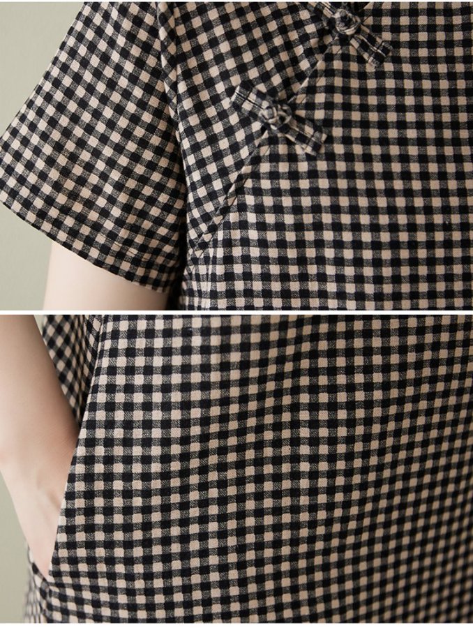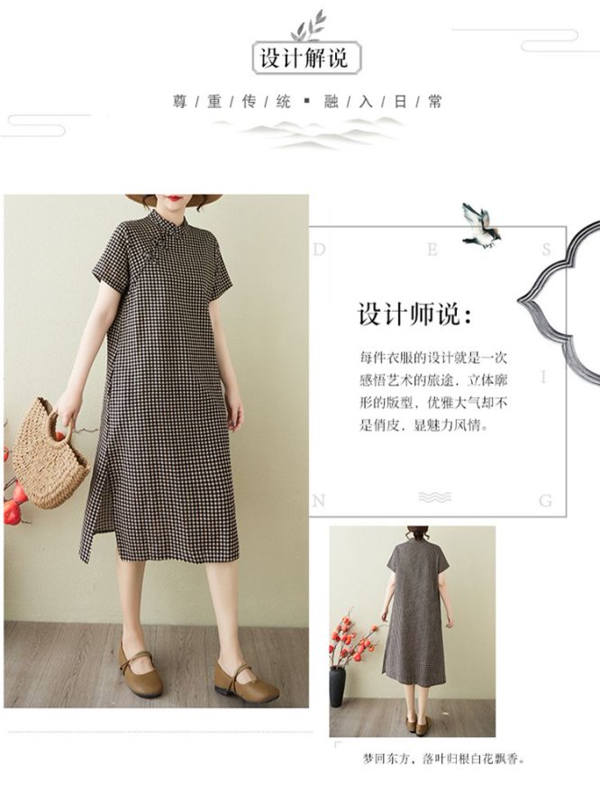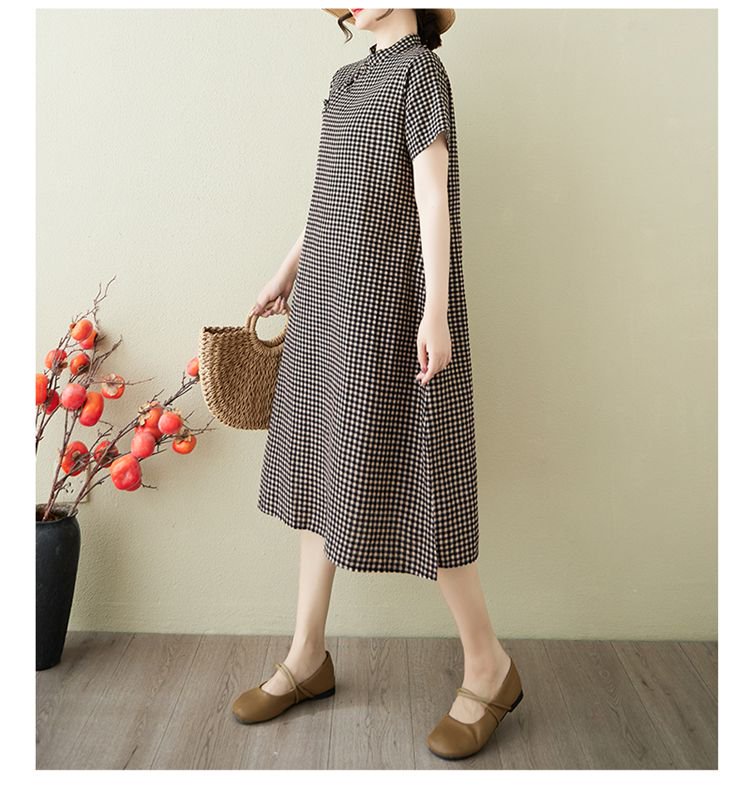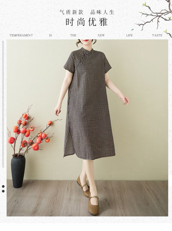 여름 빅 사이즈 여성 의류 면직물 작은 격자 루즈핏 캐주얼 다용도 개선 빅 사이즈 일상 반팔 치파오 중간 길이 스커트