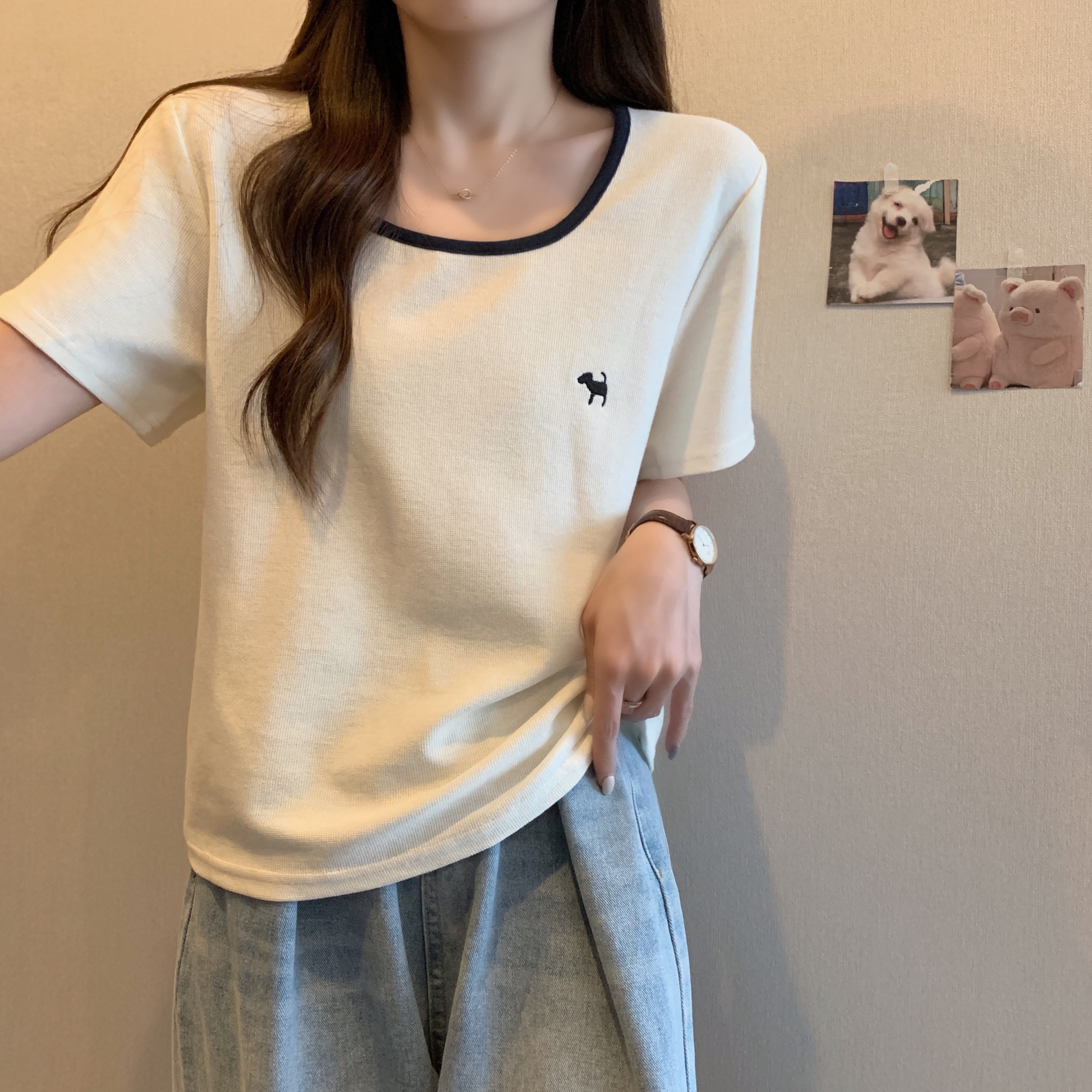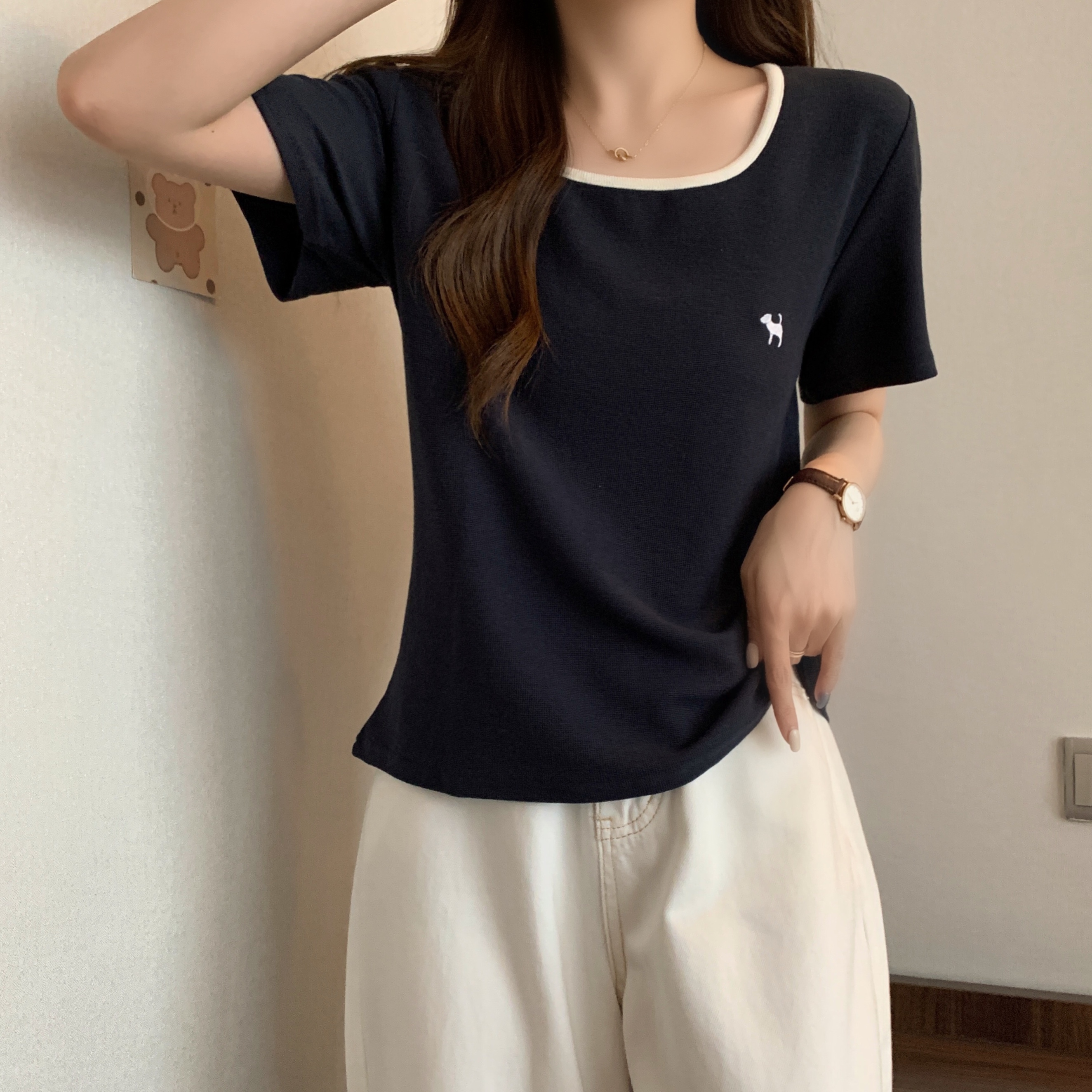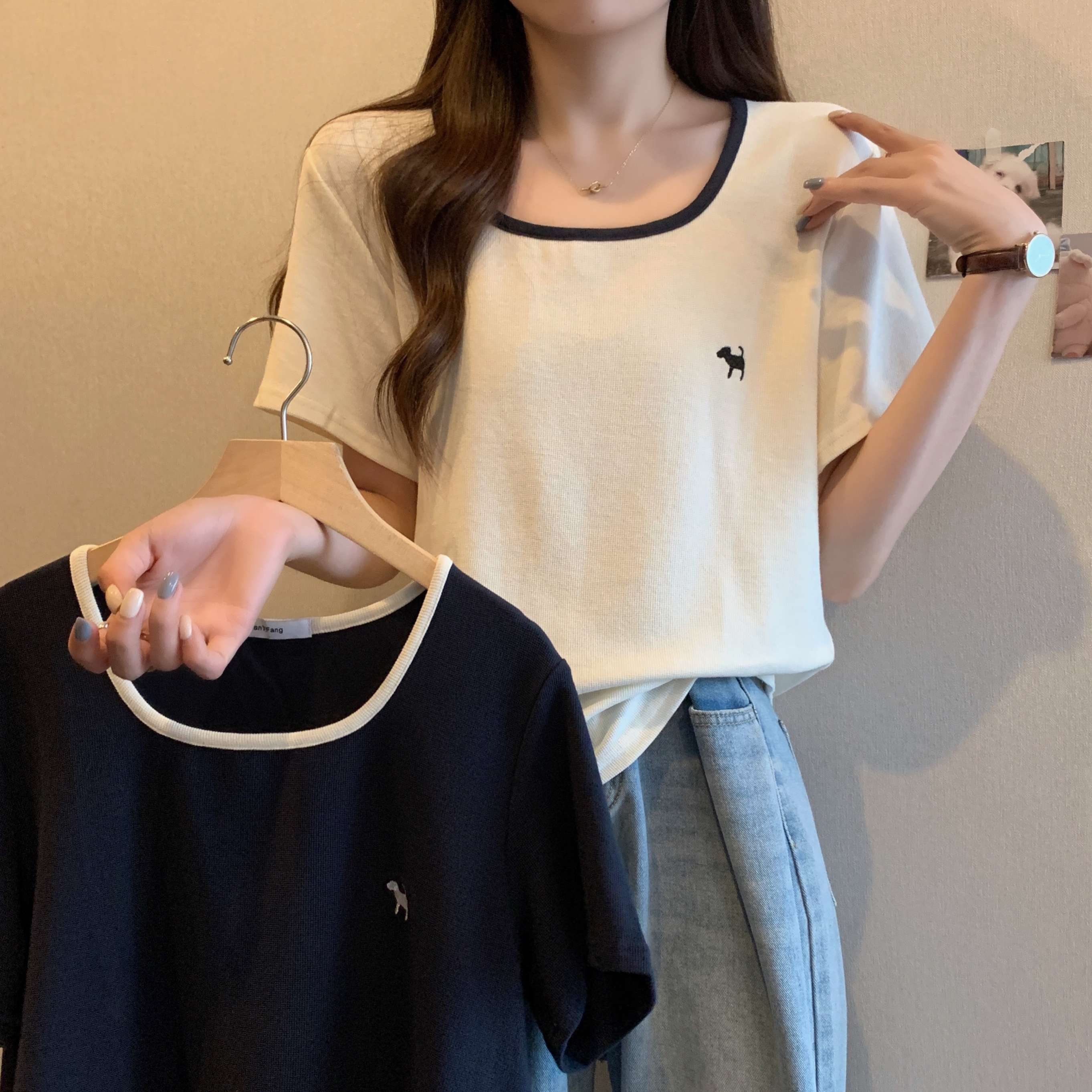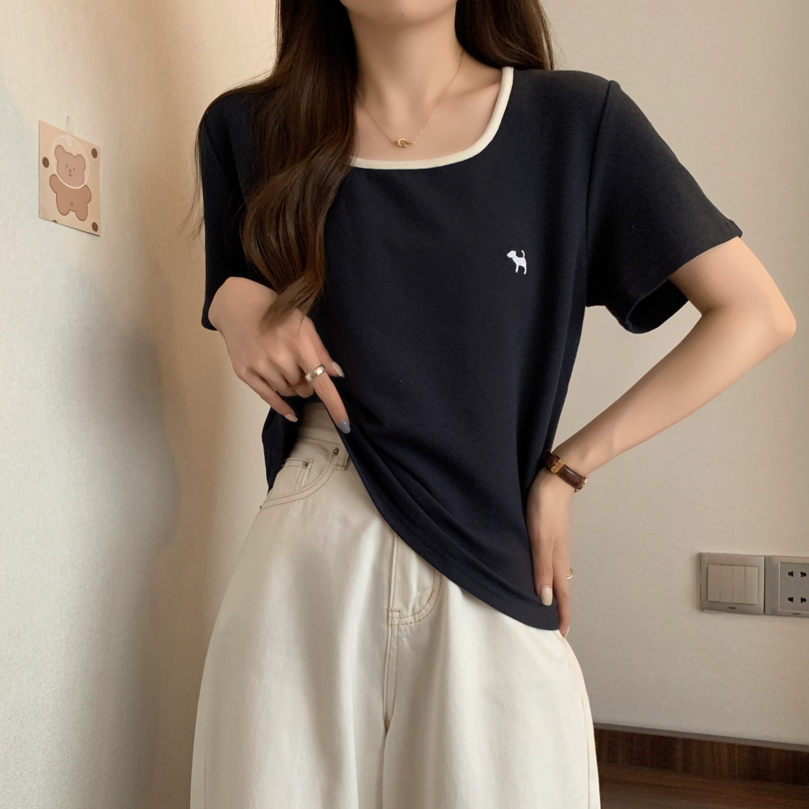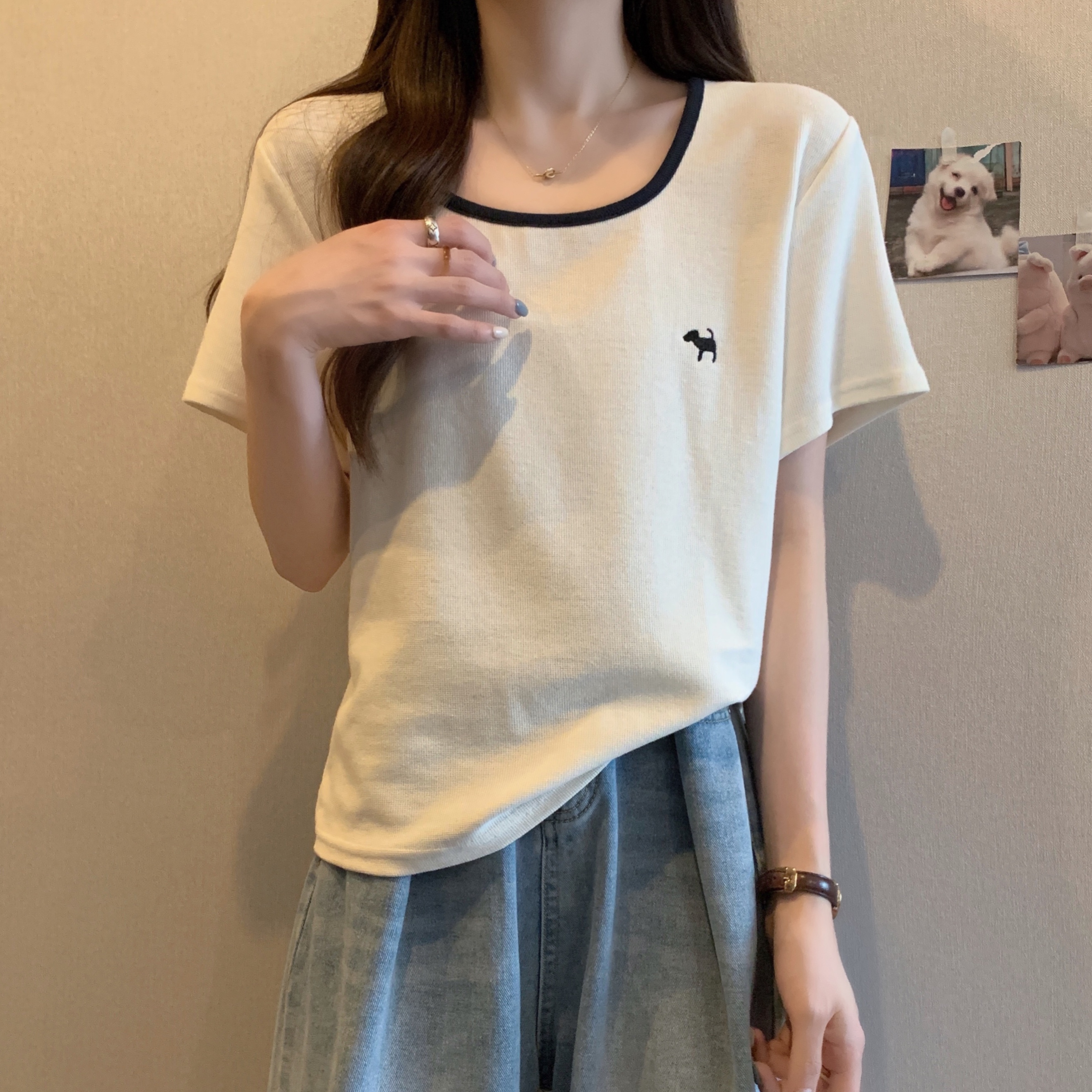 실사 빅 사이즈 여성 의류 광장 칼라 슬림해 보이는 단색 맨위 자수 토끼 배색 긍정적 인 어깨 반팔 티셔츠