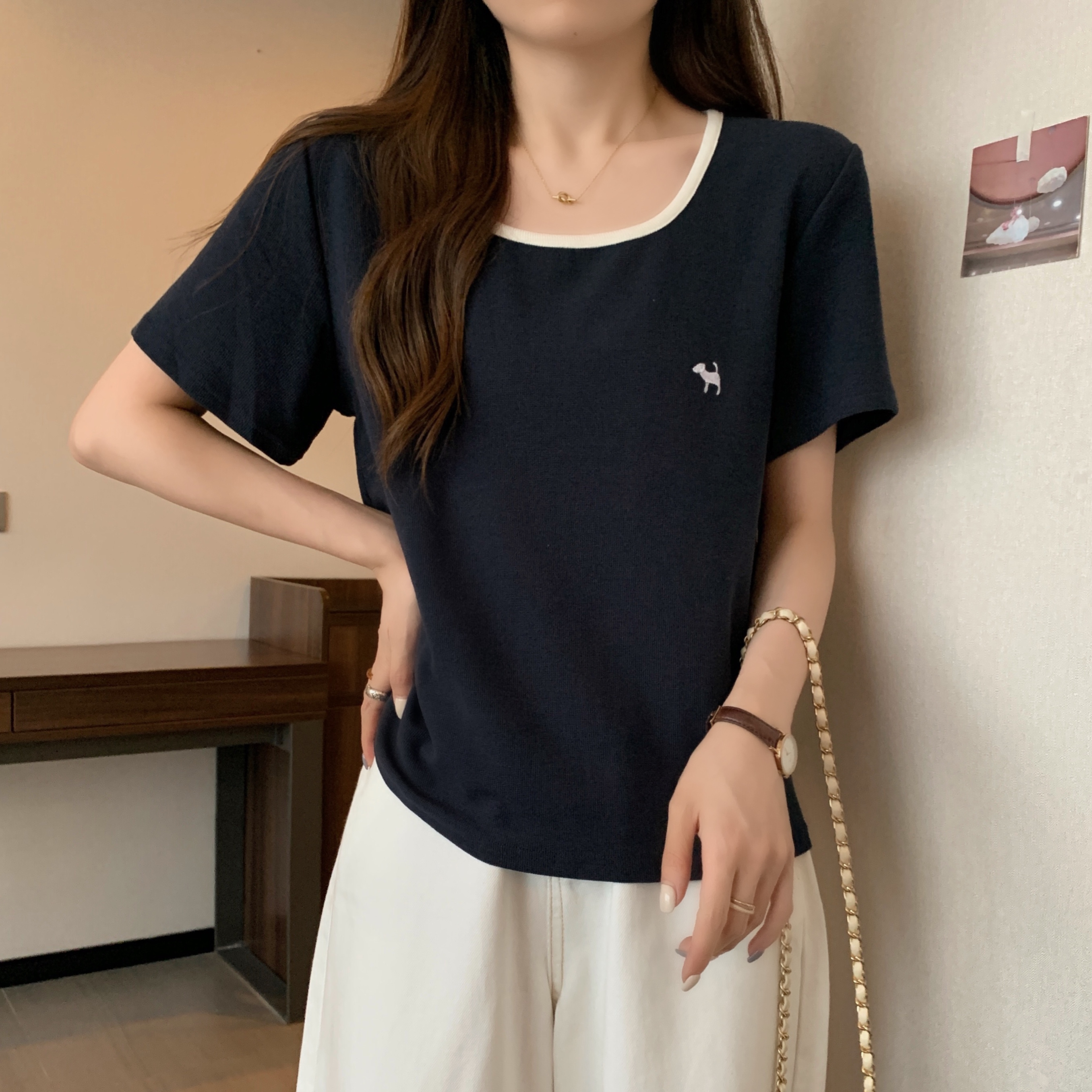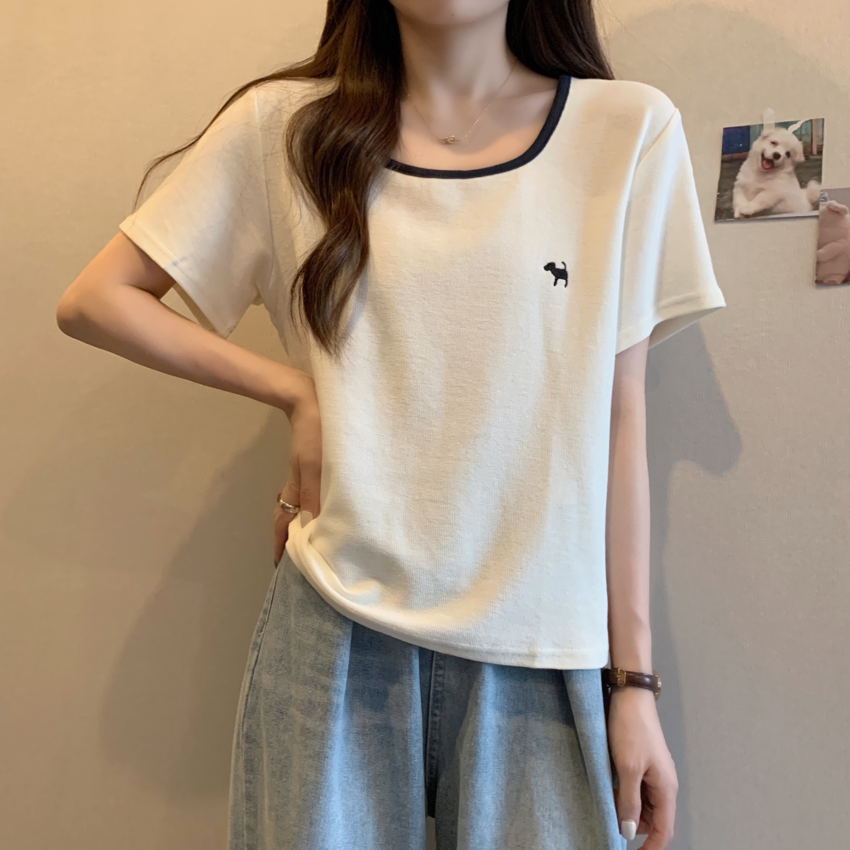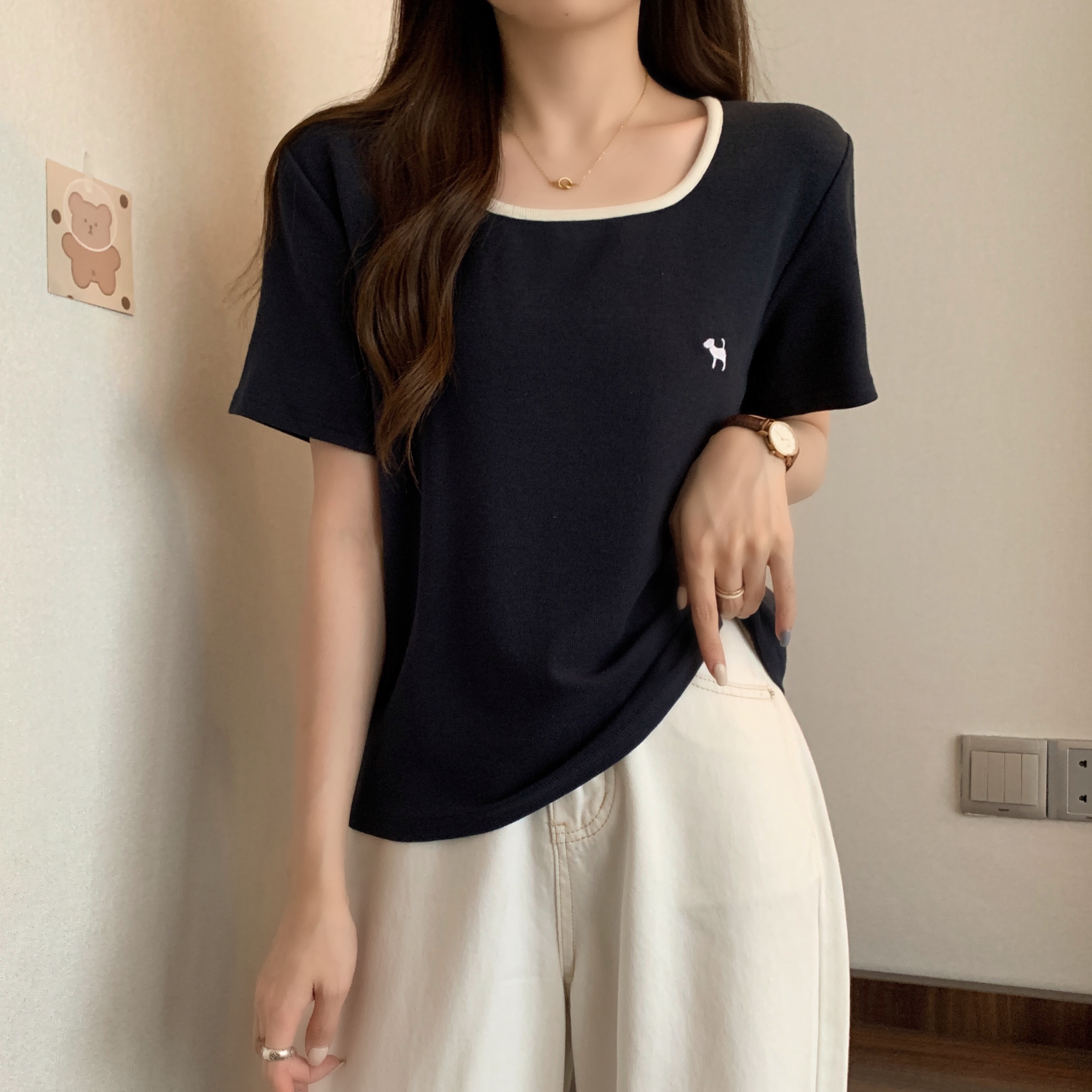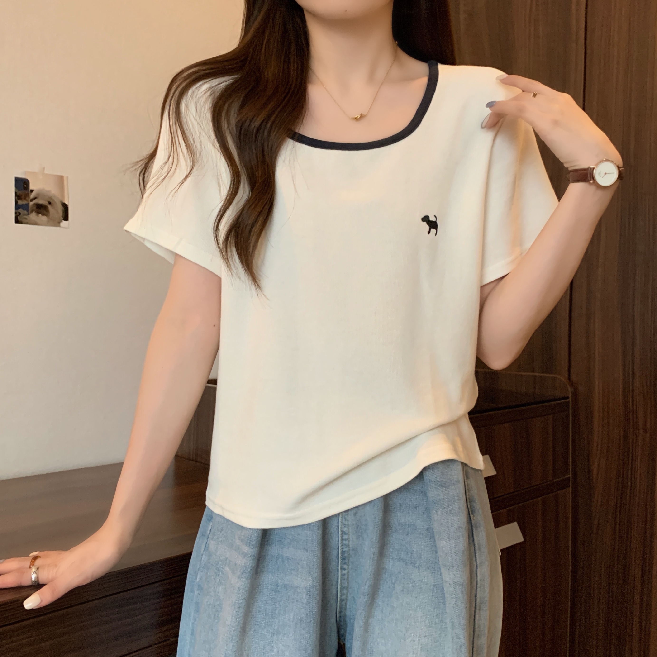 실사 빅 사이즈 여성 의류 광장 칼라 슬림해 보이는 단색 맨위 자수 토끼 배색 긍정적 인 어깨 반팔 티셔츠