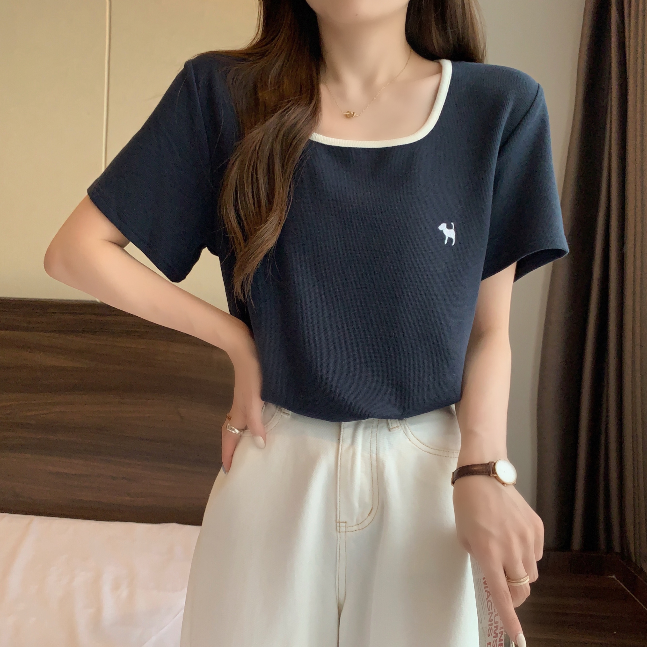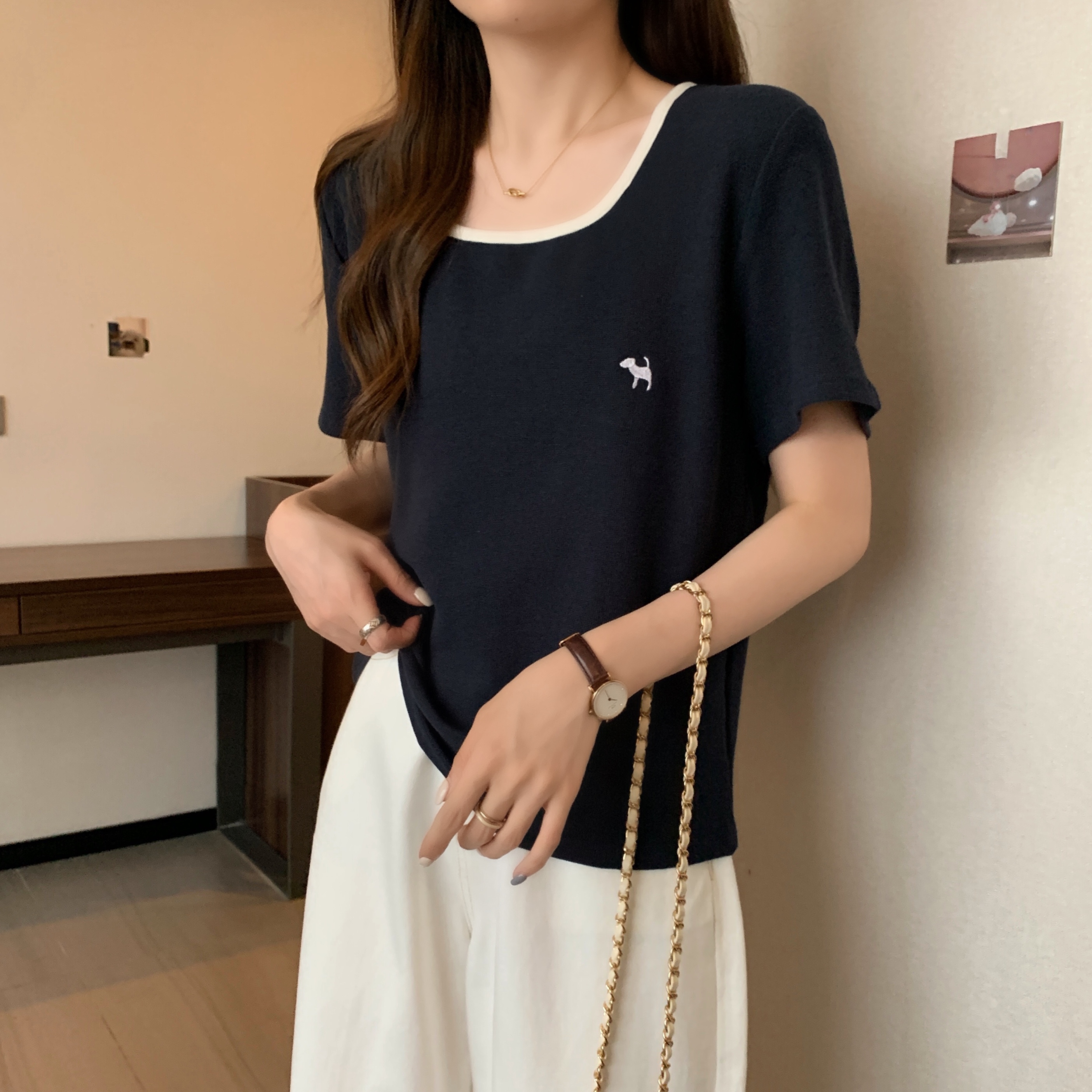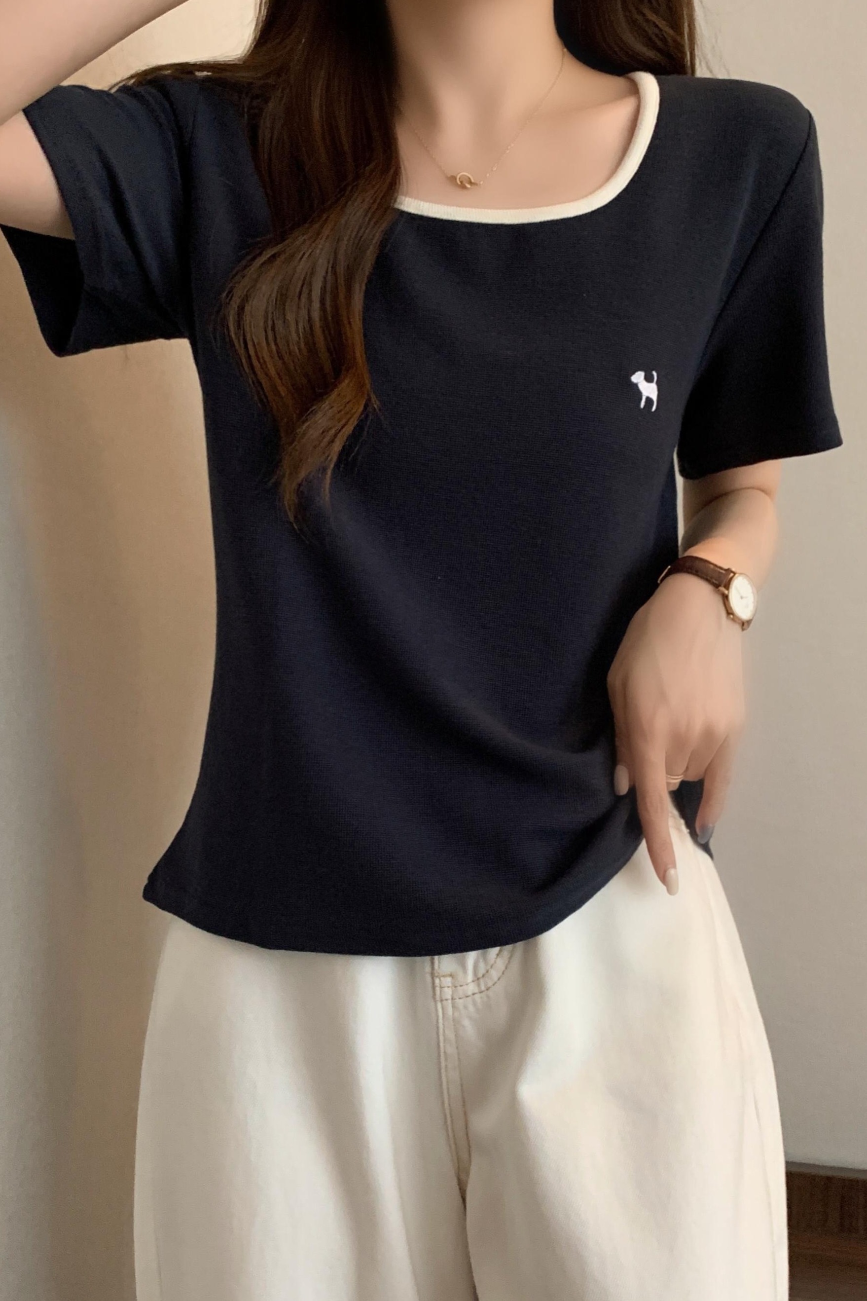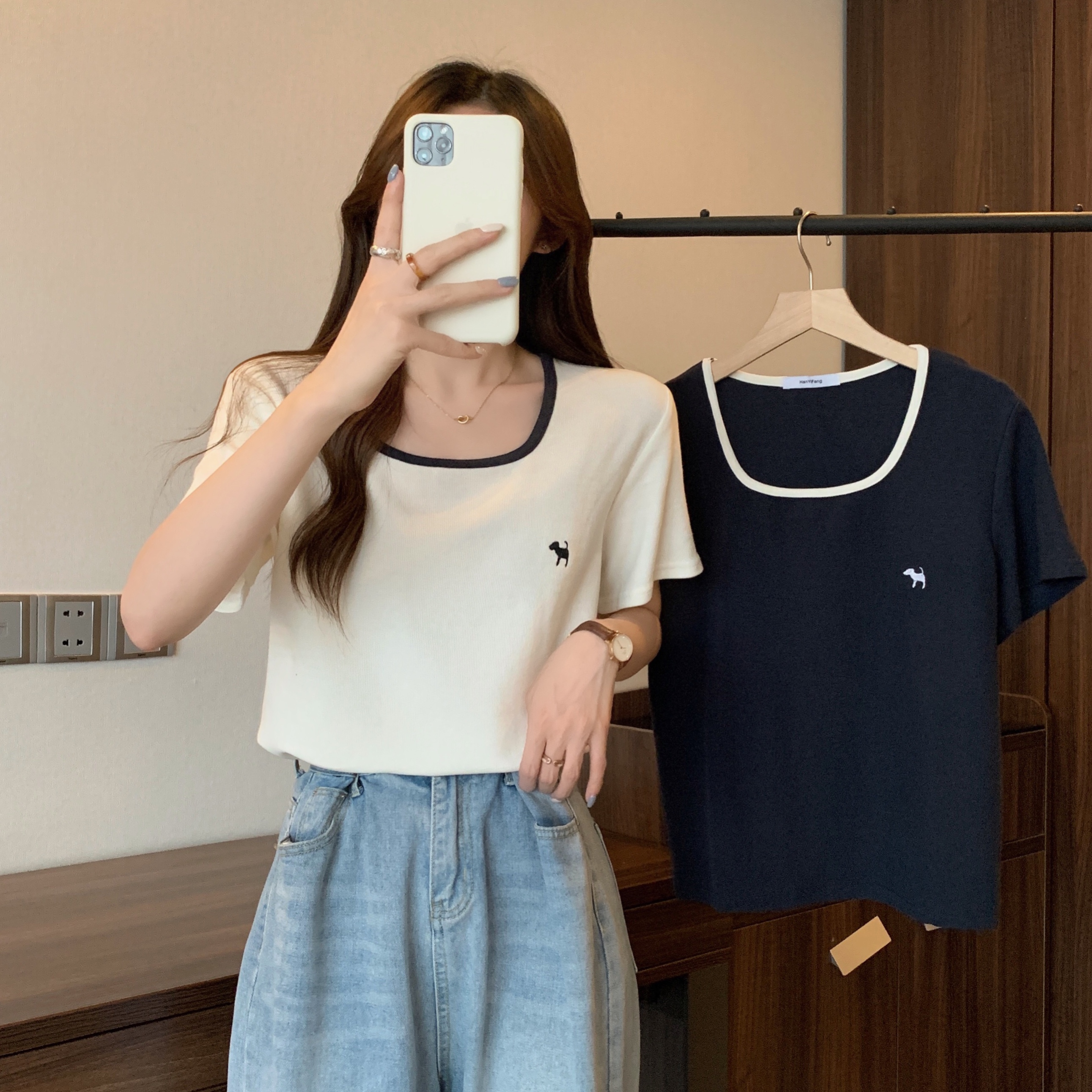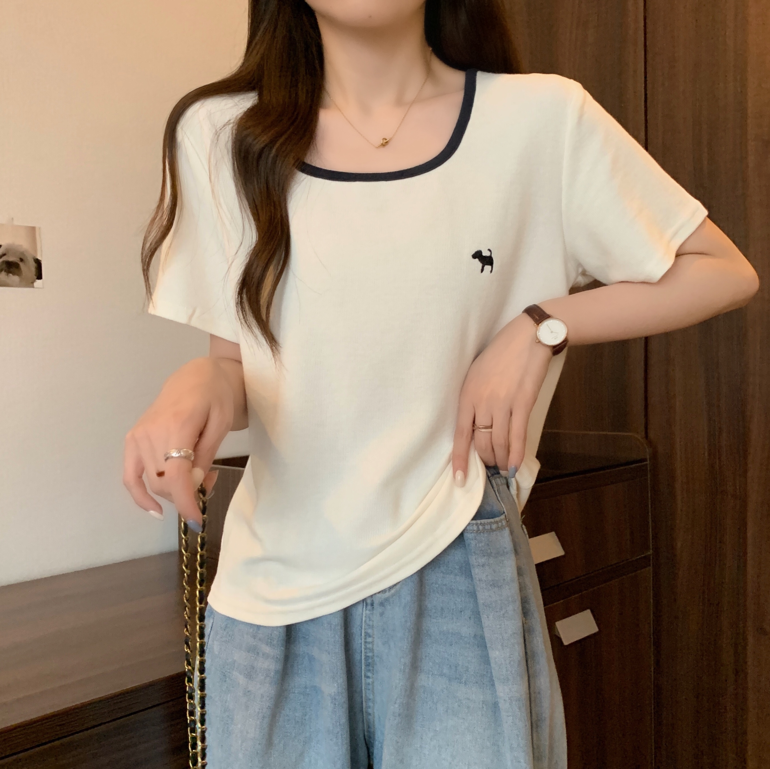 실사 빅 사이즈 여성 의류 광장 칼라 슬림해 보이는 단색 맨위 자수 토끼 배색 긍정적 인 어깨 반팔 티셔츠