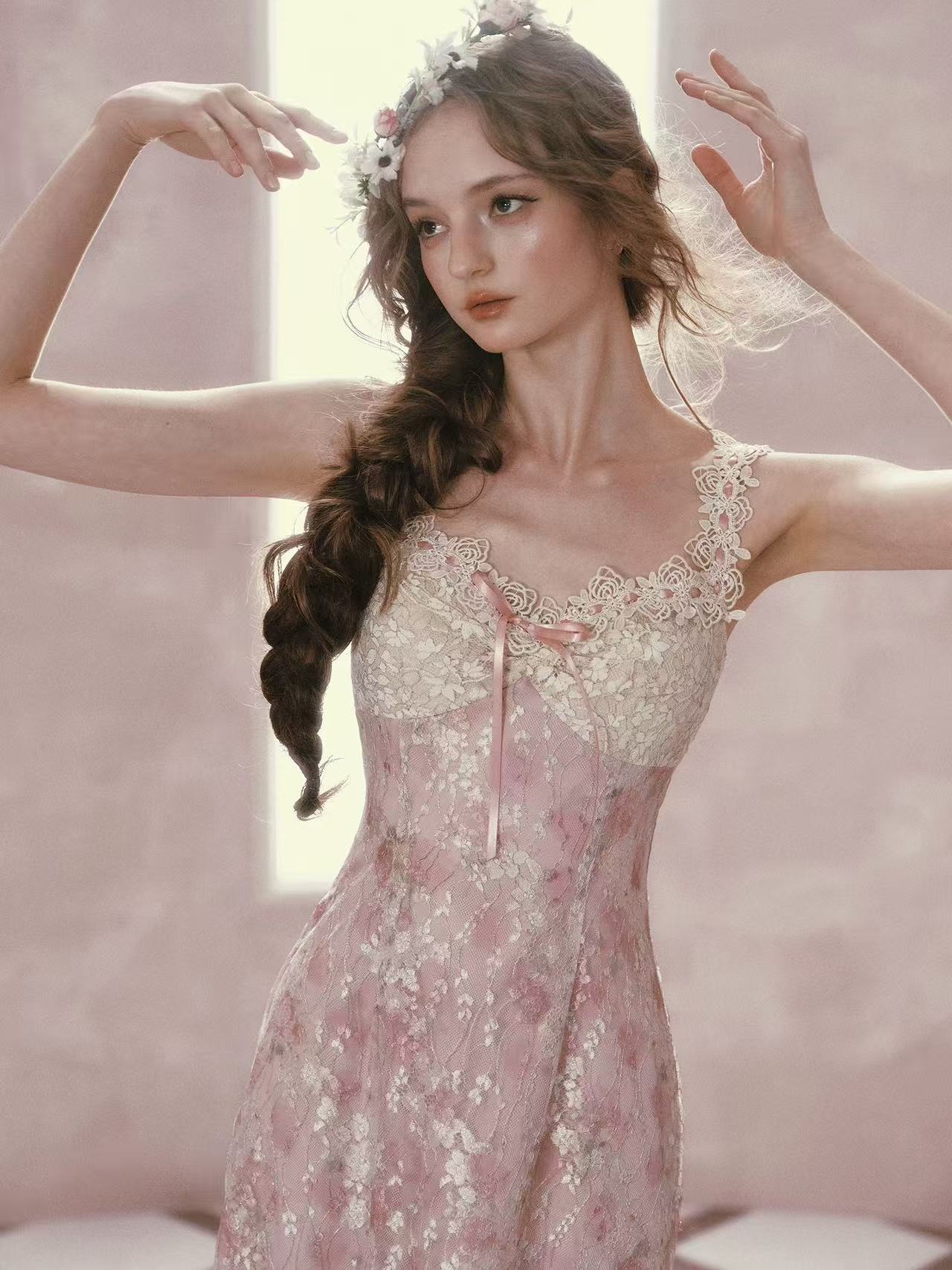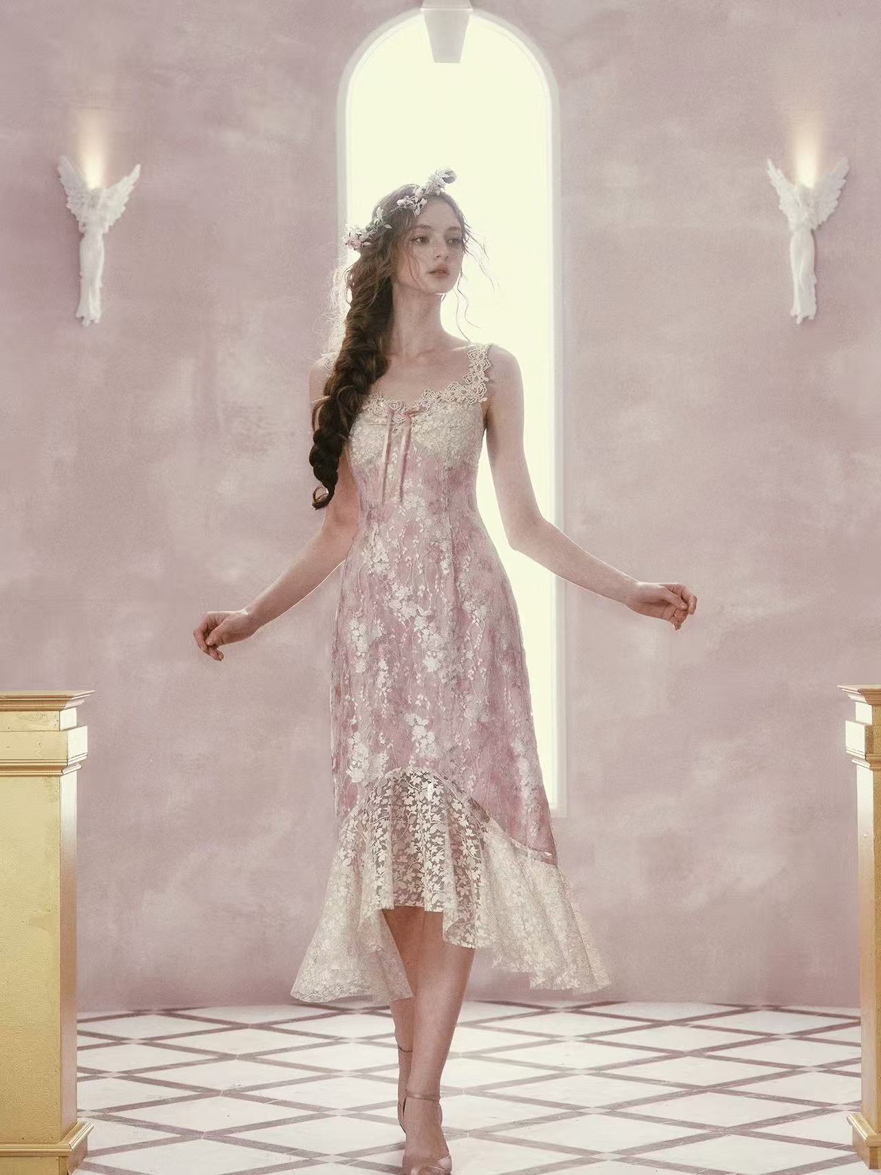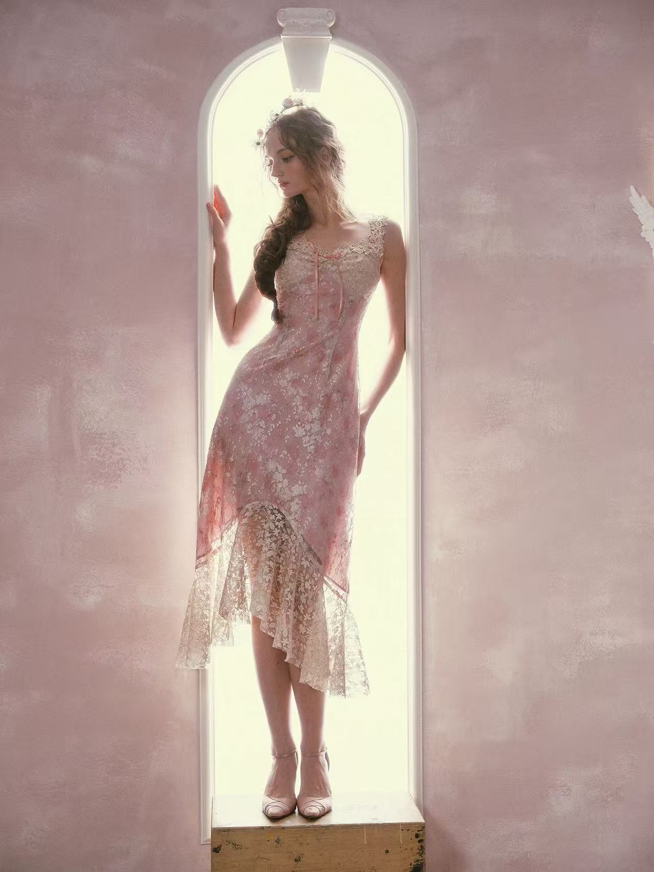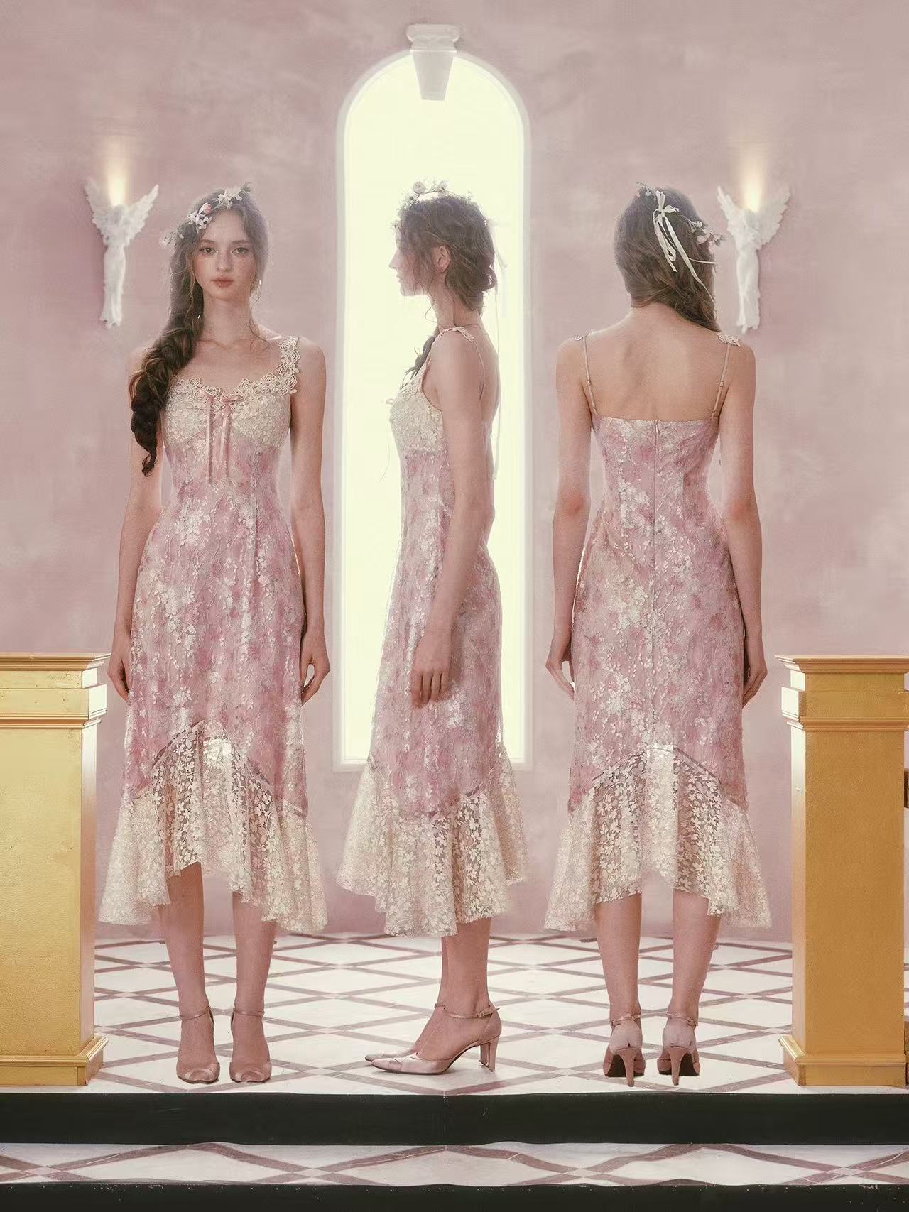 프랑스식 로코코 바람 레이스 꽃무늬 휴가 드레스 허리 수축 인어 꼬리 스커트 여름
