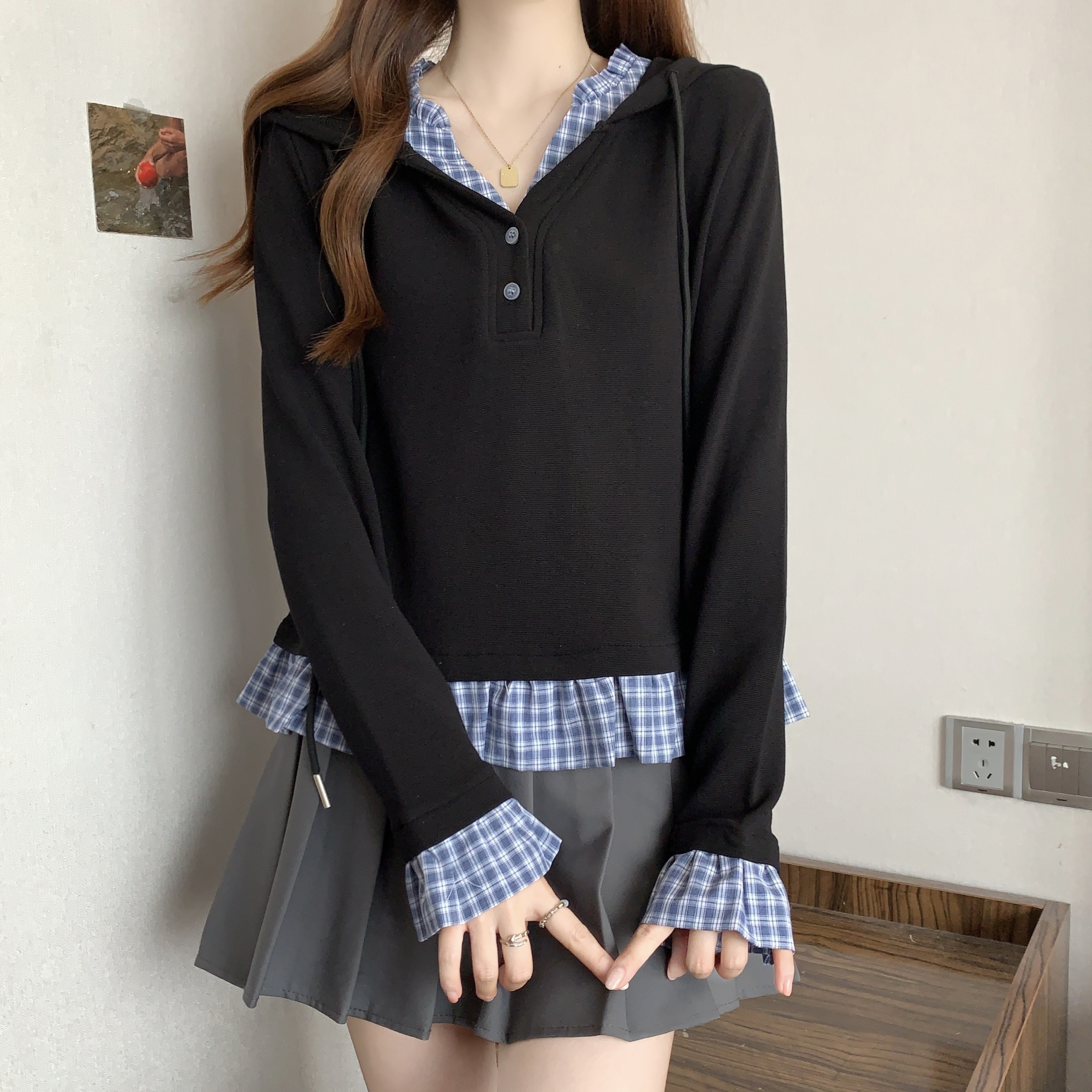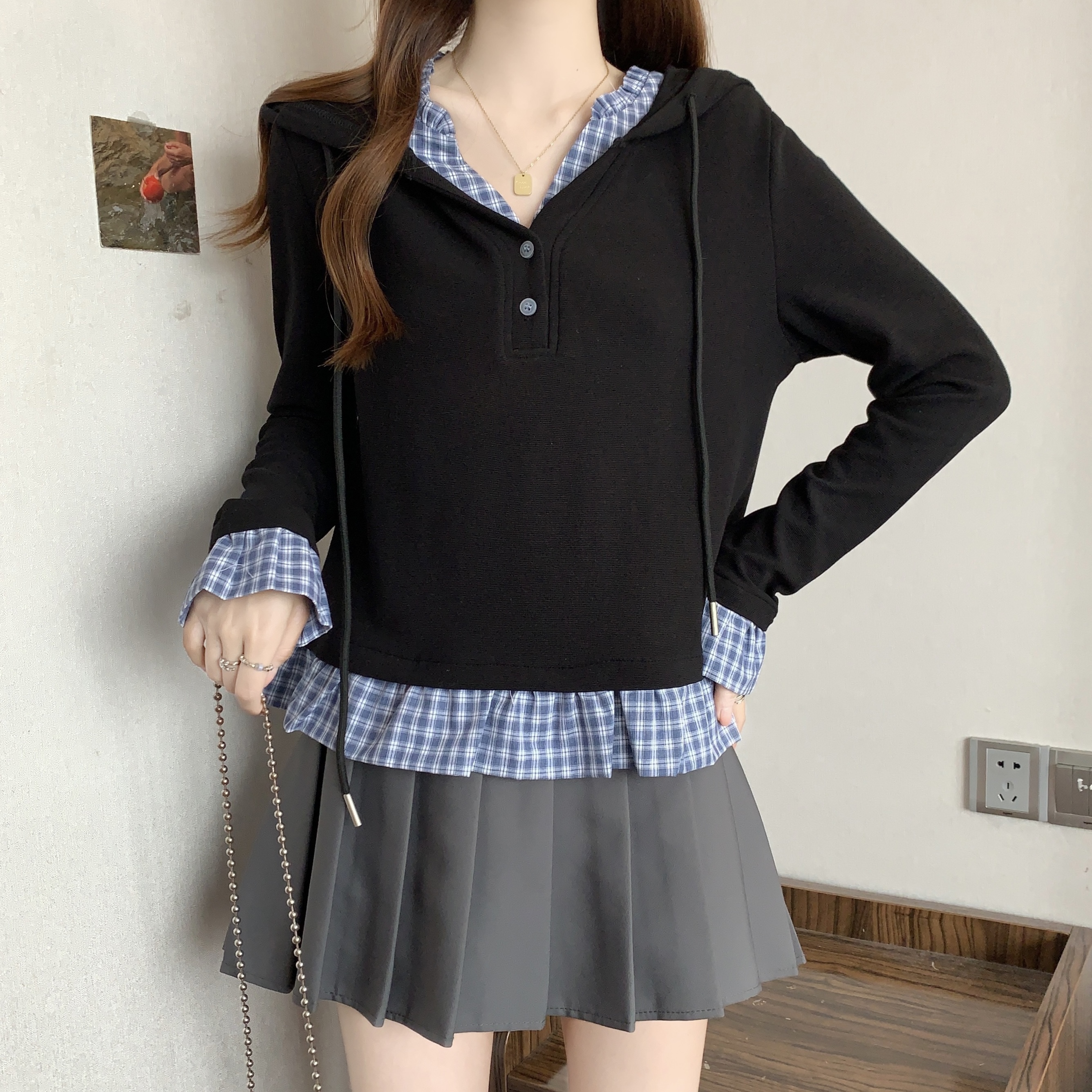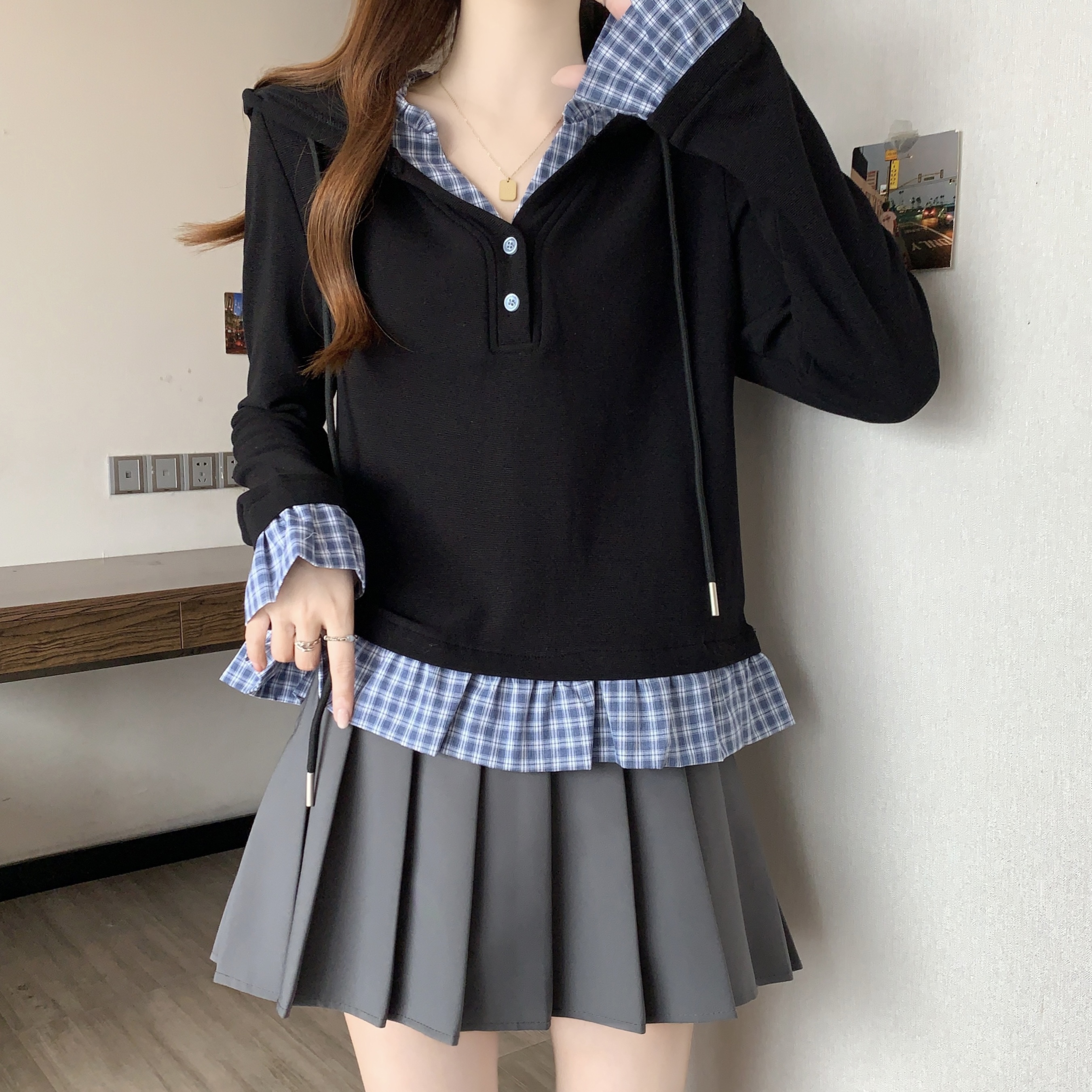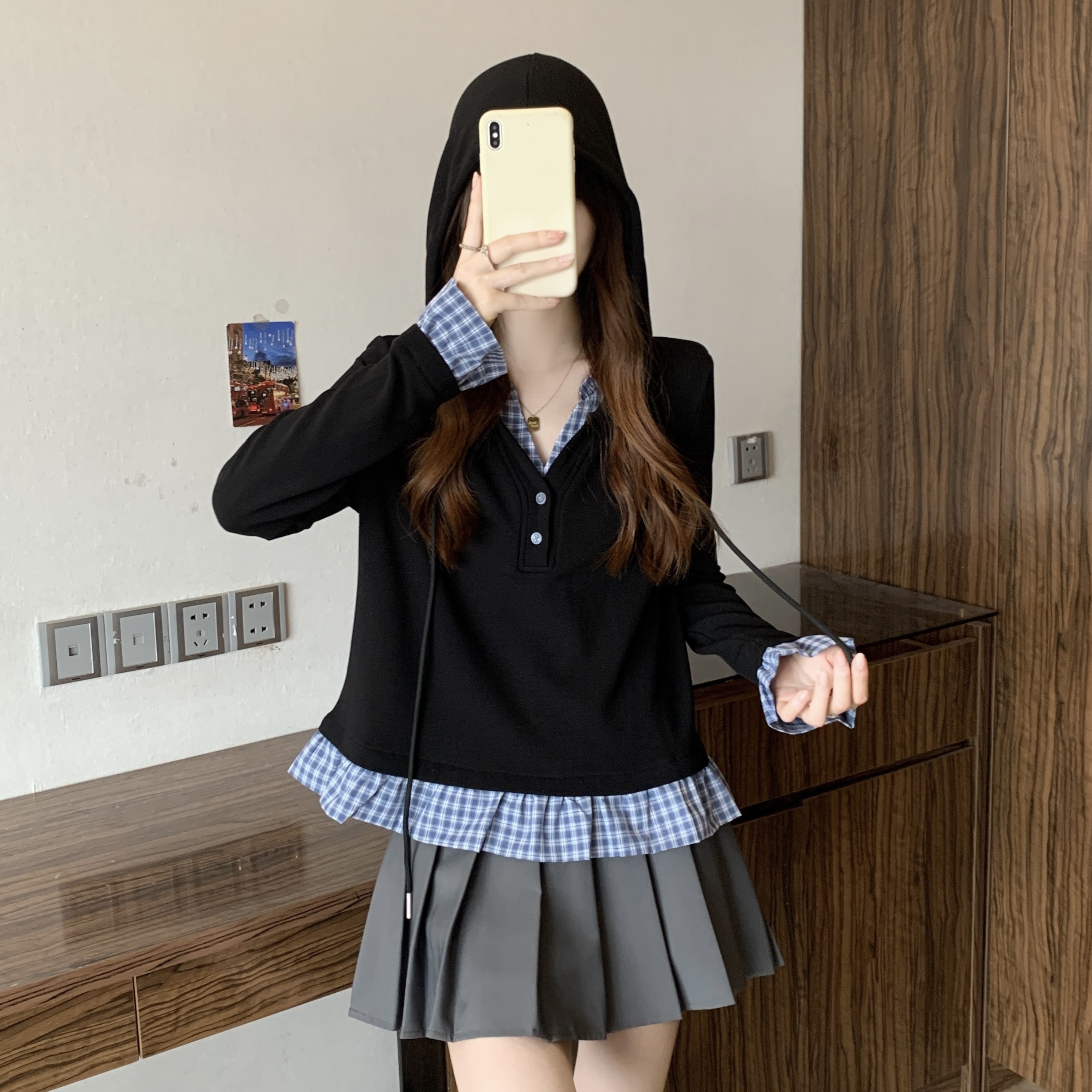 망사 비즈 박기 패치워크 페이크 레이어드 후드티 여성 지방 mm 디자인 센스 밀짚모자 소녀 루즈핏 슬림해 보이는 POLO 칼라 맨위