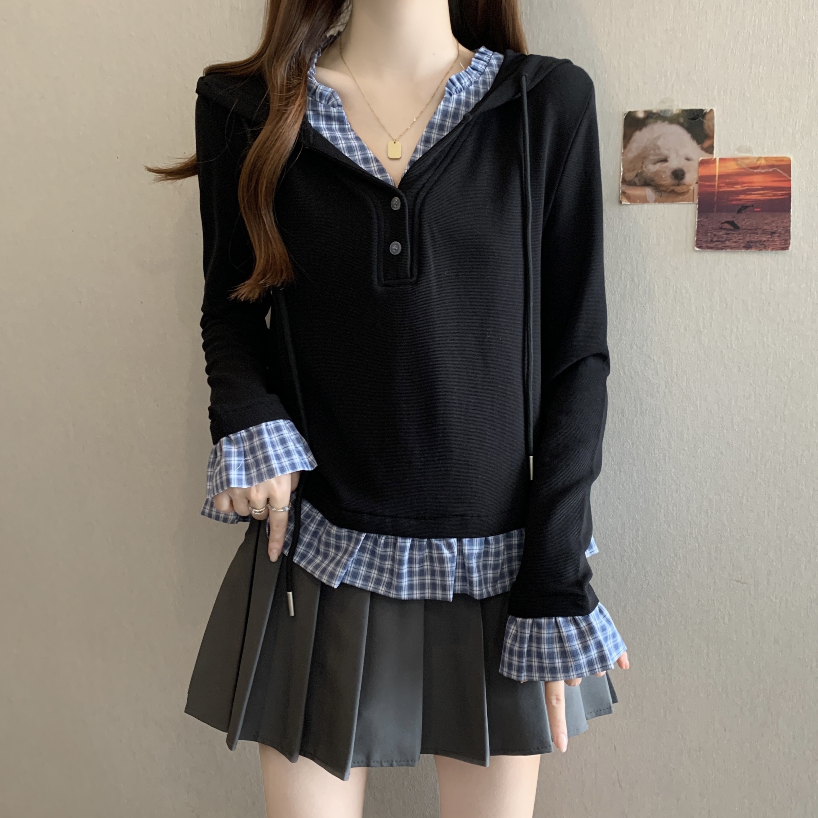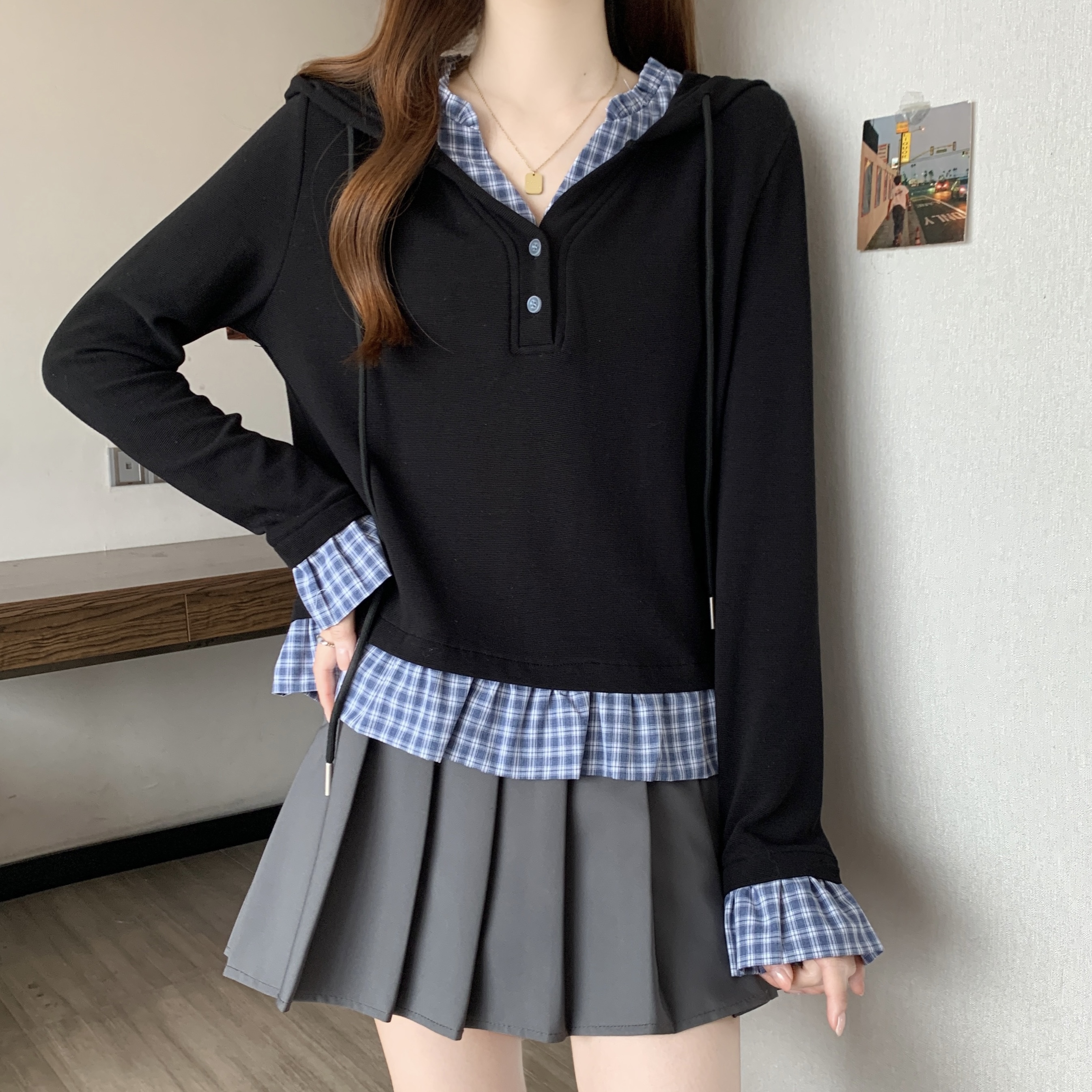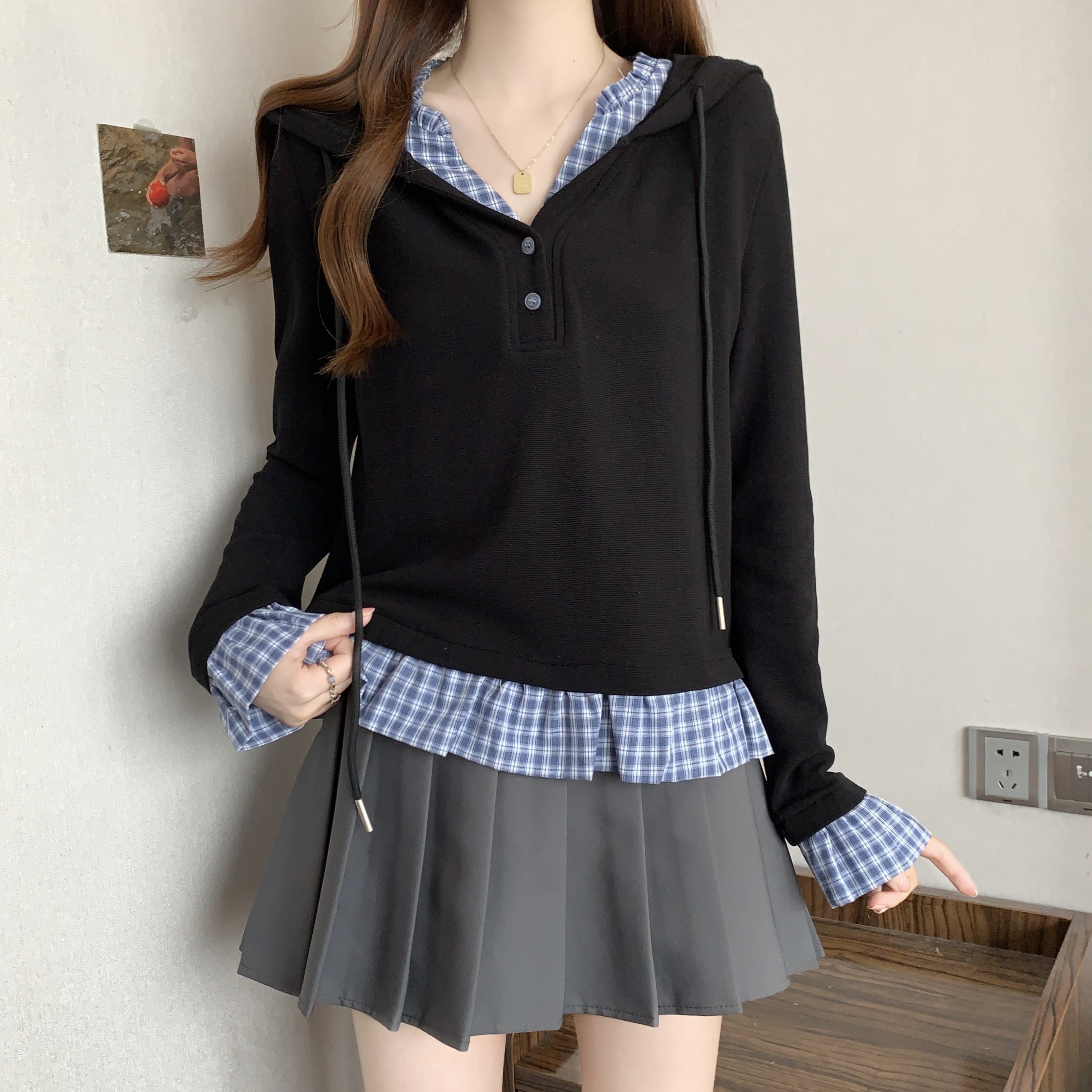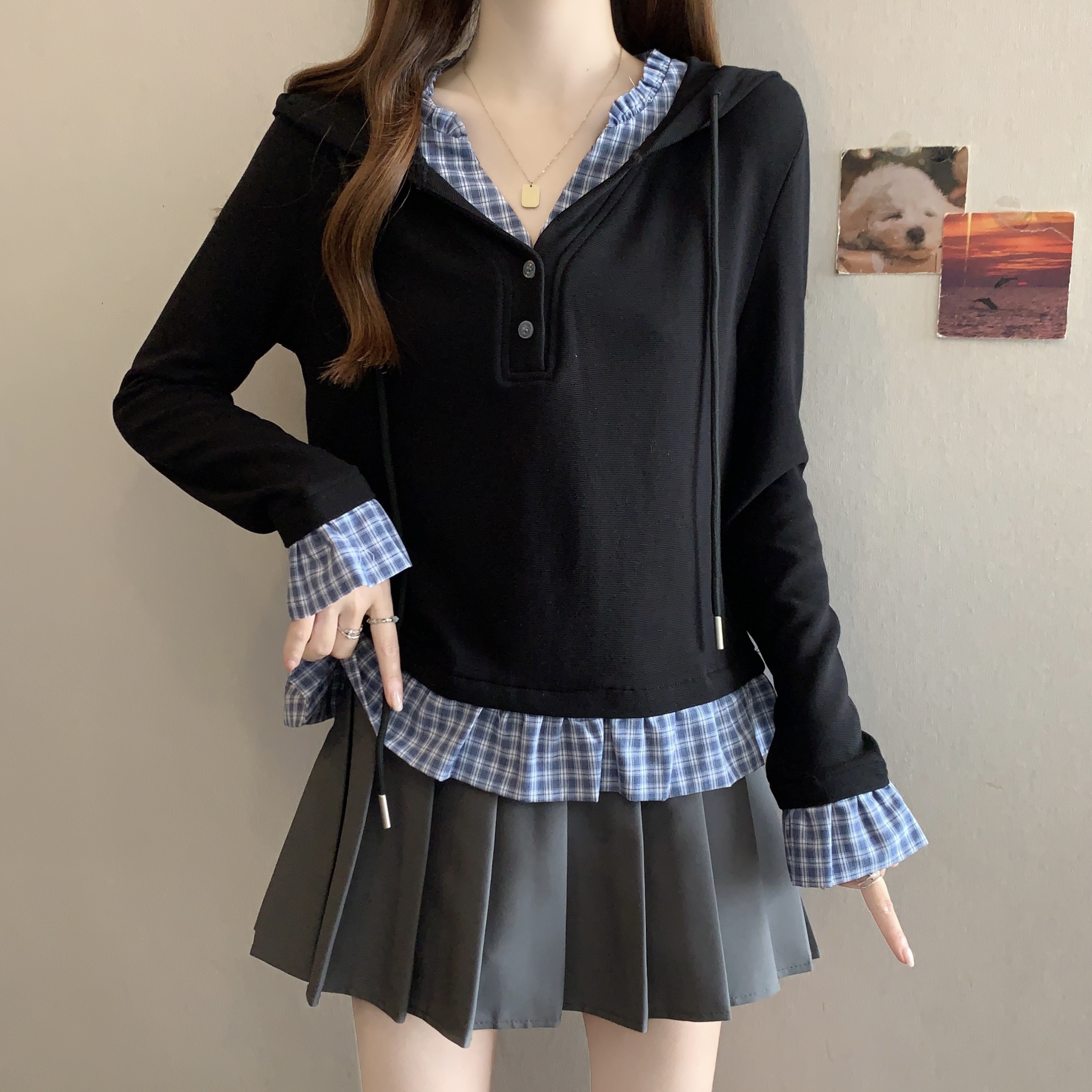 망사 비즈 박기 패치워크 페이크 레이어드 후드티 여성 지방 mm 디자인 센스 밀짚모자 소녀 루즈핏 슬림해 보이는 POLO 칼라 맨위