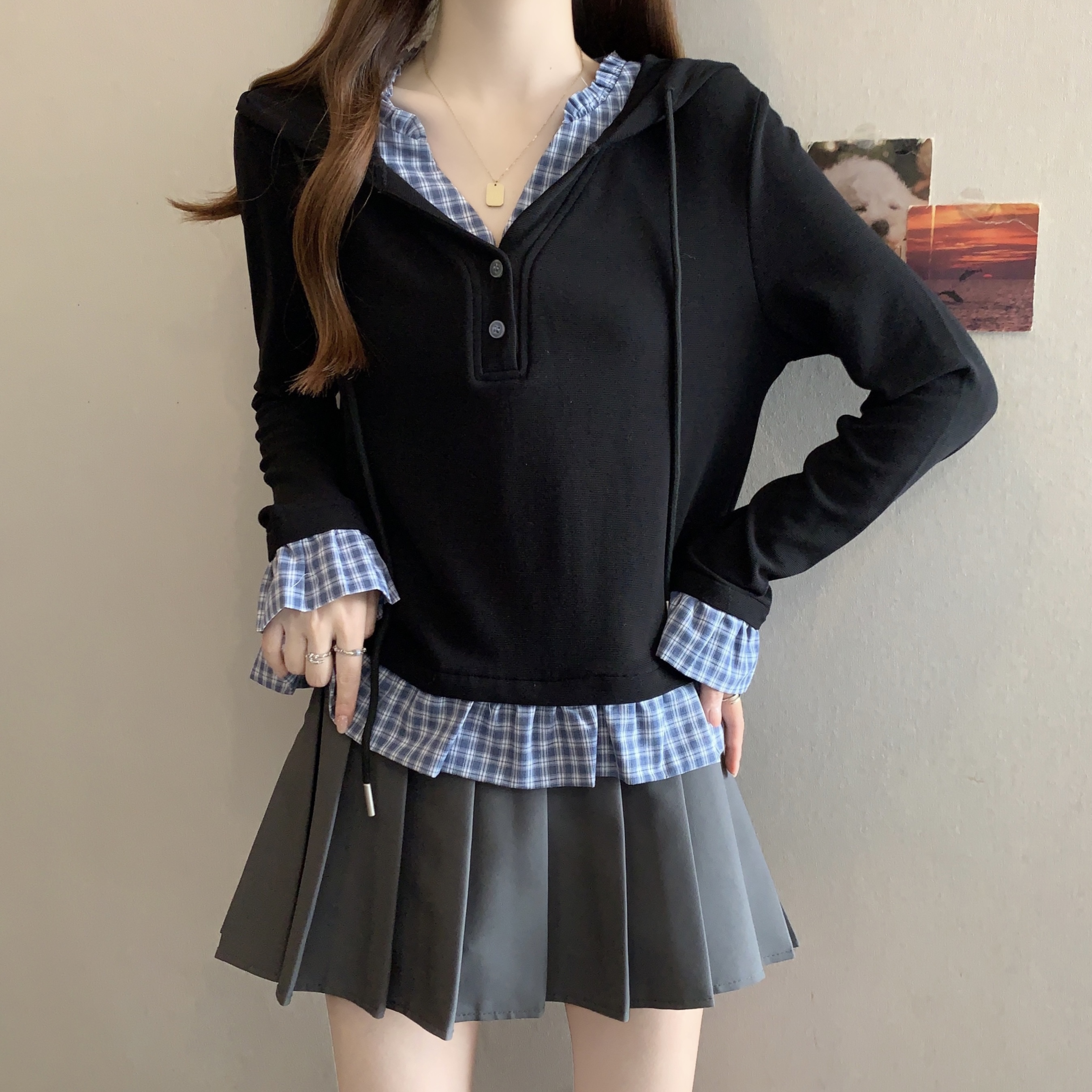 지방 mm 2026 새로운 페이크 레이어드 체크무늬 패치워크 V넥 풀오버 인사이드 가져 가라. 외출용 짧은 맨위