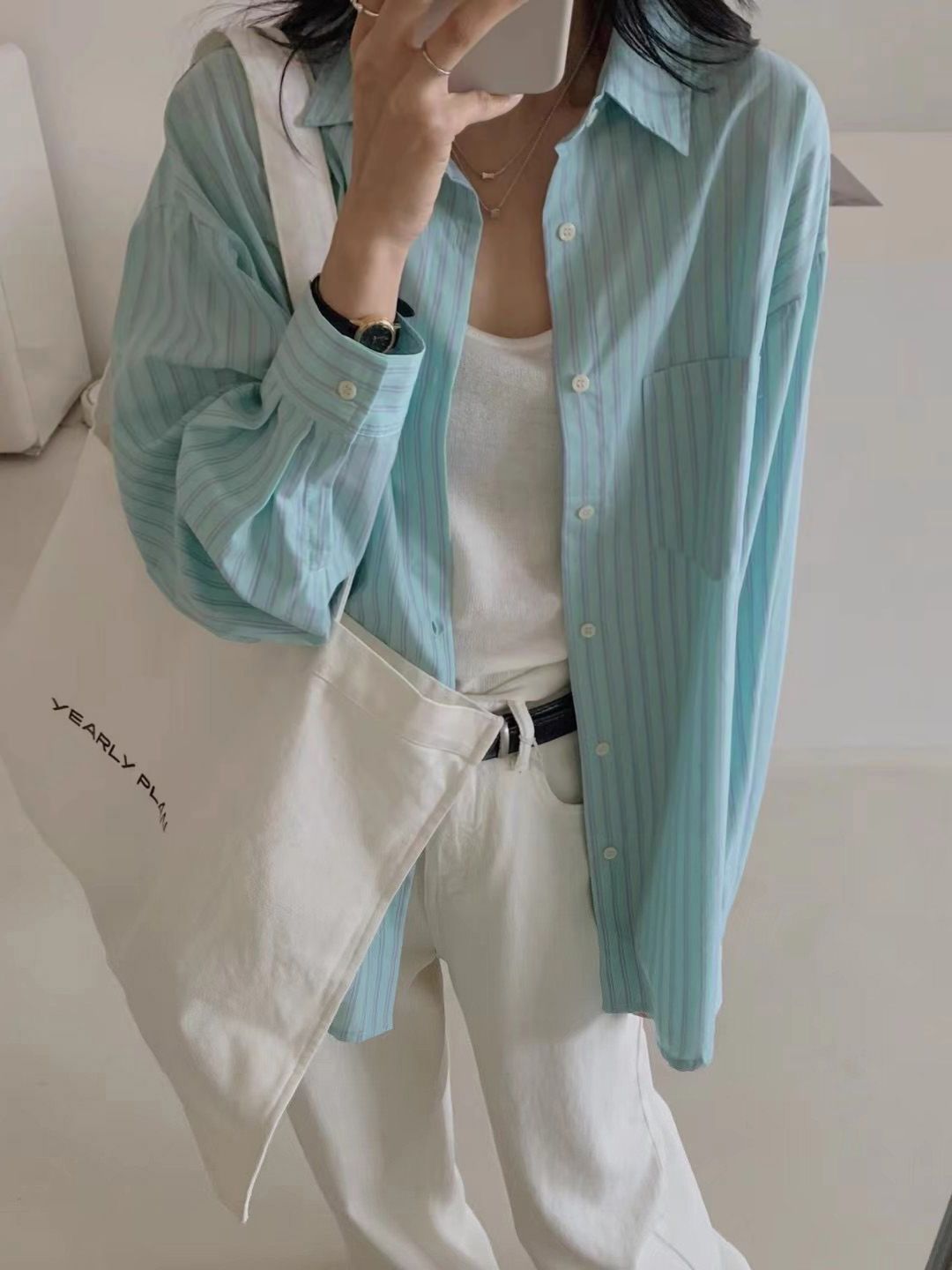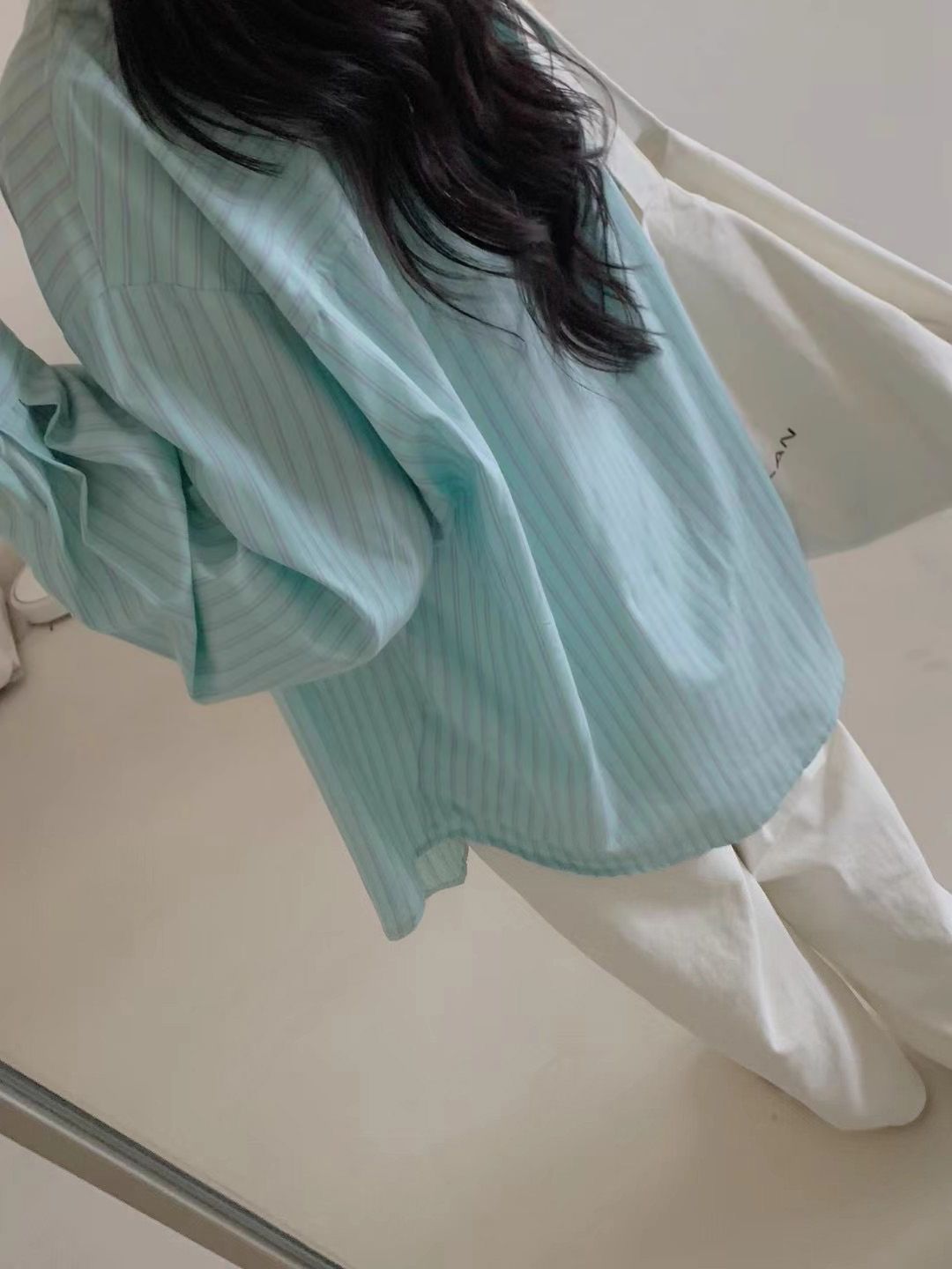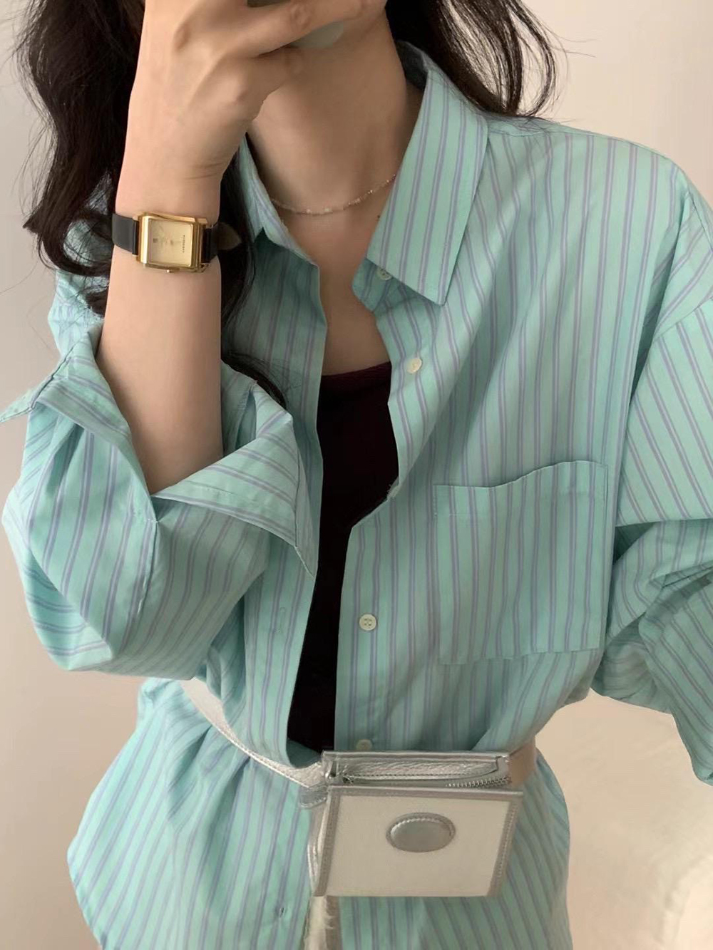박하 푸른 녹색 스트라이프 여성 셔츠 2026 년 새로운 맨위 디자인 센스 작은 대중 셔츠 재킷 봄 가을 여름