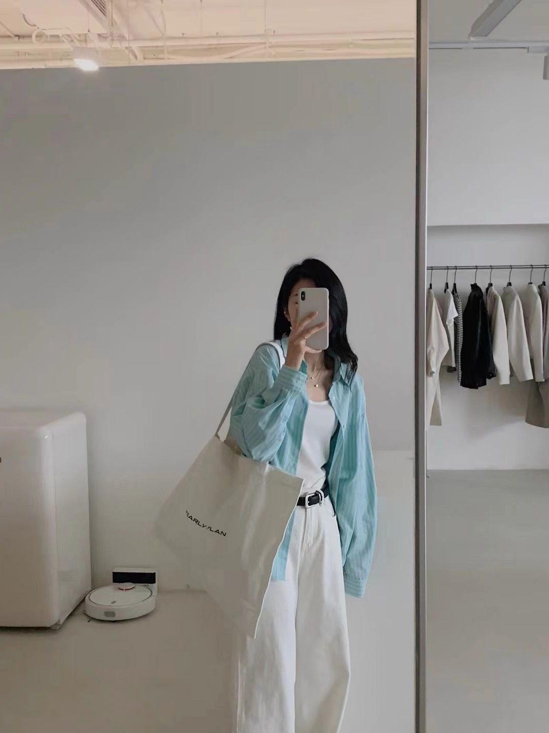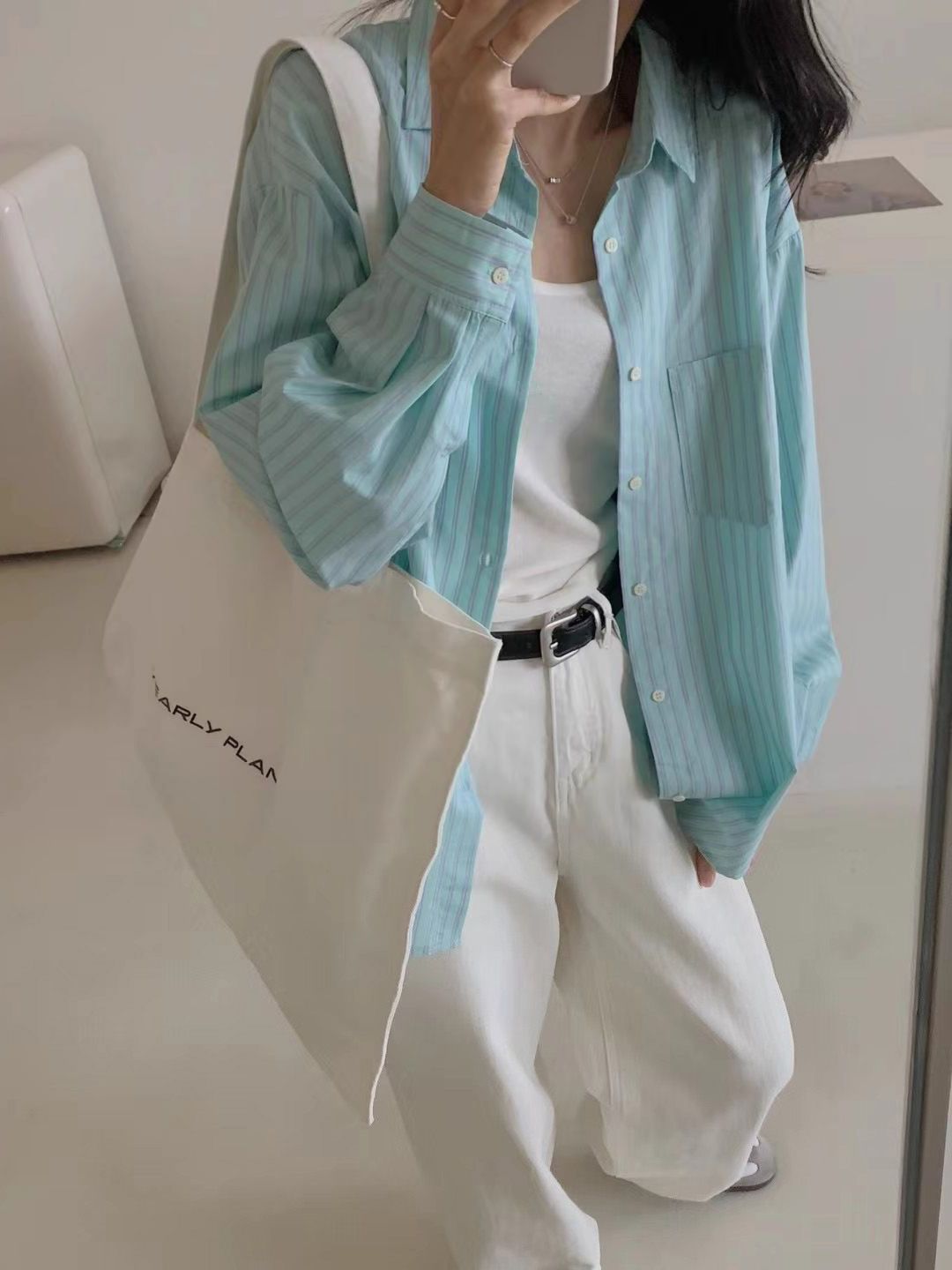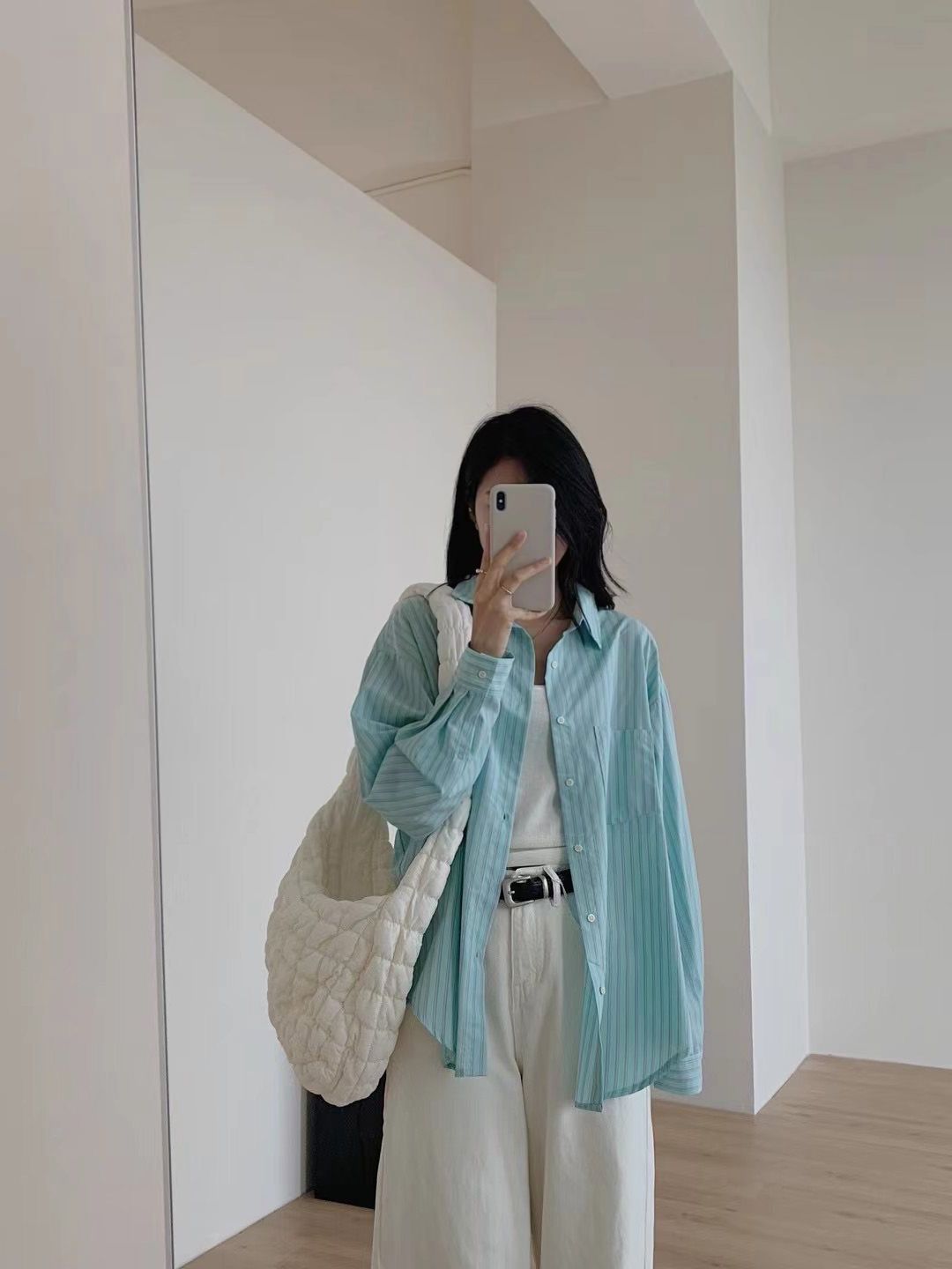 박하 푸른 녹색 스트라이프 여성 셔츠 2026 년 새로운 맨위 디자인 센스 작은 대중 셔츠 재킷 봄 가을 여름