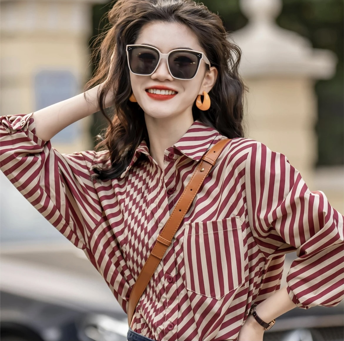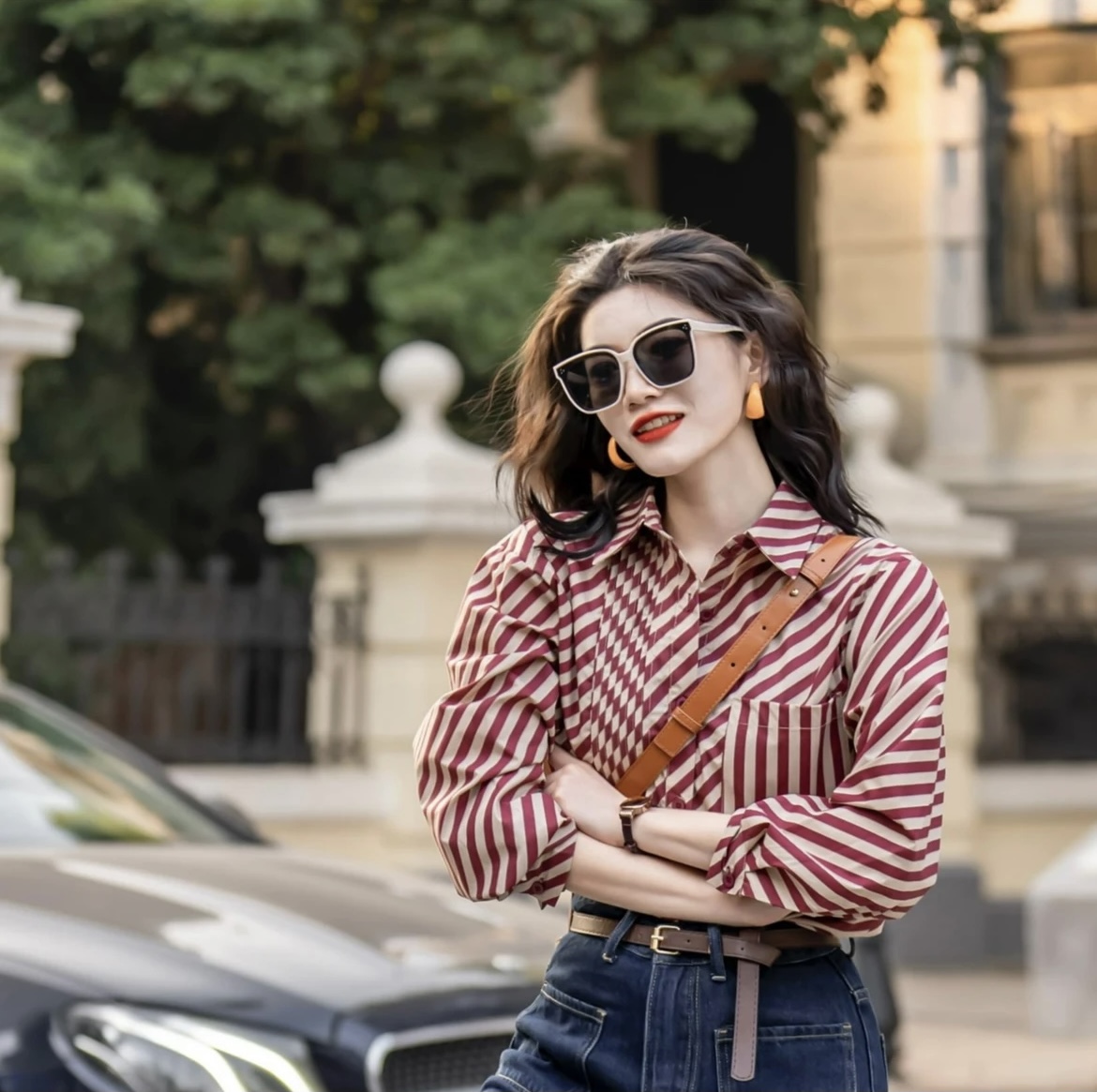 빨간색 스트라이프 여성 셔츠 2025 가을 새로운 레트로 디자인 센스 작은 대중 스택 착용 셔츠 고유 한 Chic 맨위