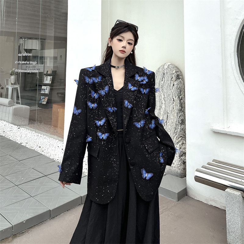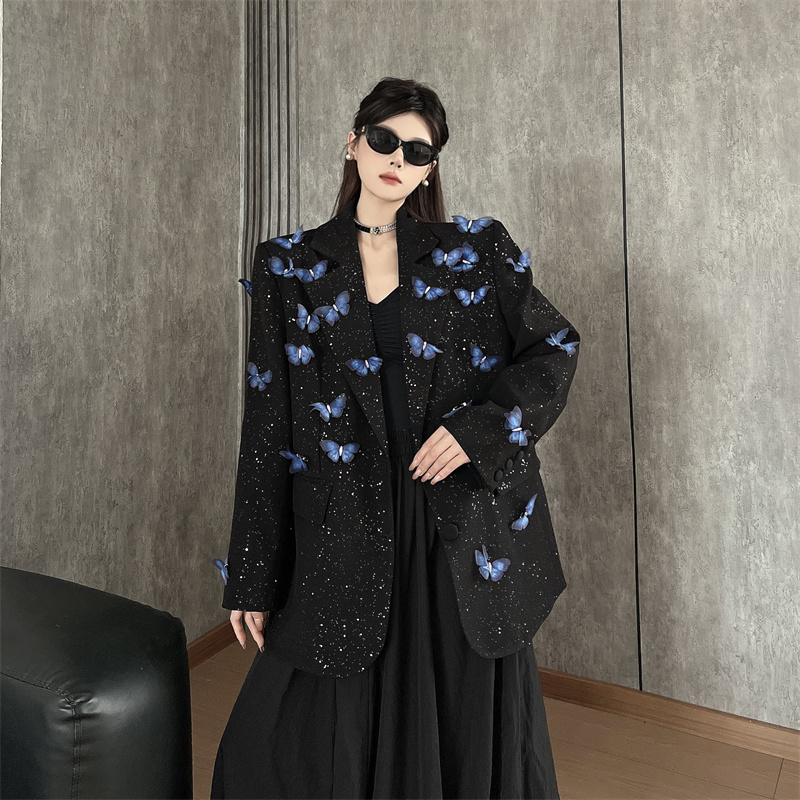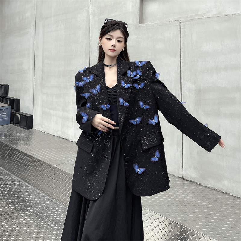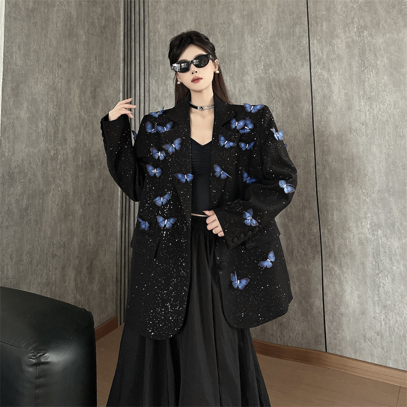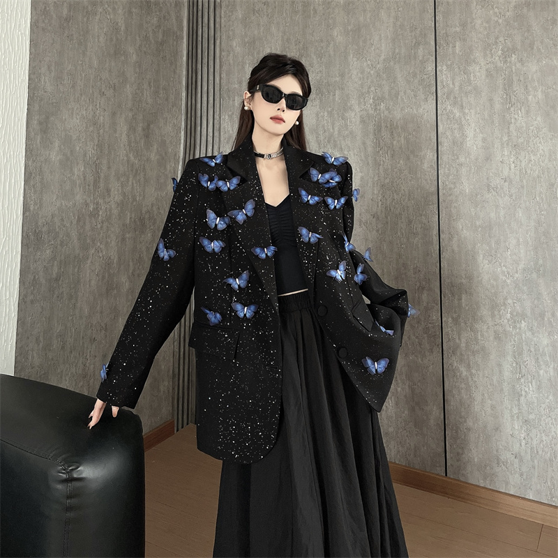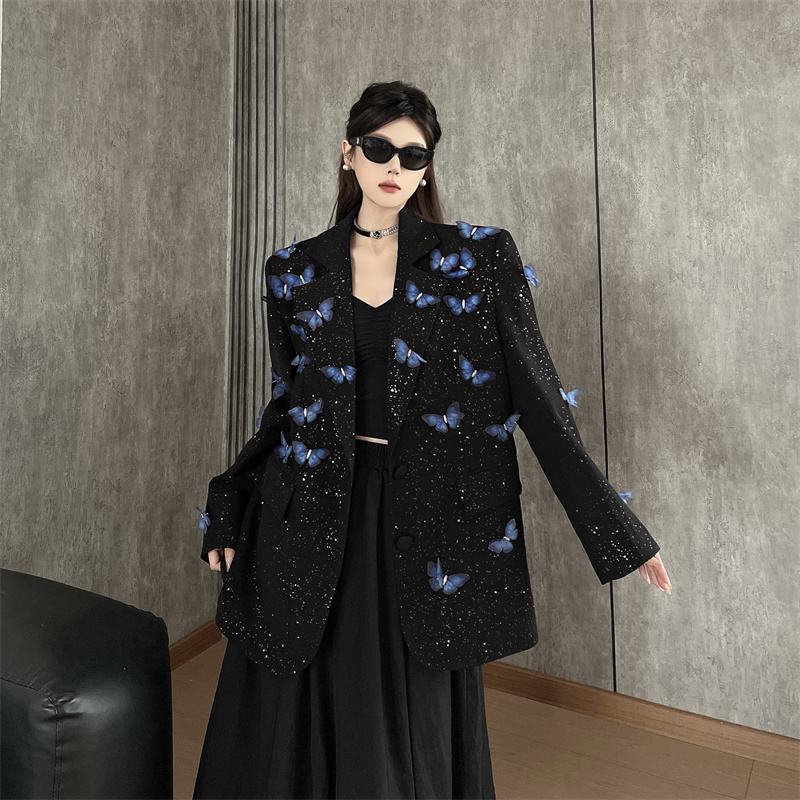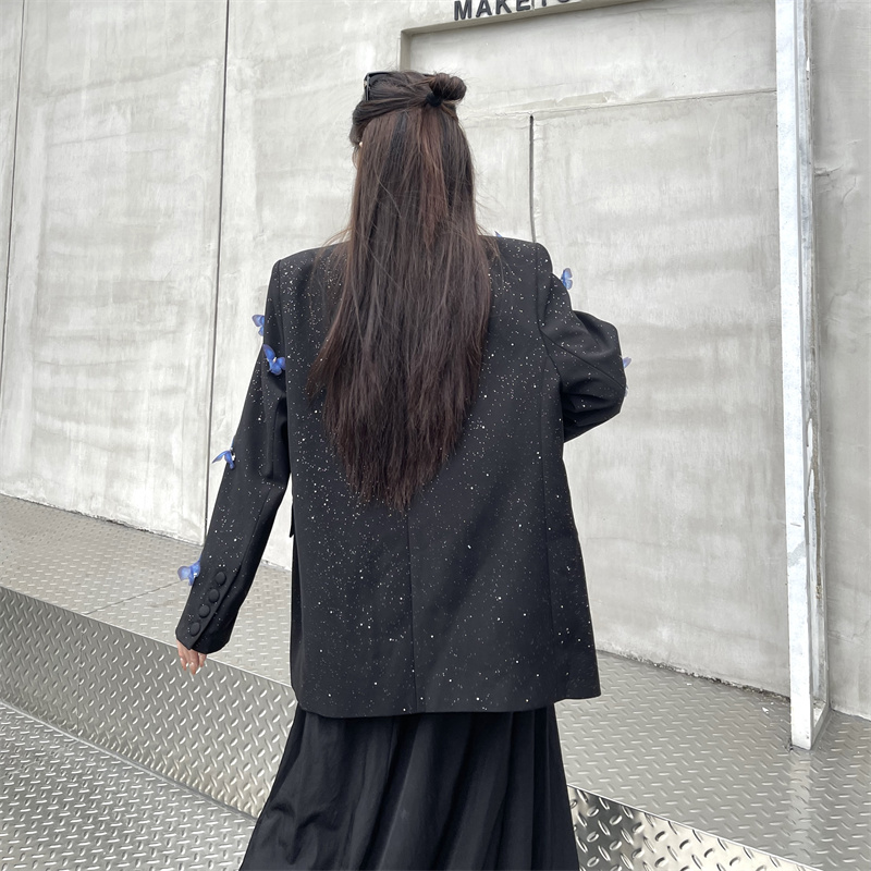 실사 Gypsophila 뿌리다 분말 디자인 센스 검정색 정장 여성 코트 다림질 금박 반짝임 고급 센스 정장 트렌디