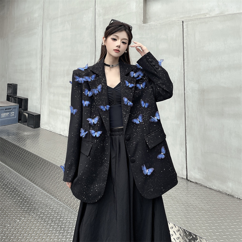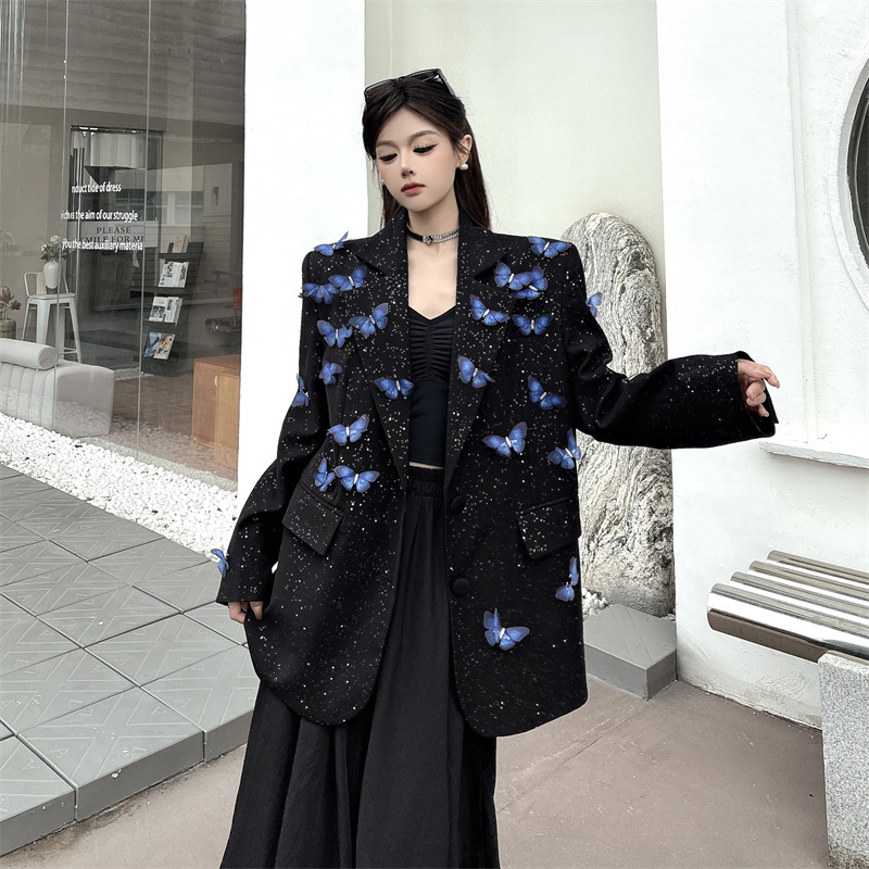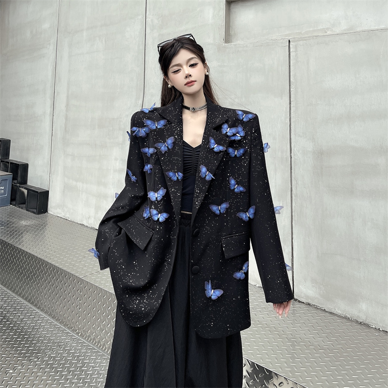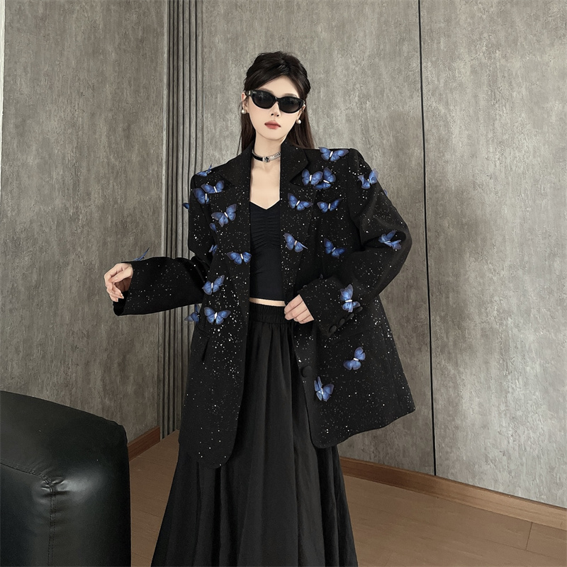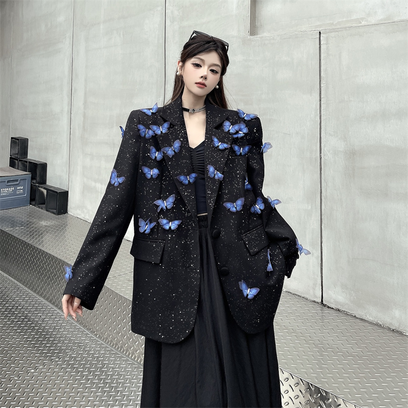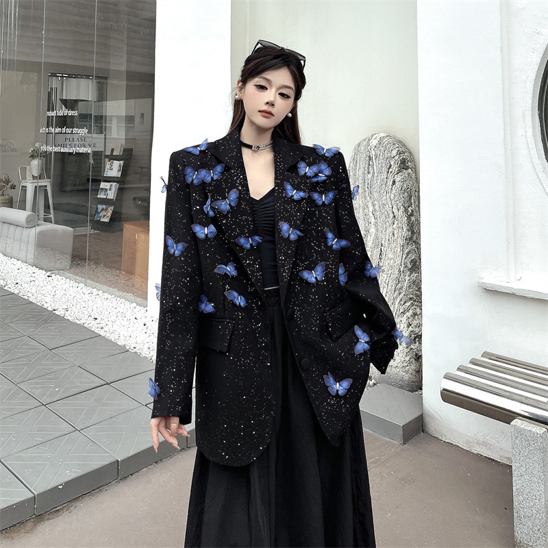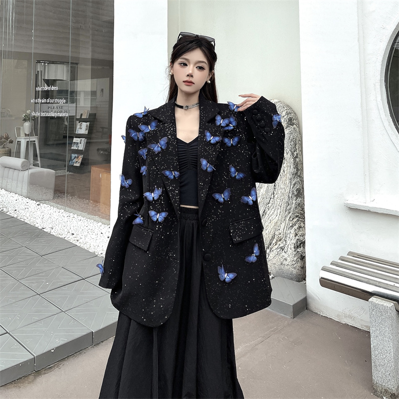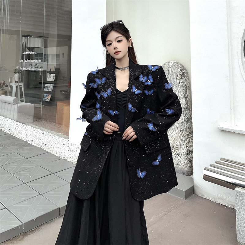 실사 Gypsophila 뿌리다 분말 디자인 센스 검정색 정장 여성 코트 다림질 금박 반짝임 고급 센스 정장 트렌디