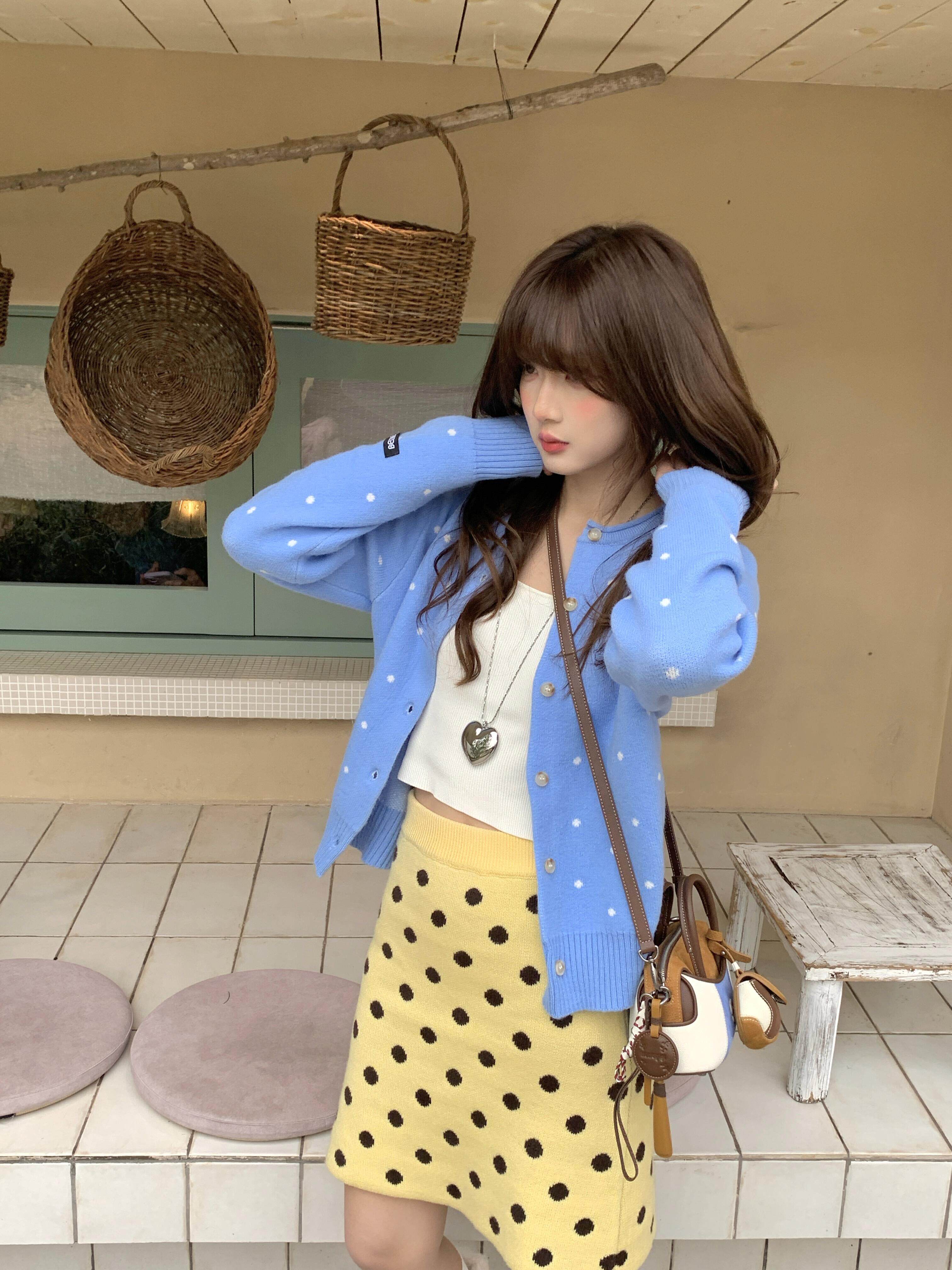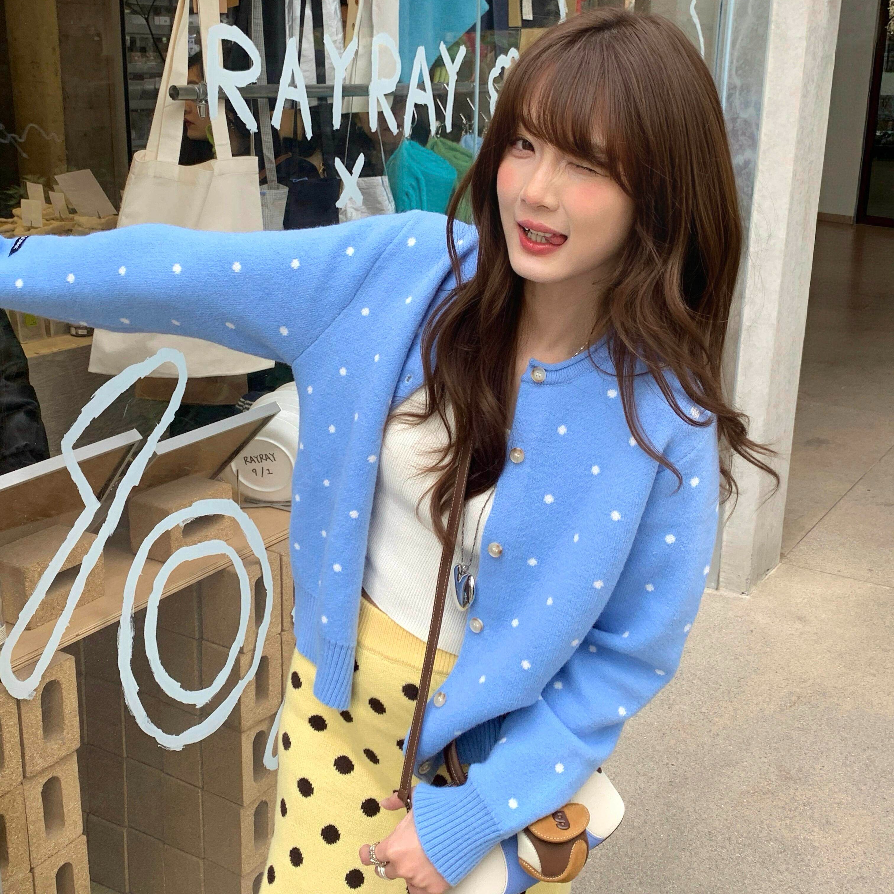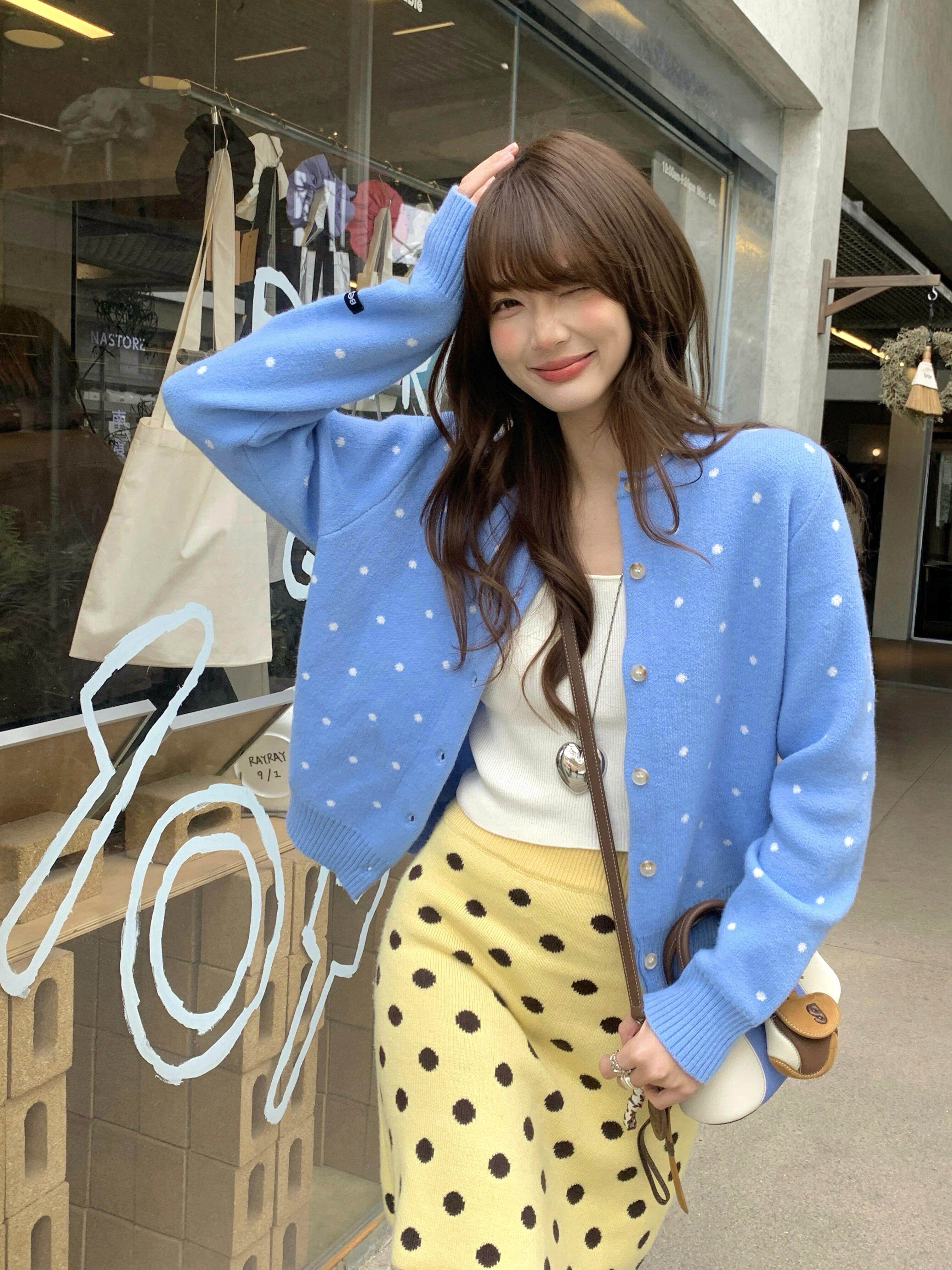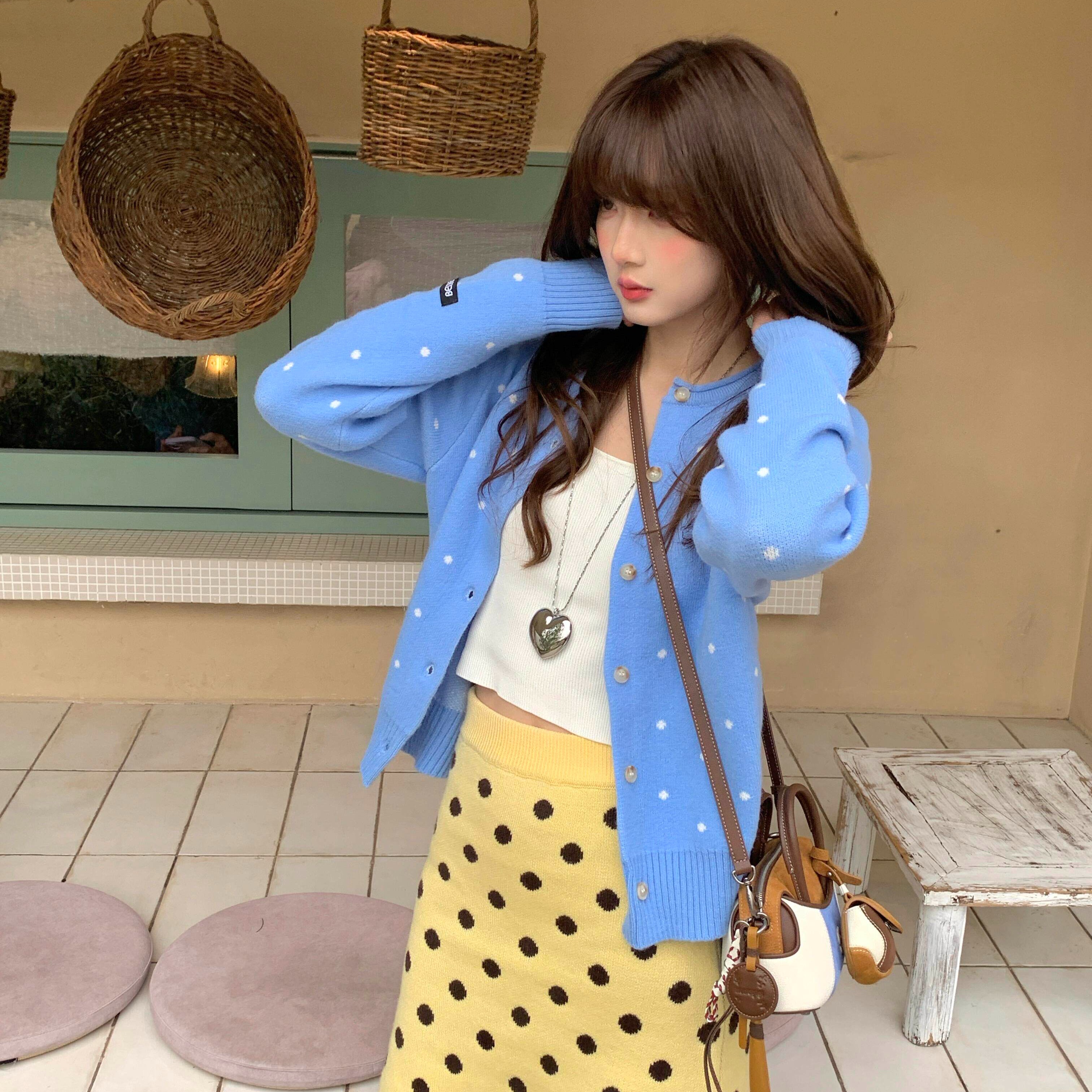 한 부서 레트로 도트 무늬 파란색 니트 오픈 가디건 여성 봄 느긋한 바람 다용도 슬림해 보이는 맨위