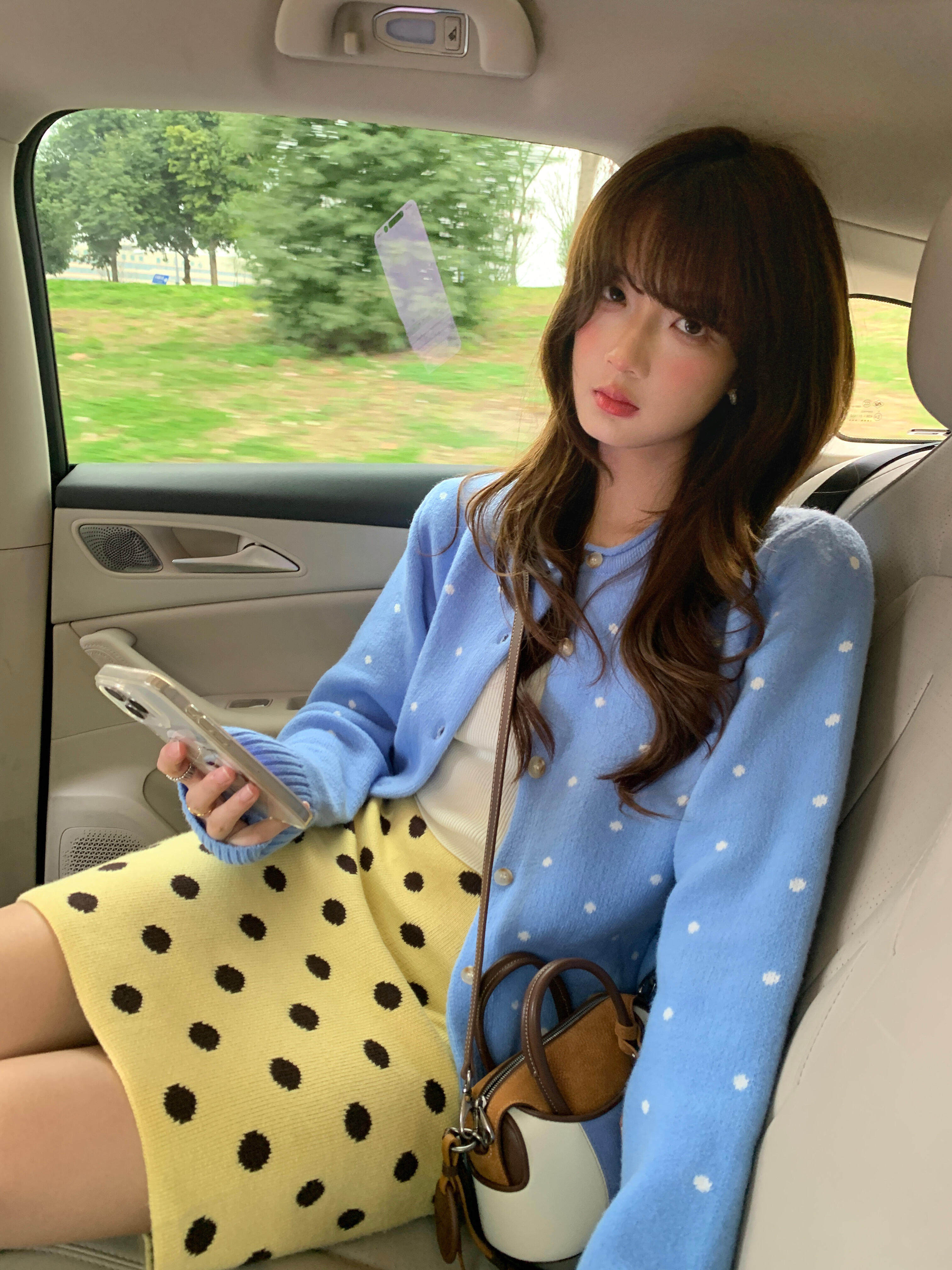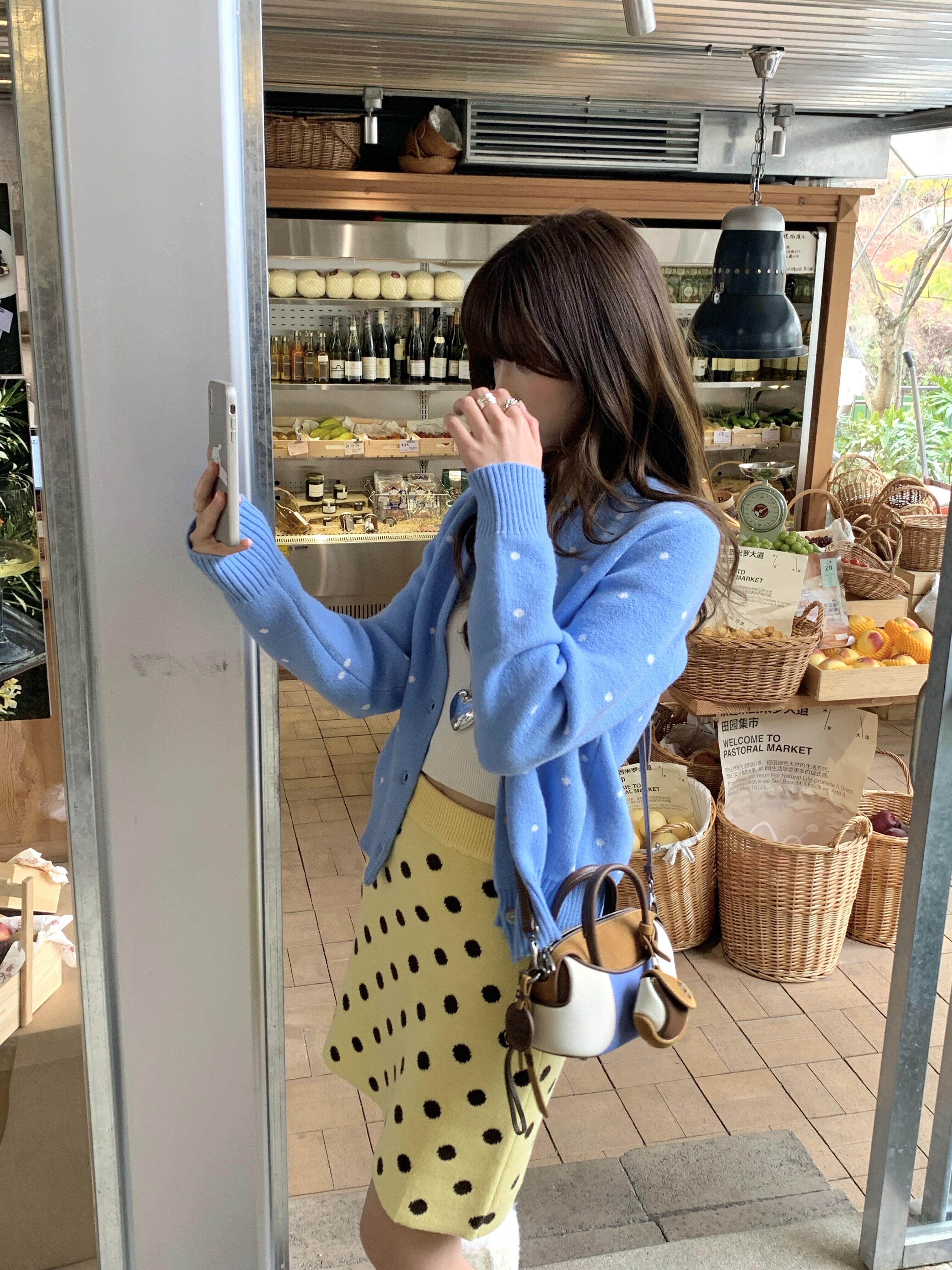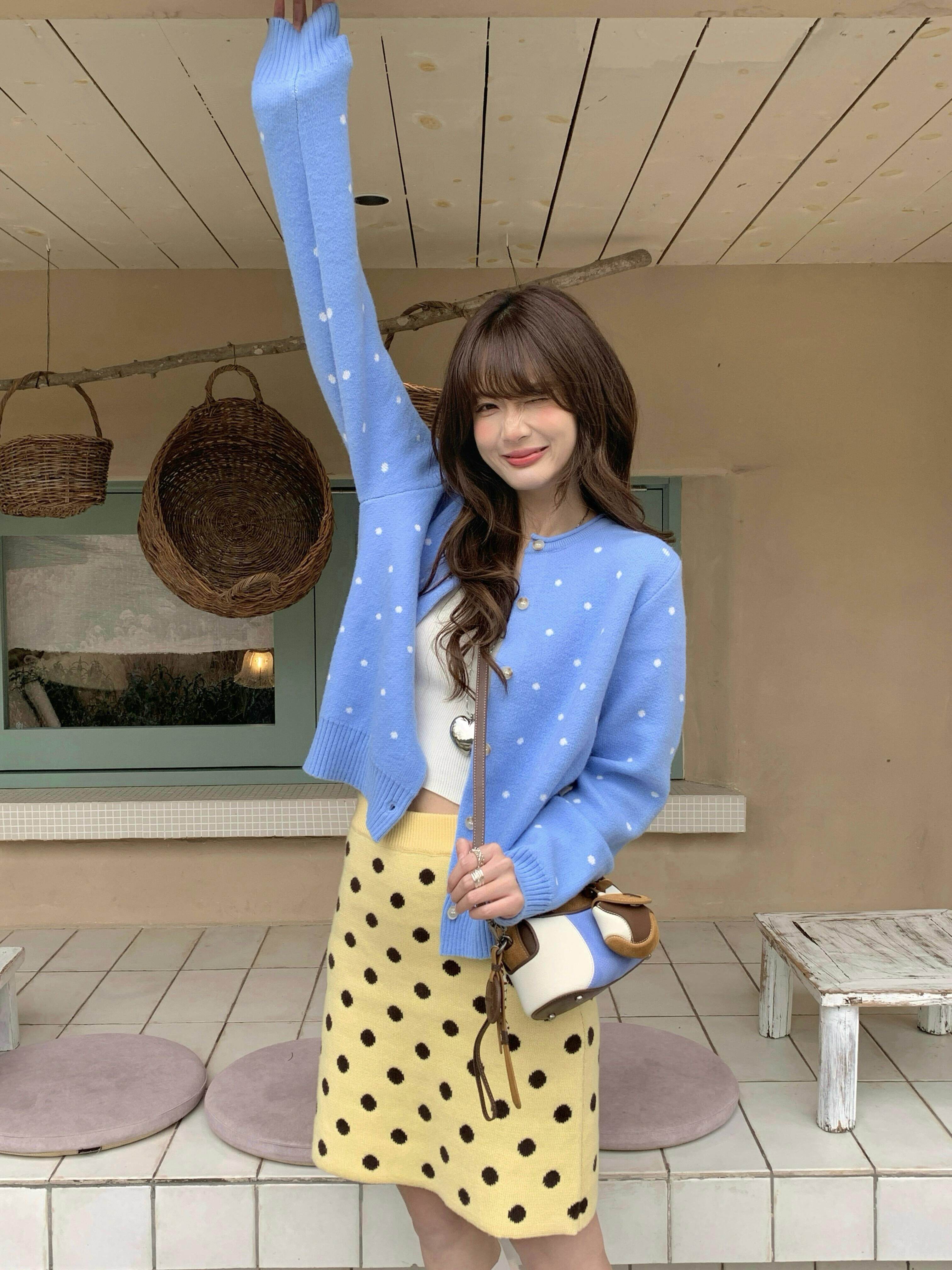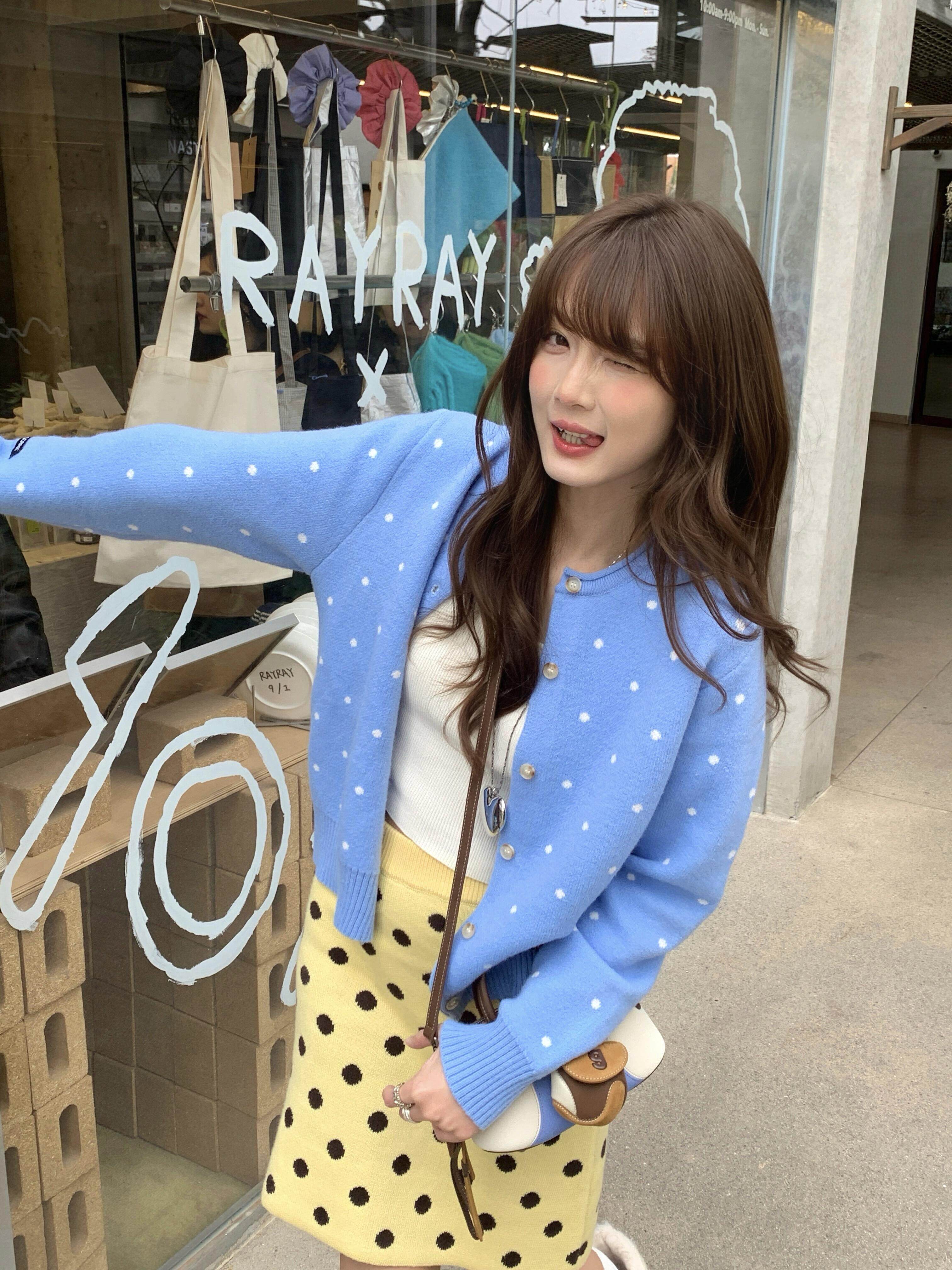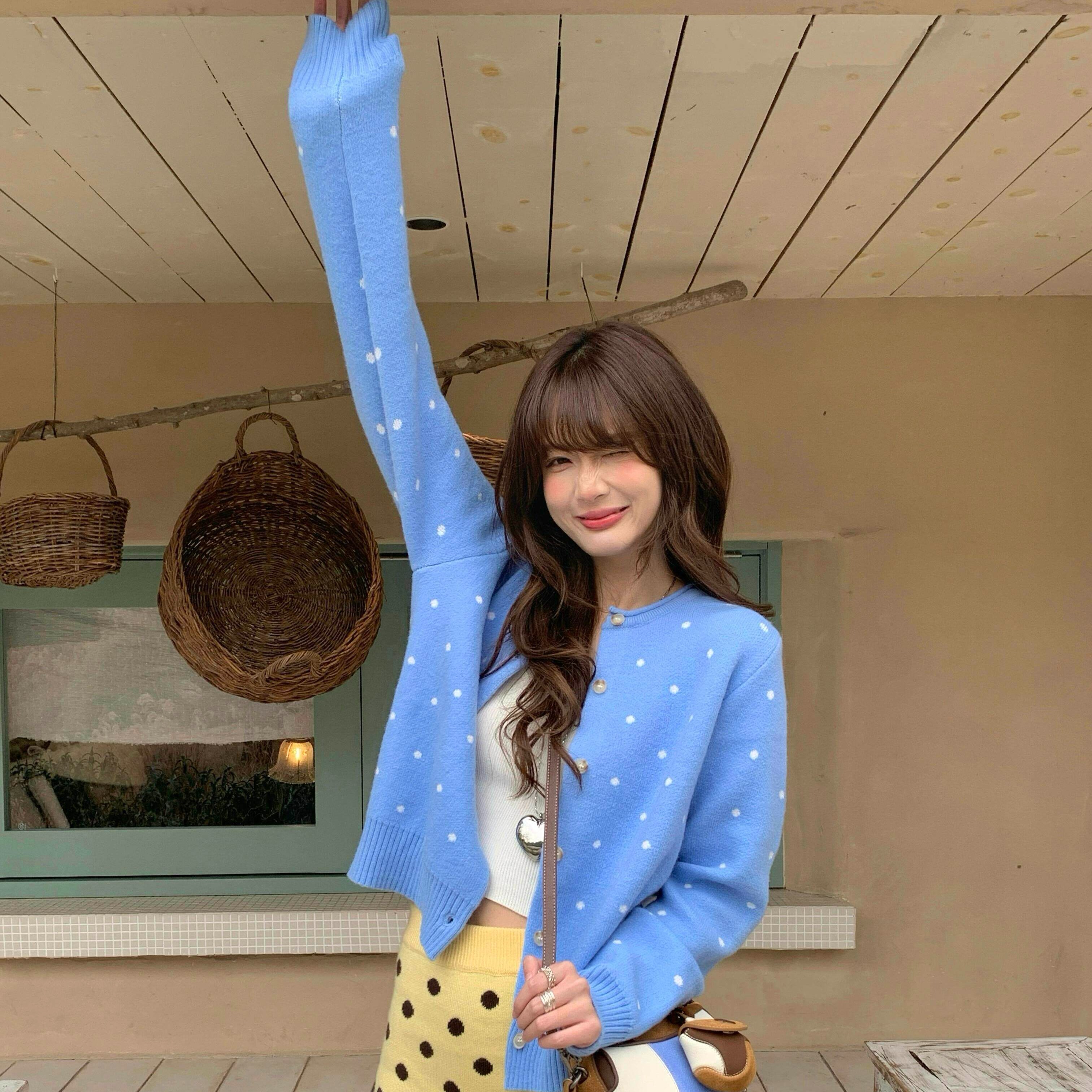 한 부서 레트로 도트 무늬 파란색 니트 오픈 가디건 여성 봄 느긋한 바람 다용도 슬림해 보이는 맨위