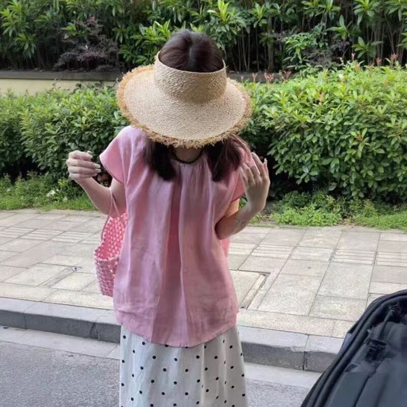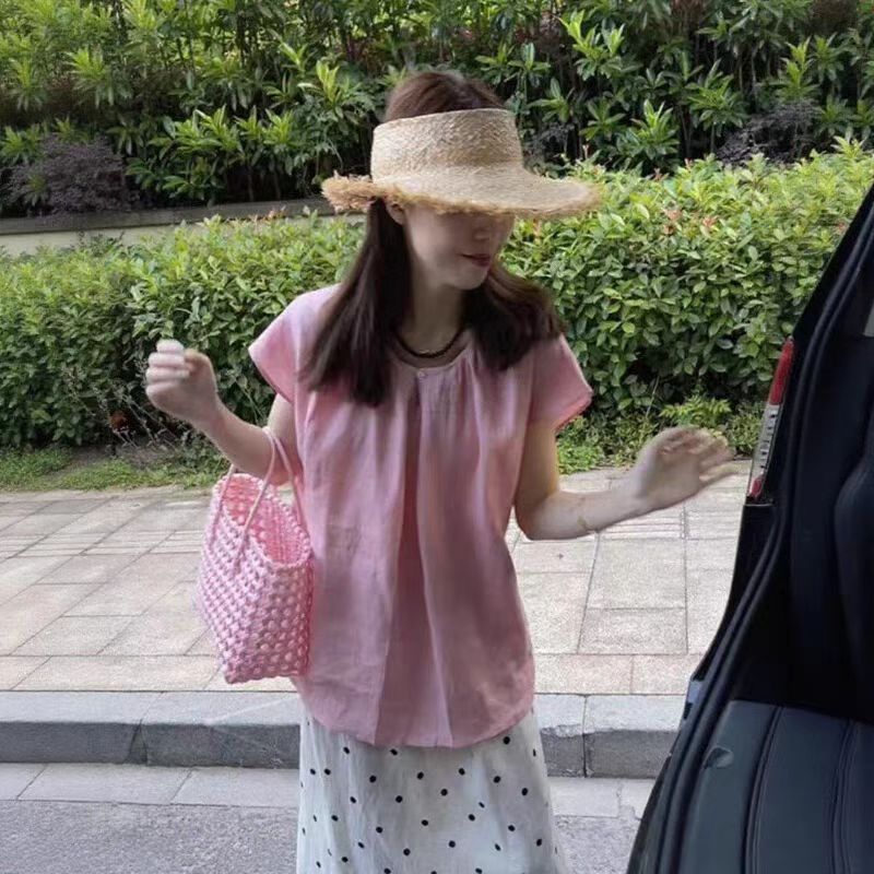 2026 노크 아름다운 핑크색 디자인 센스 라운드 넥 단추 한 알 주름 디스플레이 얇고 작은 날다 소매 셔츠