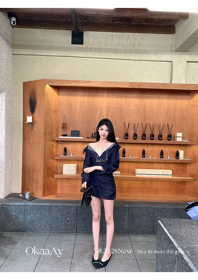 프랑스식 오프숄더 데님 긴팔 여성 드레스 이른 봄 순수한 욕망 섹시함 허리 수축 슬림해 보이는 몸매 가꾸기 타이트 스커트 짧은 치마
