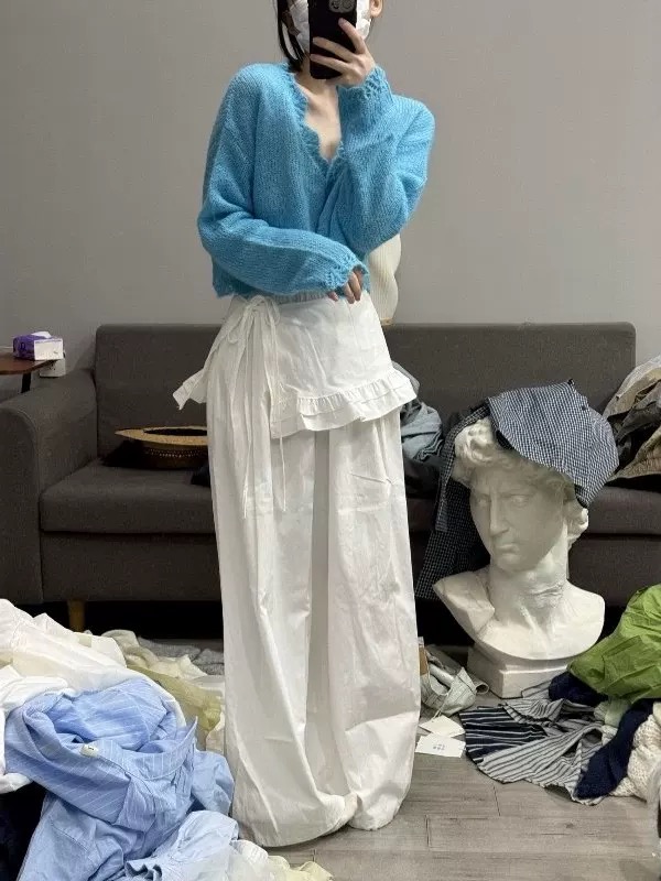 한 부서 캐주얼 바람 품격 파란색 쇼트 스타일 니트 오픈 가디건 여자 2026 봄 새로운 하이웨이스트 와이드 레그 팬츠 세트