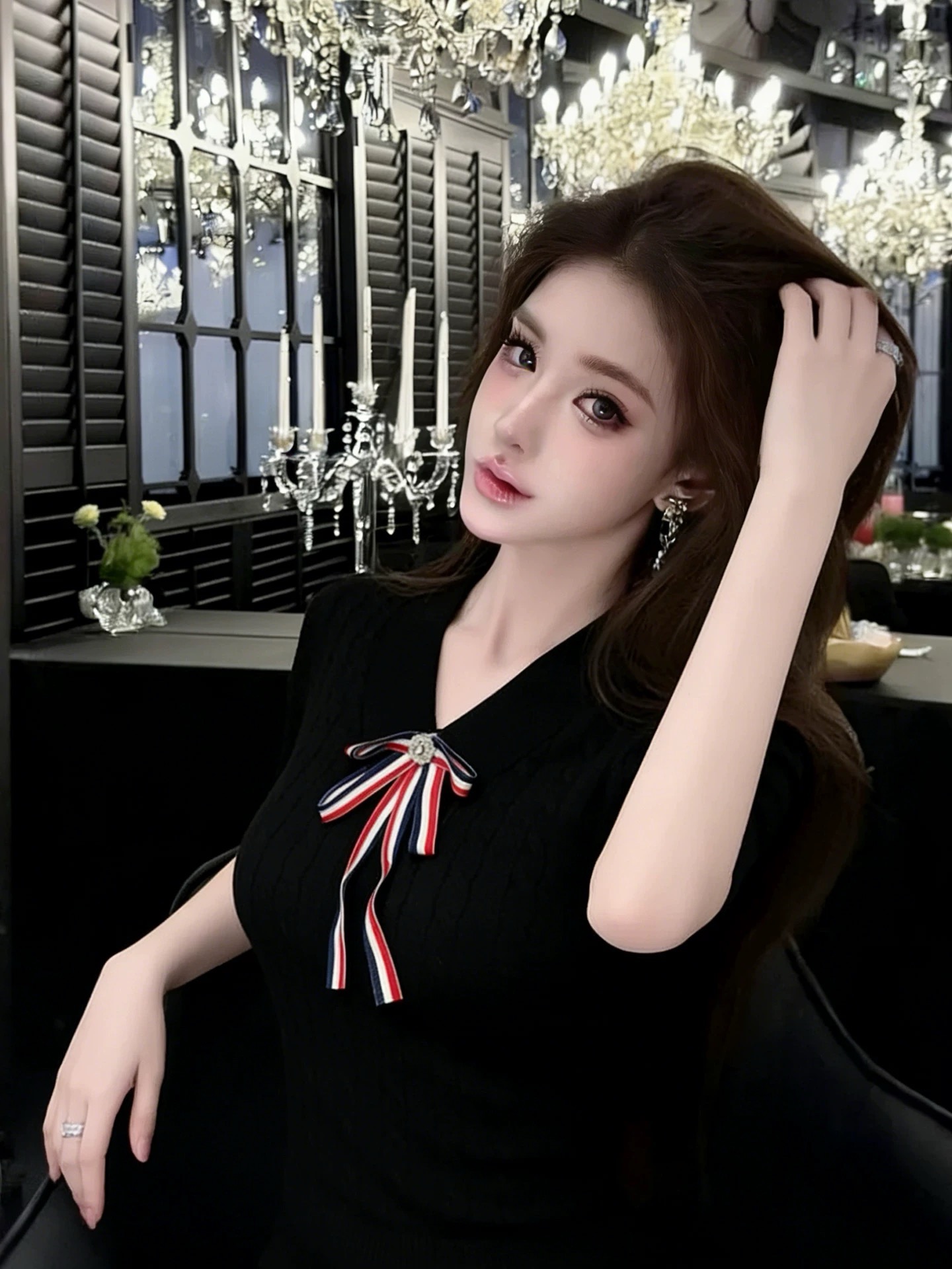 작은 샤넬 스타일 나비 매듭 V넥 니트 스웨터 여성 연령 감소 외국 가스 여름 새로운 반팔 몸매 가꾸기 슬림해 보이는 다용도 맨위