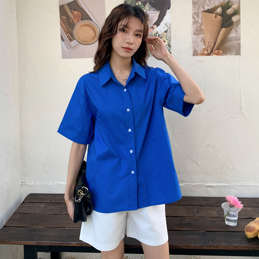 실사 파란색 루즈핏 체크무늬 반팔 여성 셔츠 여름 미니멀리즘 품격 한국 스타일 다용도 셔츠