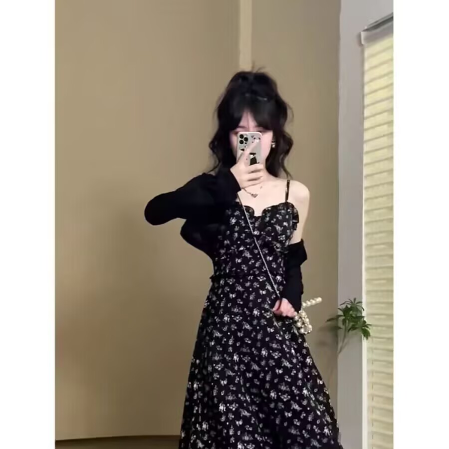 2026 새로운 차 휴식 프랑스식 쉬폰 작은 어린이 길이 치마 검정색 꽃무늬 슬립 드레스 투피스 슈트 여성 여름