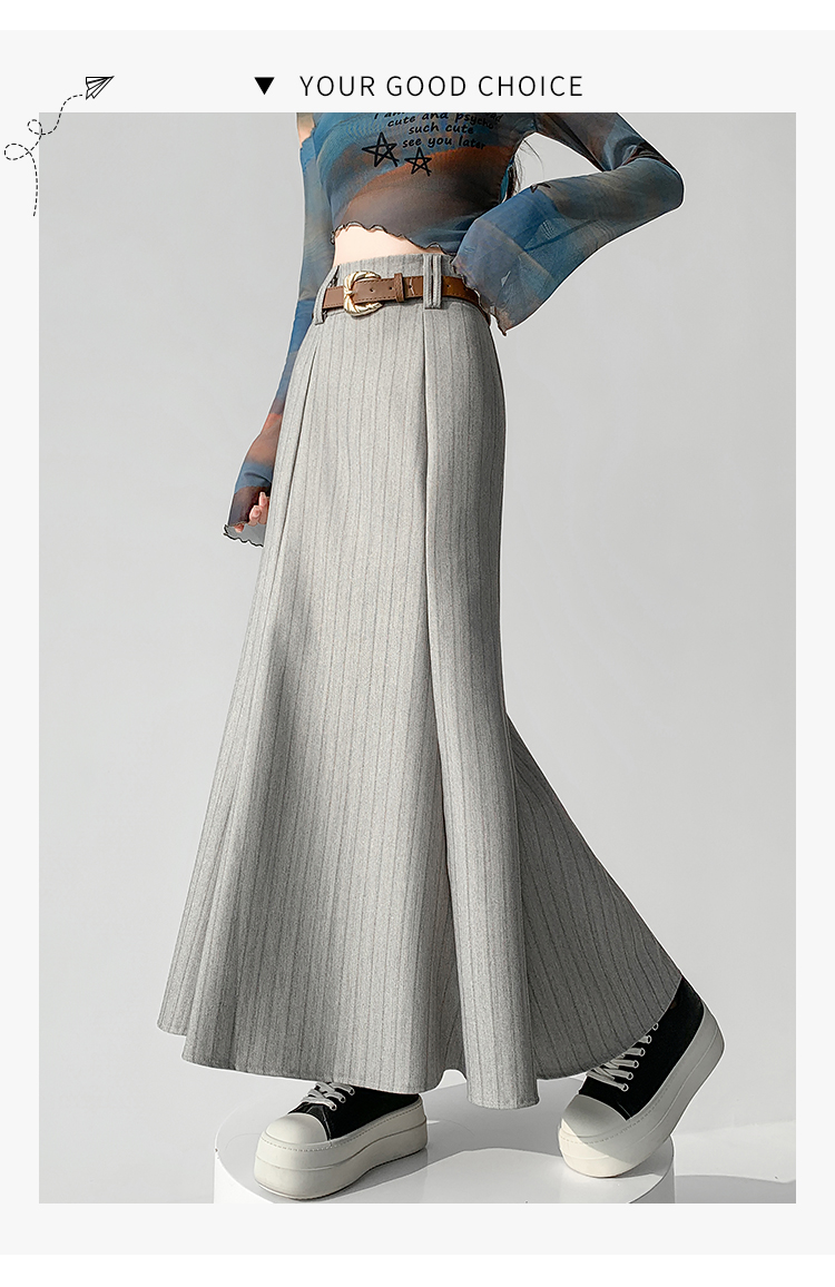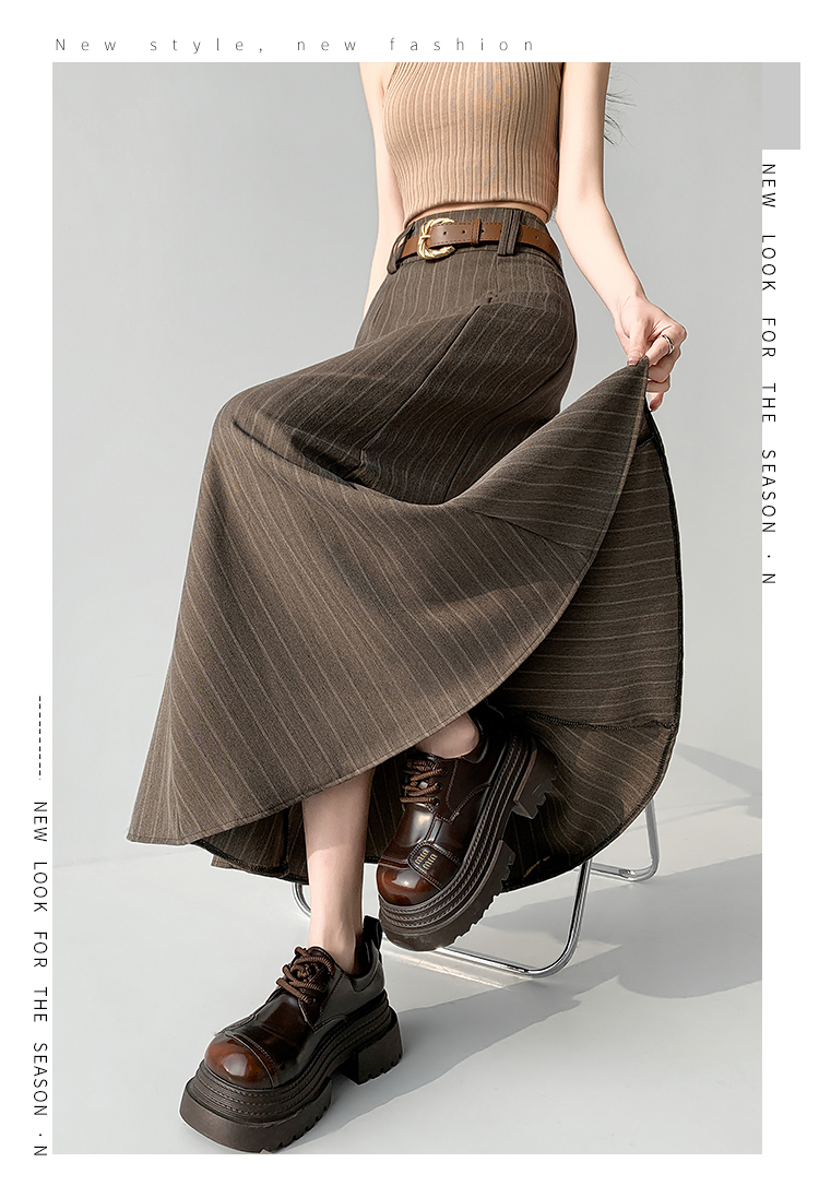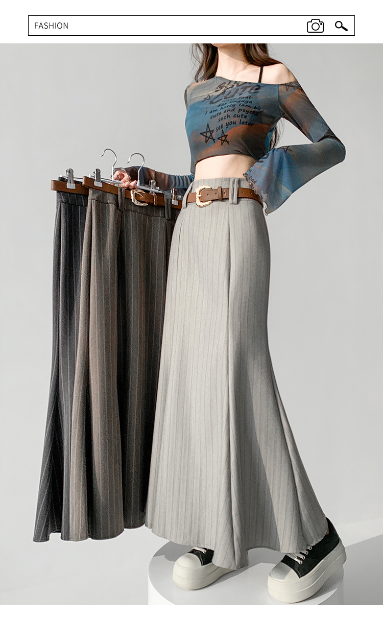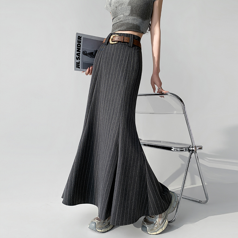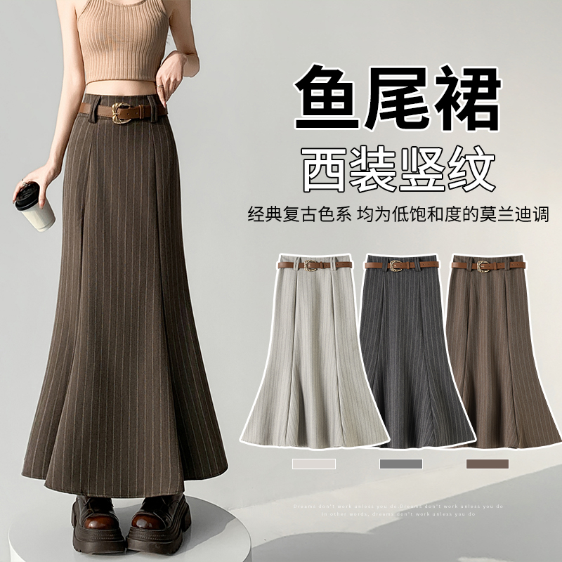 실사 레트로 스트라이프 하이웨이스트 인어 꼬리 스커트 반신 스커트 여성 2026 봄 여름 새로운 품격 슬림해 보이는 정장 롱 스커트