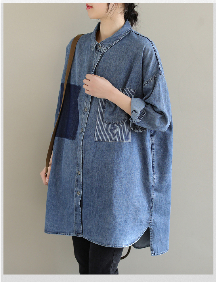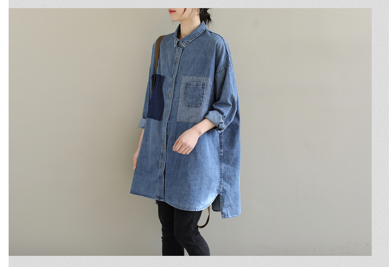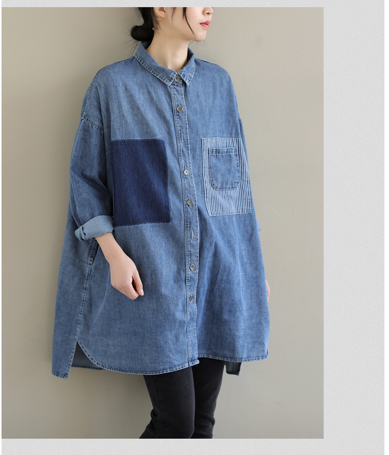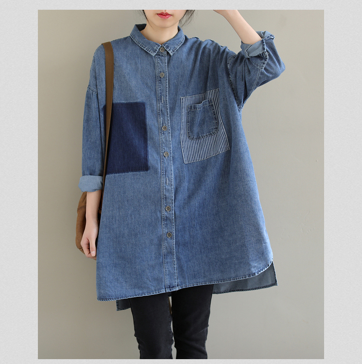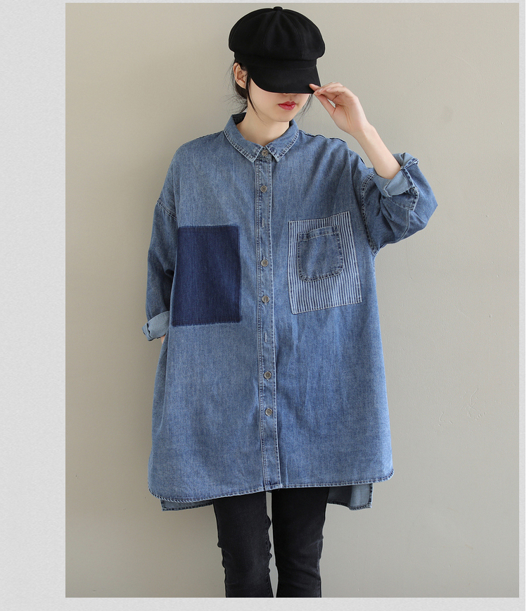 2026 봄 새로운 한국 스타일 문예 빅 사이즈 루즈핏 패치워크 패치 스트라이프 주머니 데님 셔츠 여성 셔츠