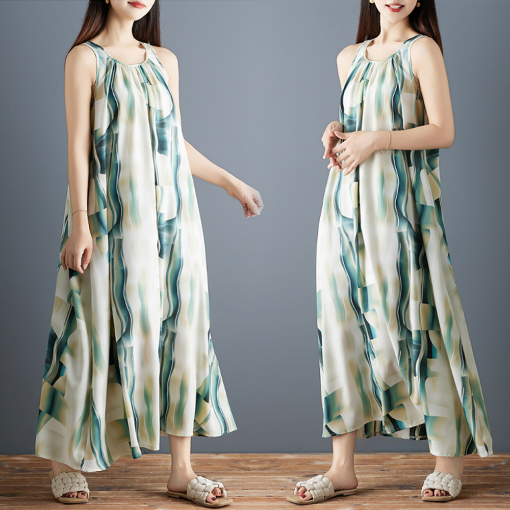 실사 2026 여름 새로운 패션 조끼 롱 스커트 루즈핏 쉬폰 프린트 민소매 레트로 중간 길이 드레스