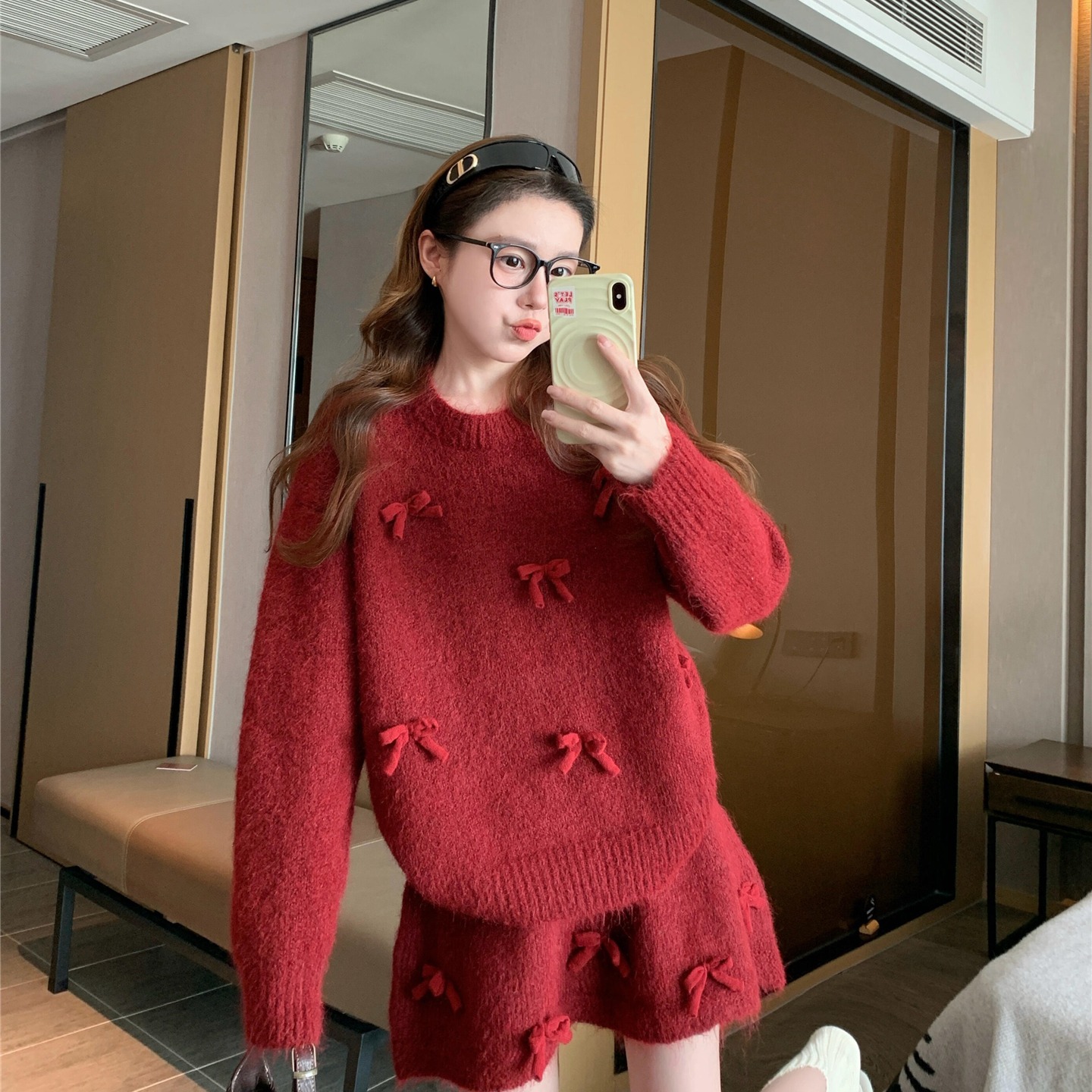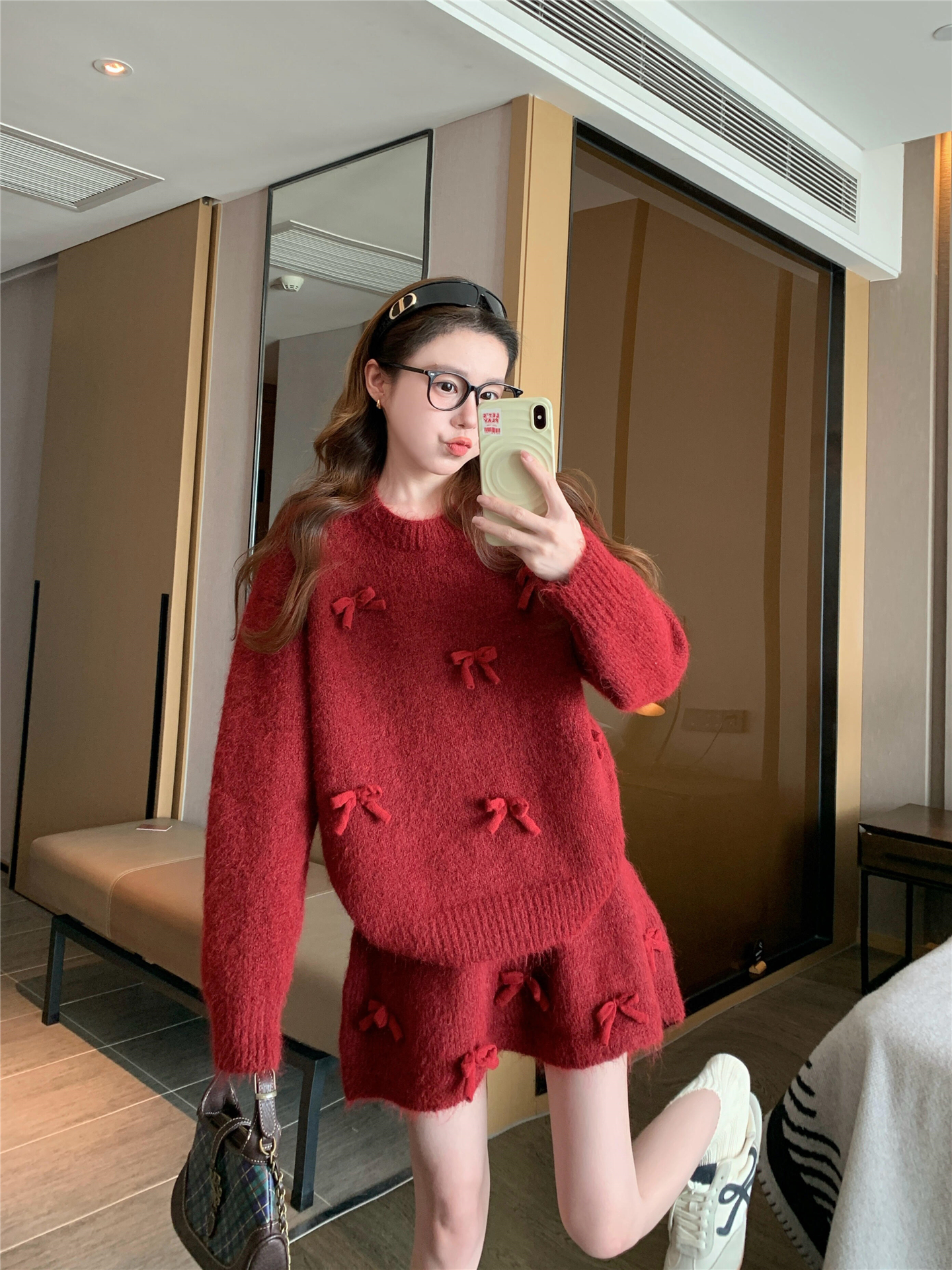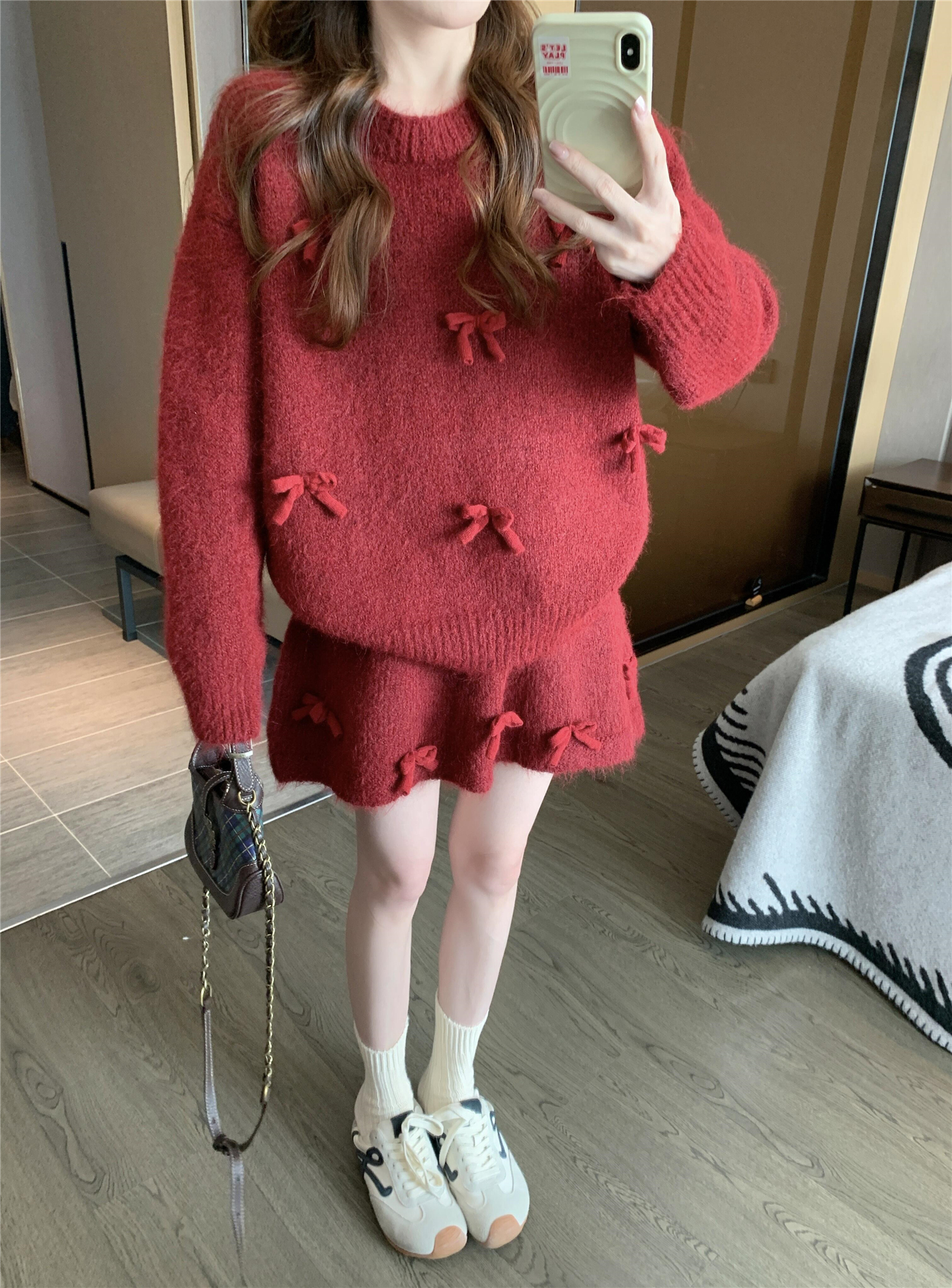 느긋한 바람 빨간색 니트 자카드 세트 여성 2026 새로운 봄 가을 연령 감소 착용 잡아라. 의류 반신 스커트 투피스 세트