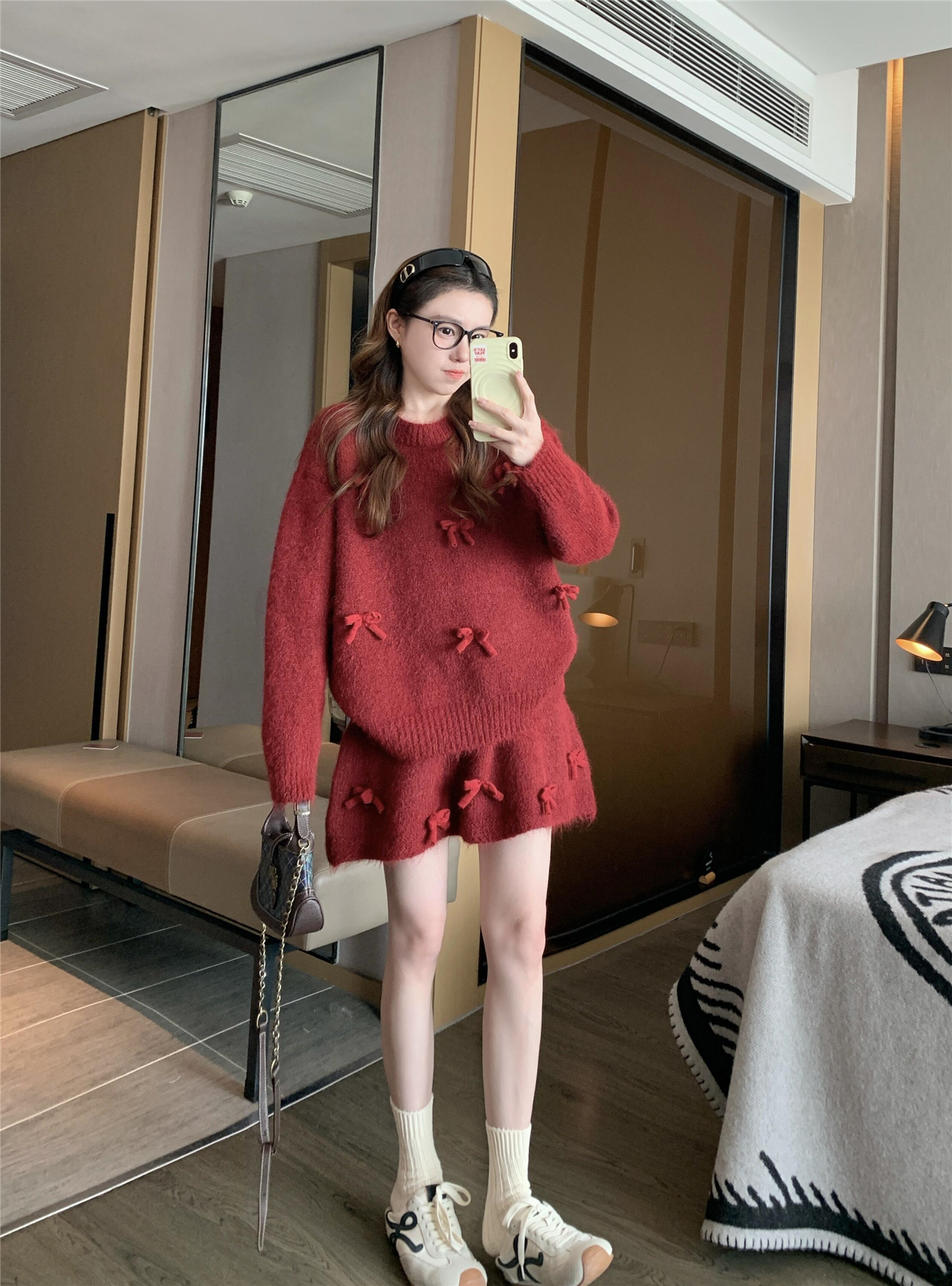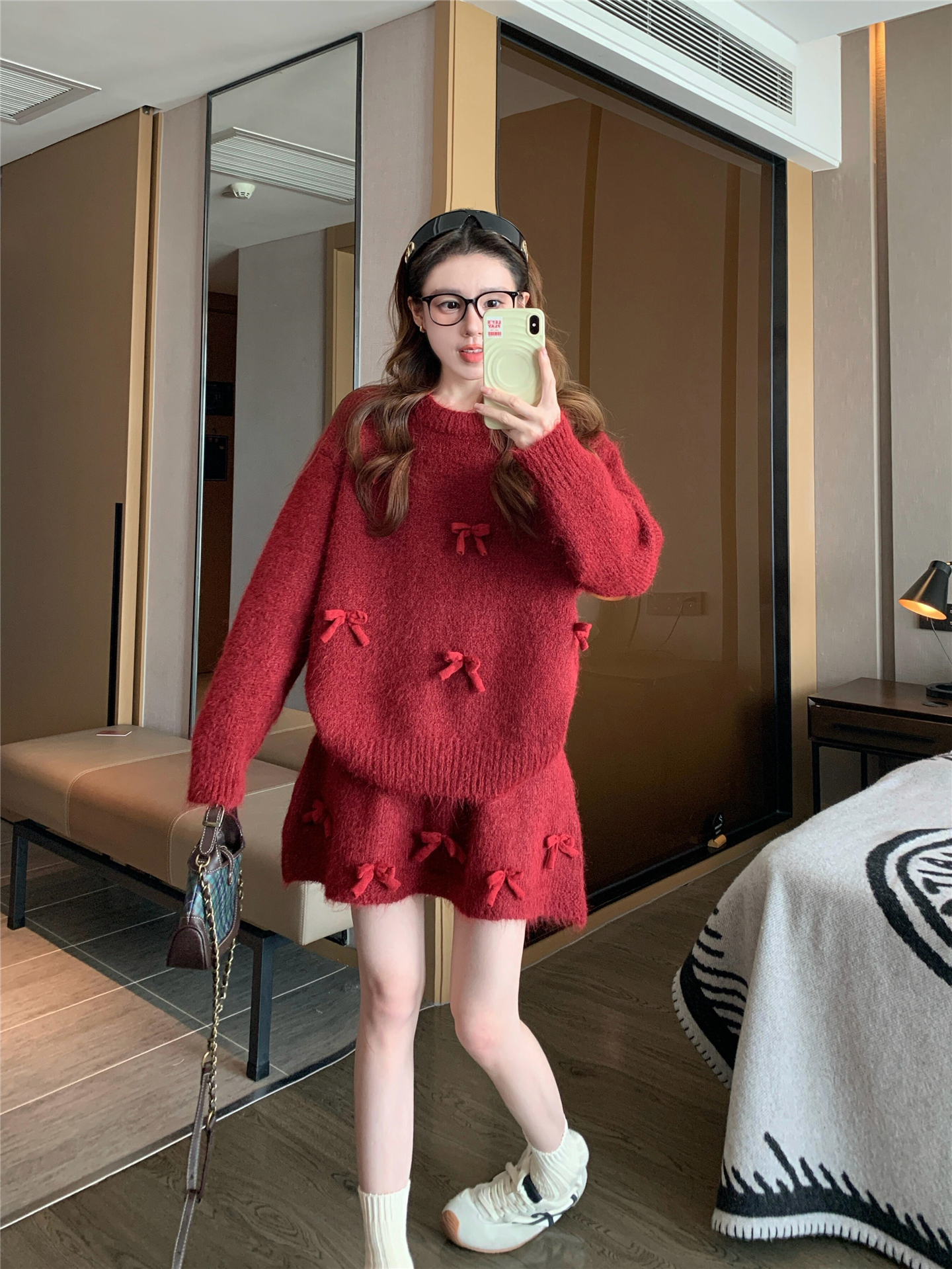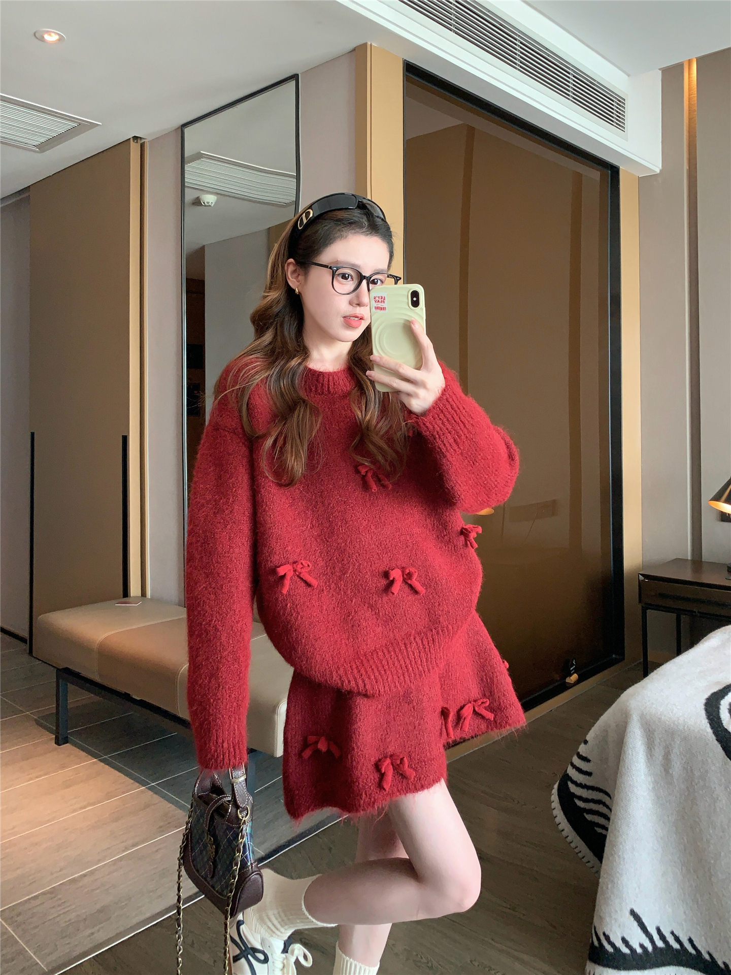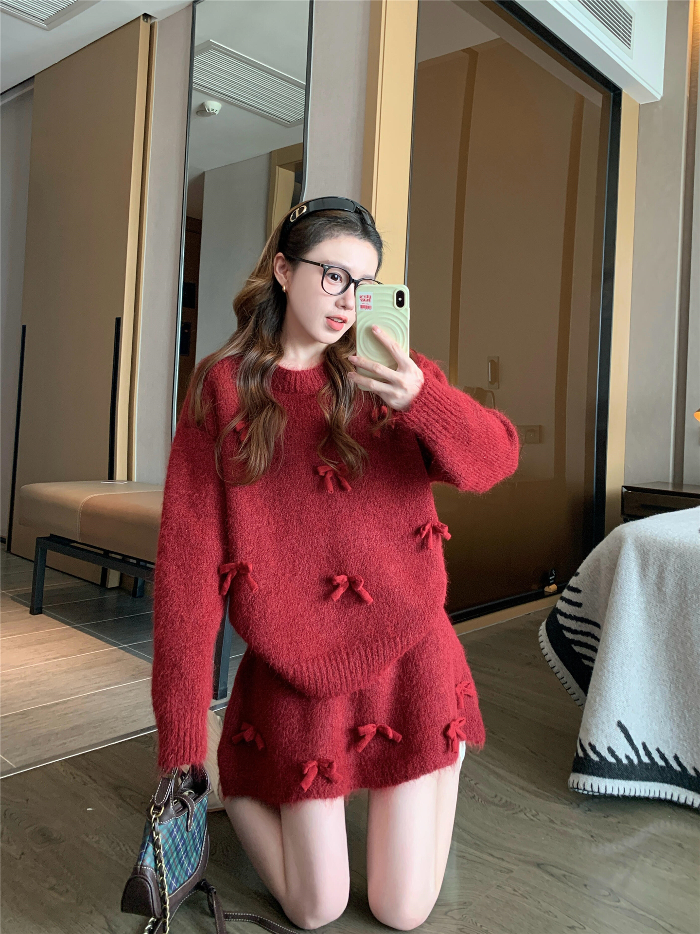 느긋한 바람 빨간색 니트 자카드 세트 여성 2026 새로운 봄 가을 연령 감소 착용 잡아라. 의류 반신 스커트 투피스 세트