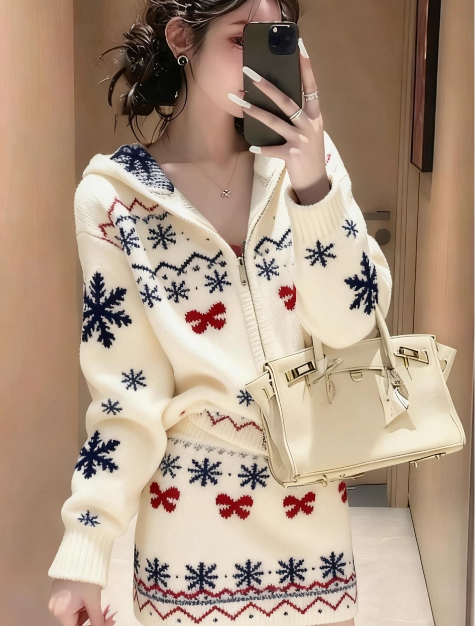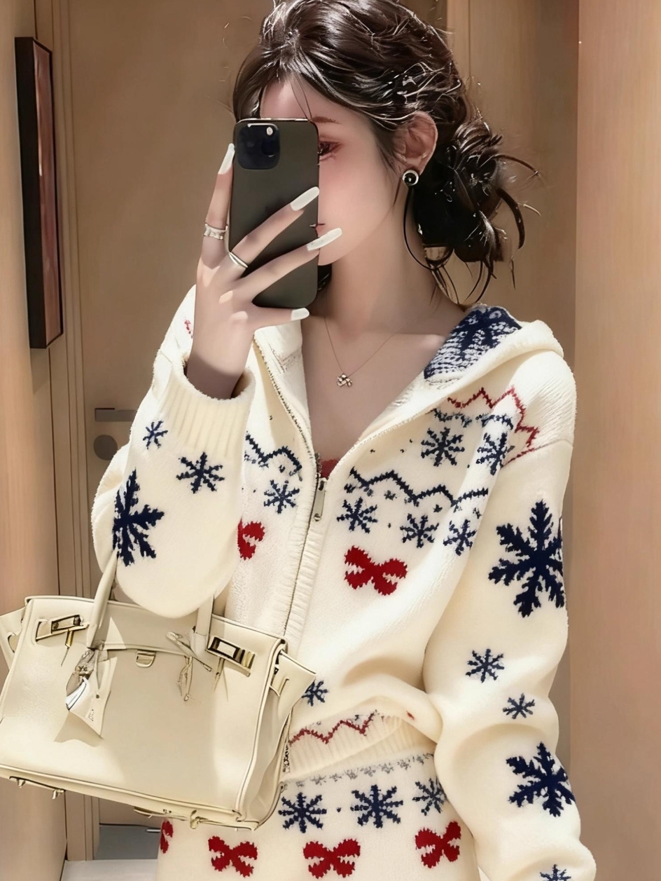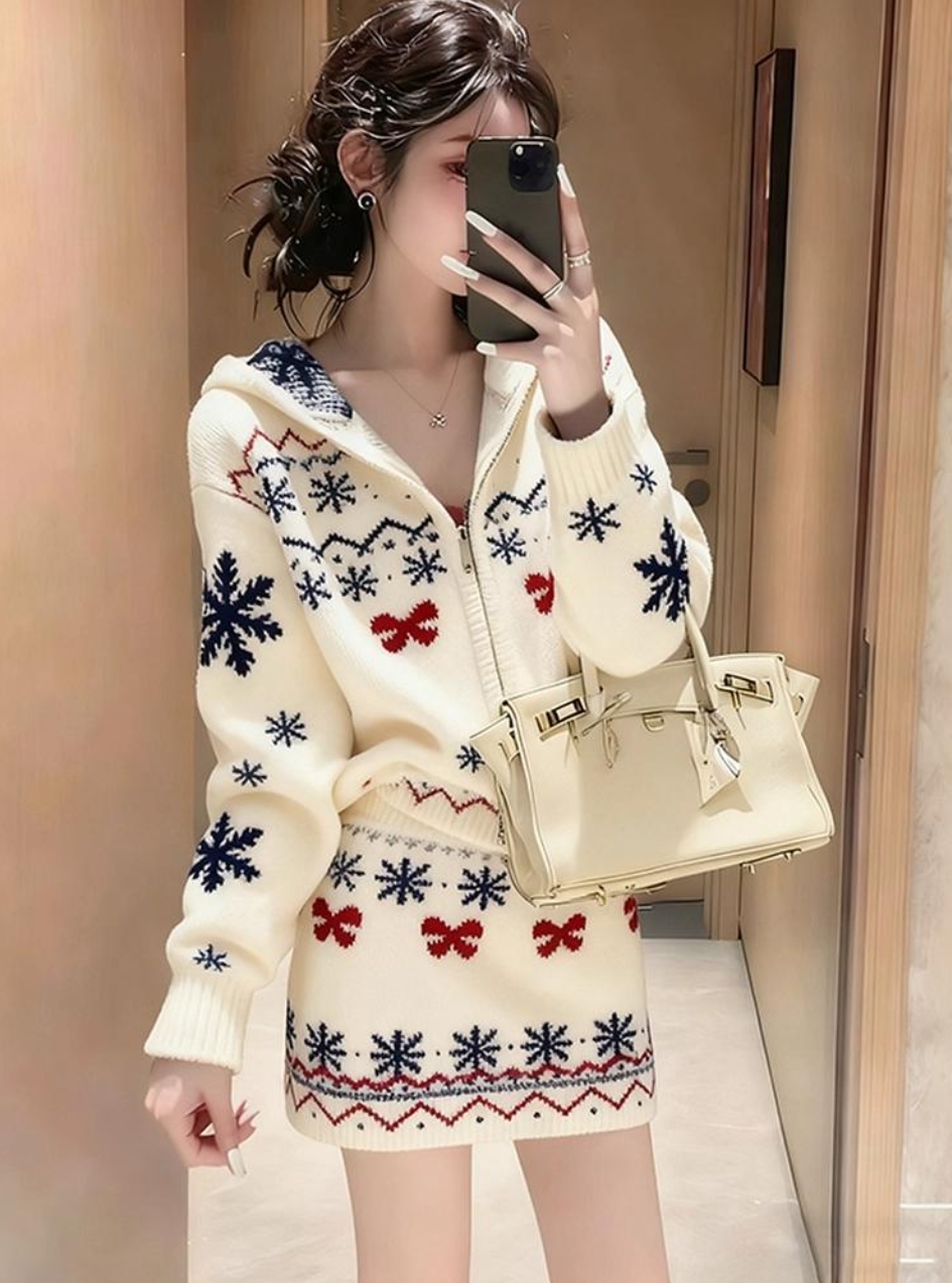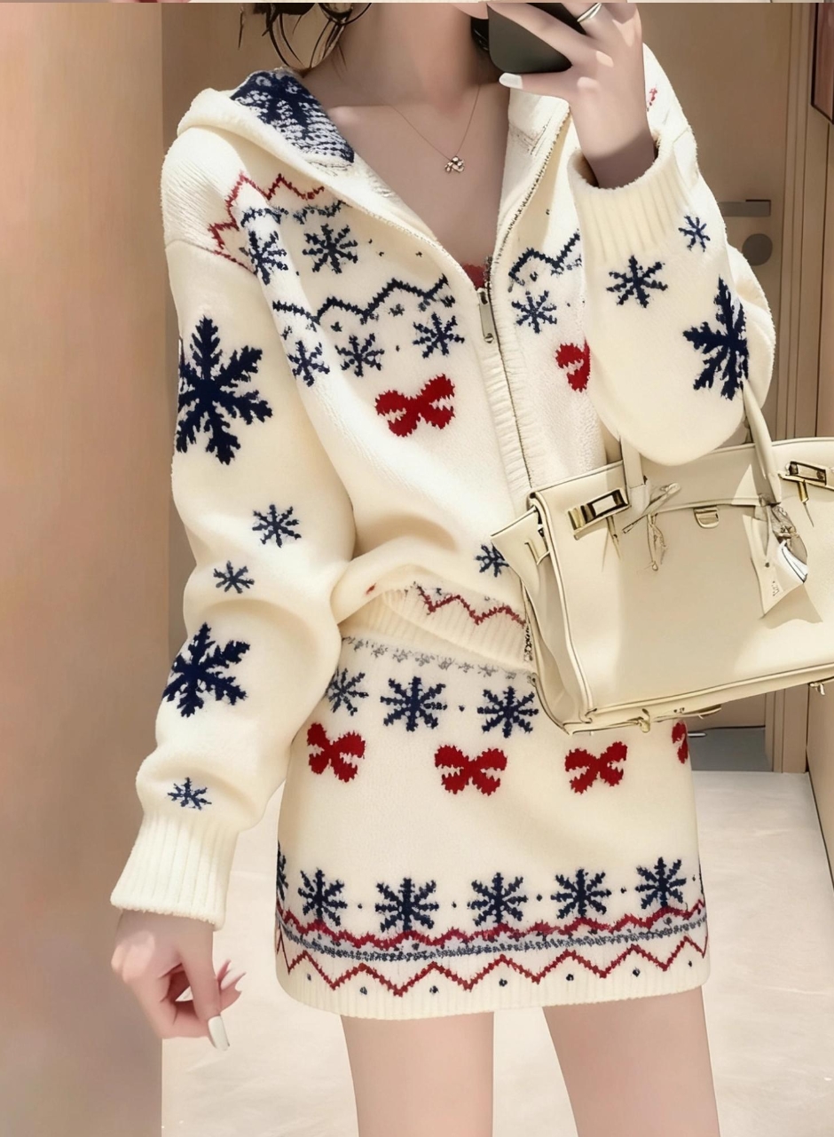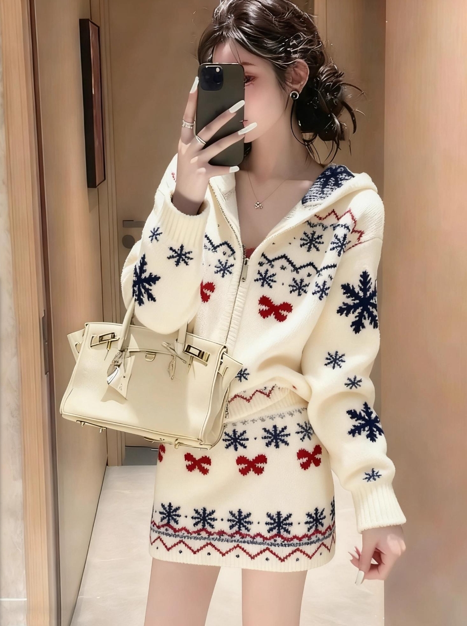 봄 가을 분위기 센스 착용 가져 가라. 쌀 화이트 자카드 세트 여성 2026 새로운 패션 니트 맨위 미니 스커트 투피스 슈트