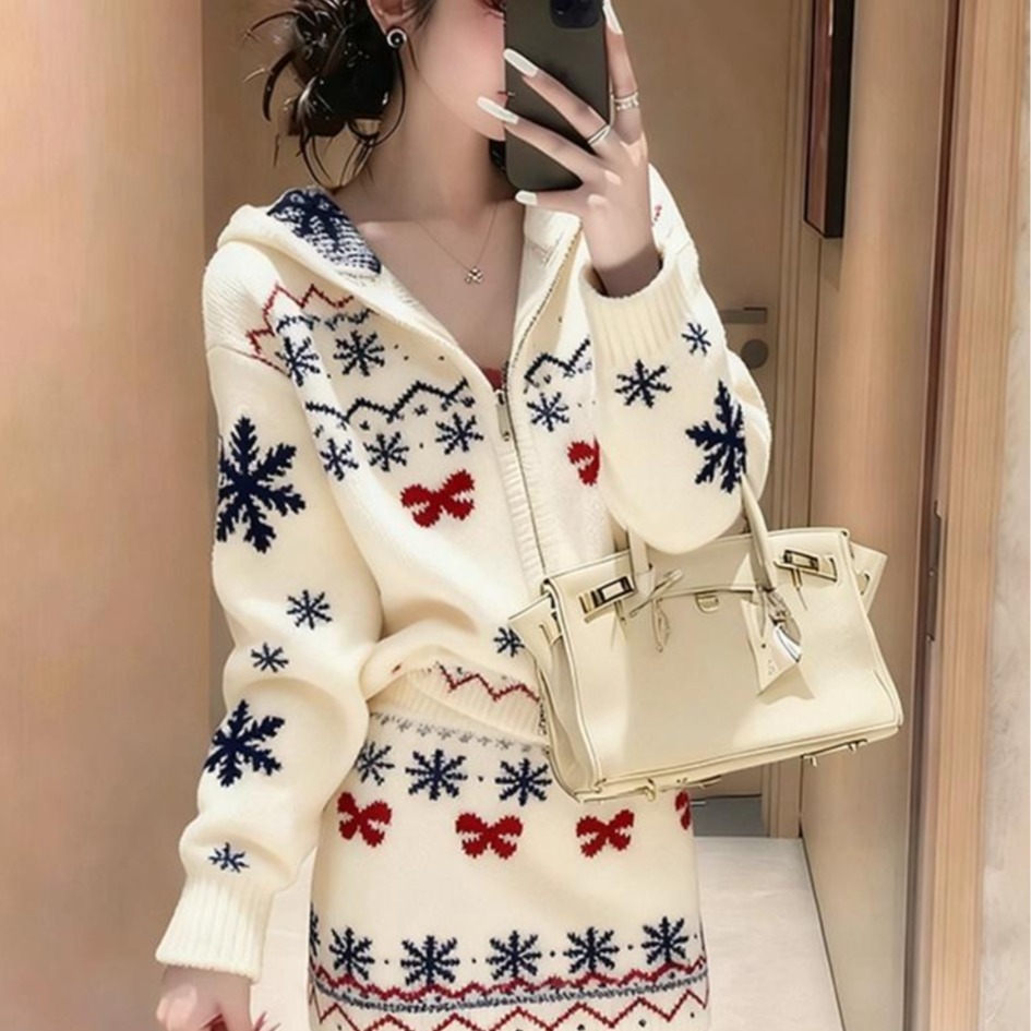 느긋한 바람 빨간색 니트 자카드 세트 여성 2026 새로운 봄 가을 연령 감소 착용 잡아라. 의류 반신 스커트 투피스 세트