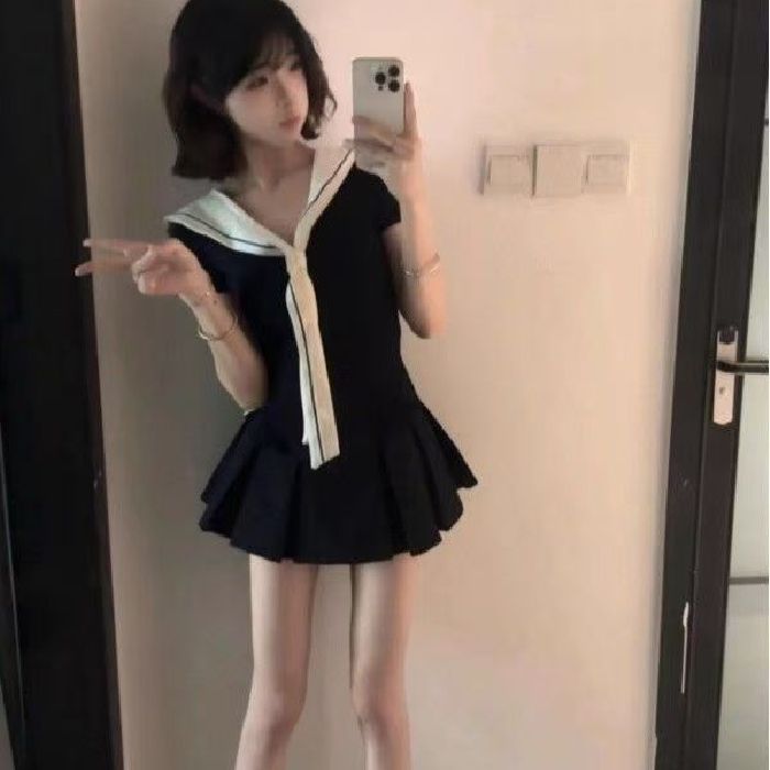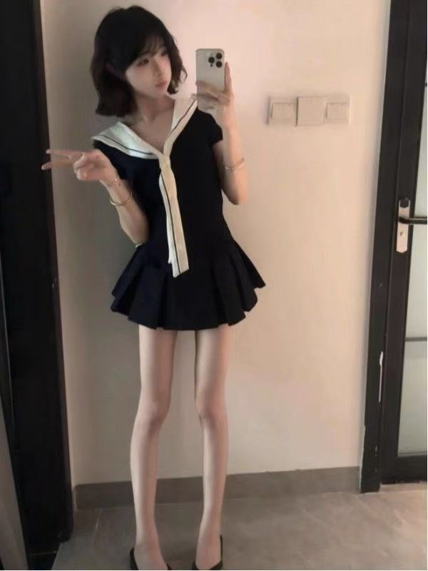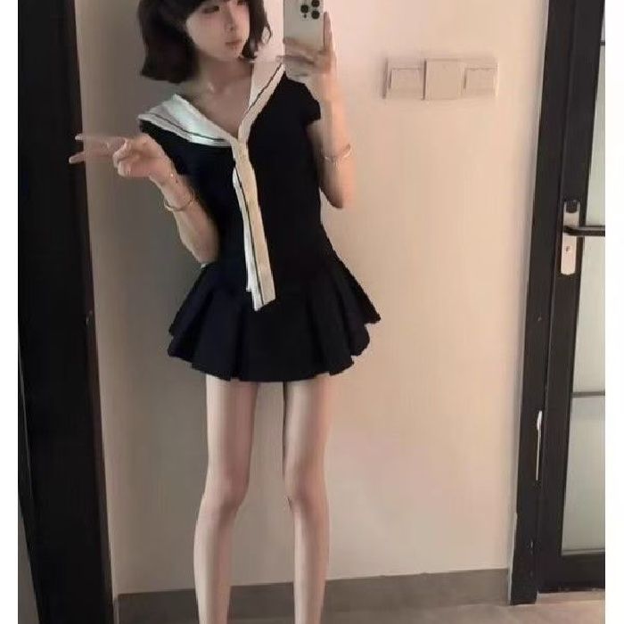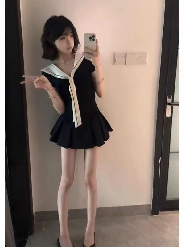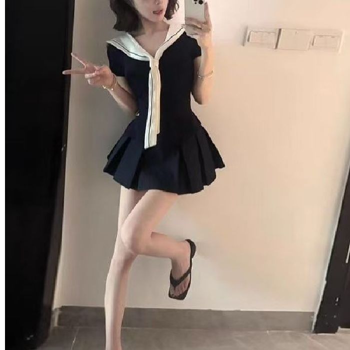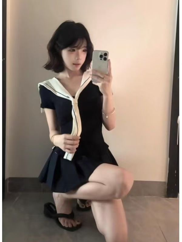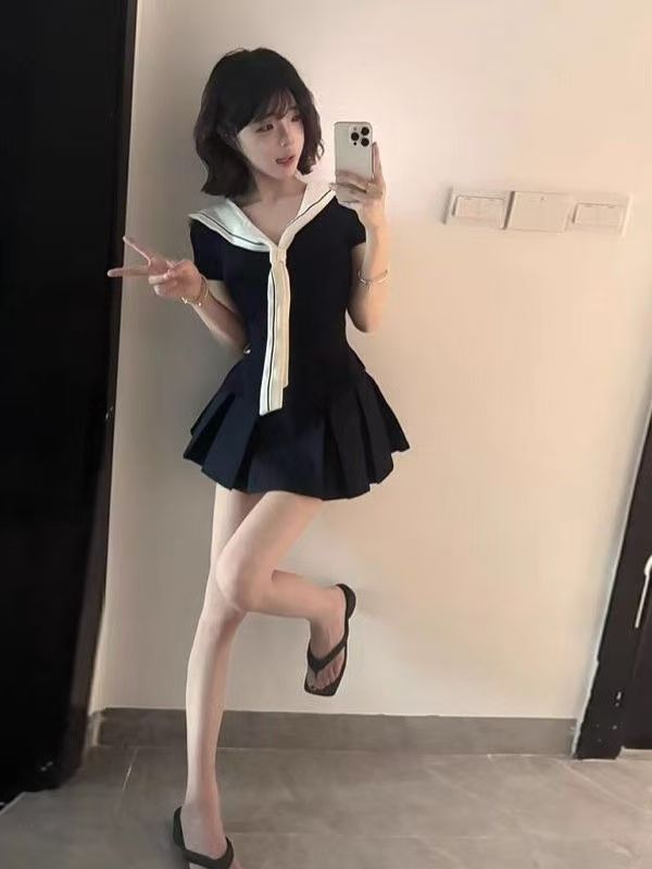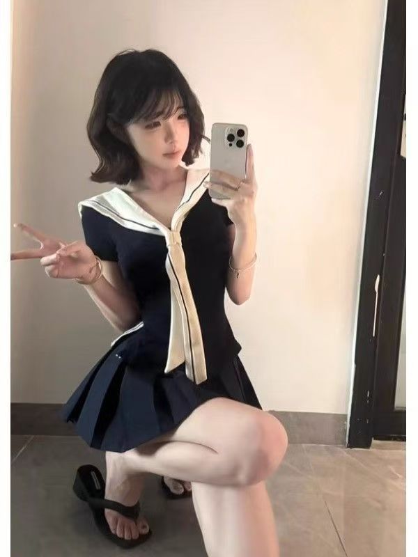 해군 칼라 맨위 학원 스타일 세트 여성 여름 디자인 센스 꼬집기 허리 반팔 티셔츠 하이웨이스트 슬림해 보이는 플리츠 미니 스커트