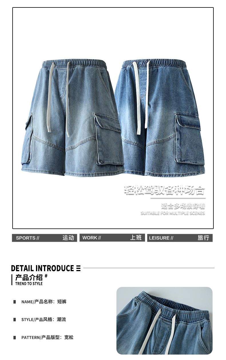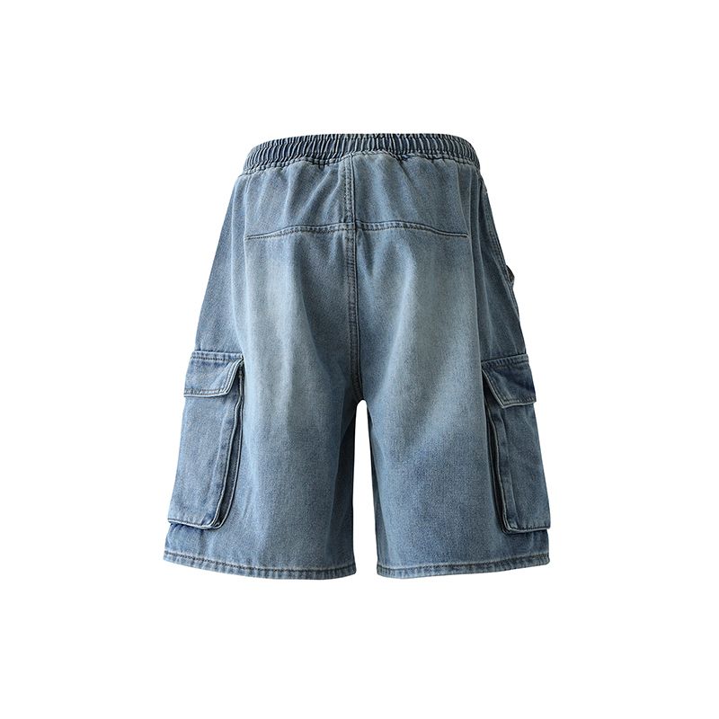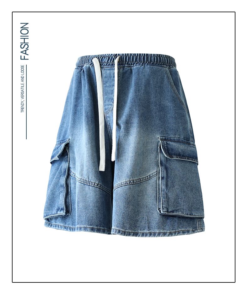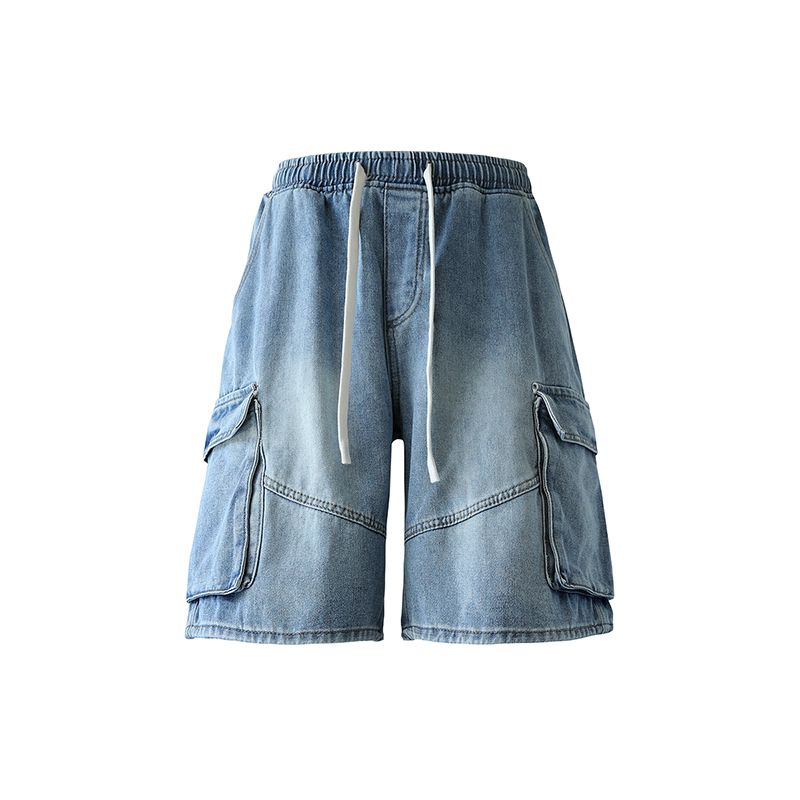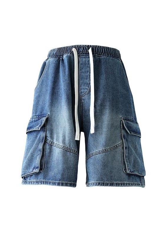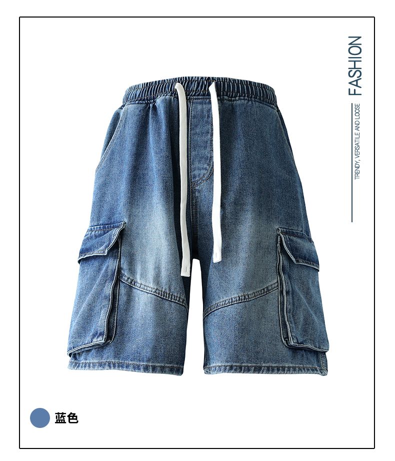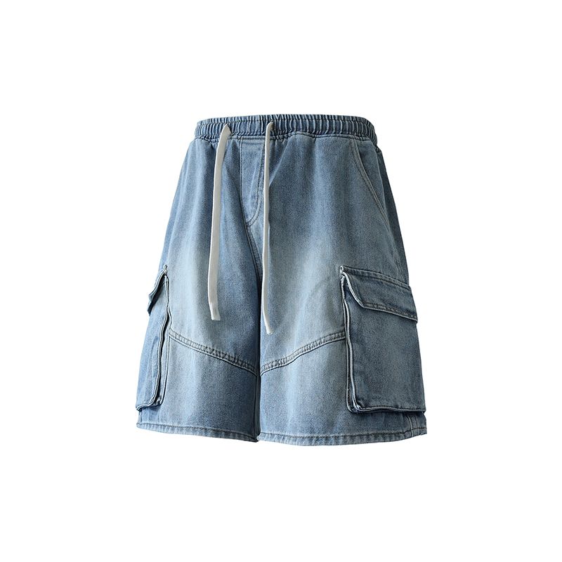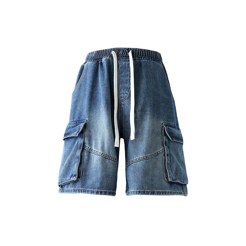 실사 여름 새로운 워크웨어 빅 포켓 데님 오부 바지 남자 루즈핏 전체 밴딩 펌프 로프 캐주얼 다용도 바지
