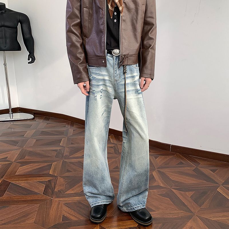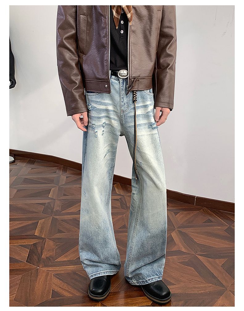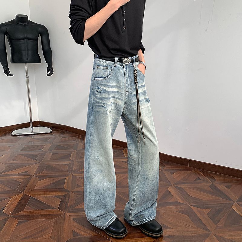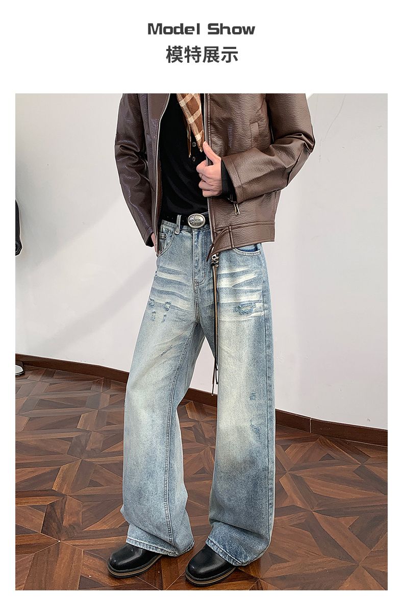 실사 2026 여름 새로운 아메리칸 높음 거리 항구 바람 레트로 노스탤지어 개성 찢어진 부분 루즈핏 넓은 다리 청바지 남자