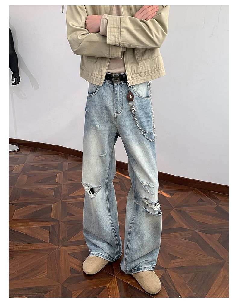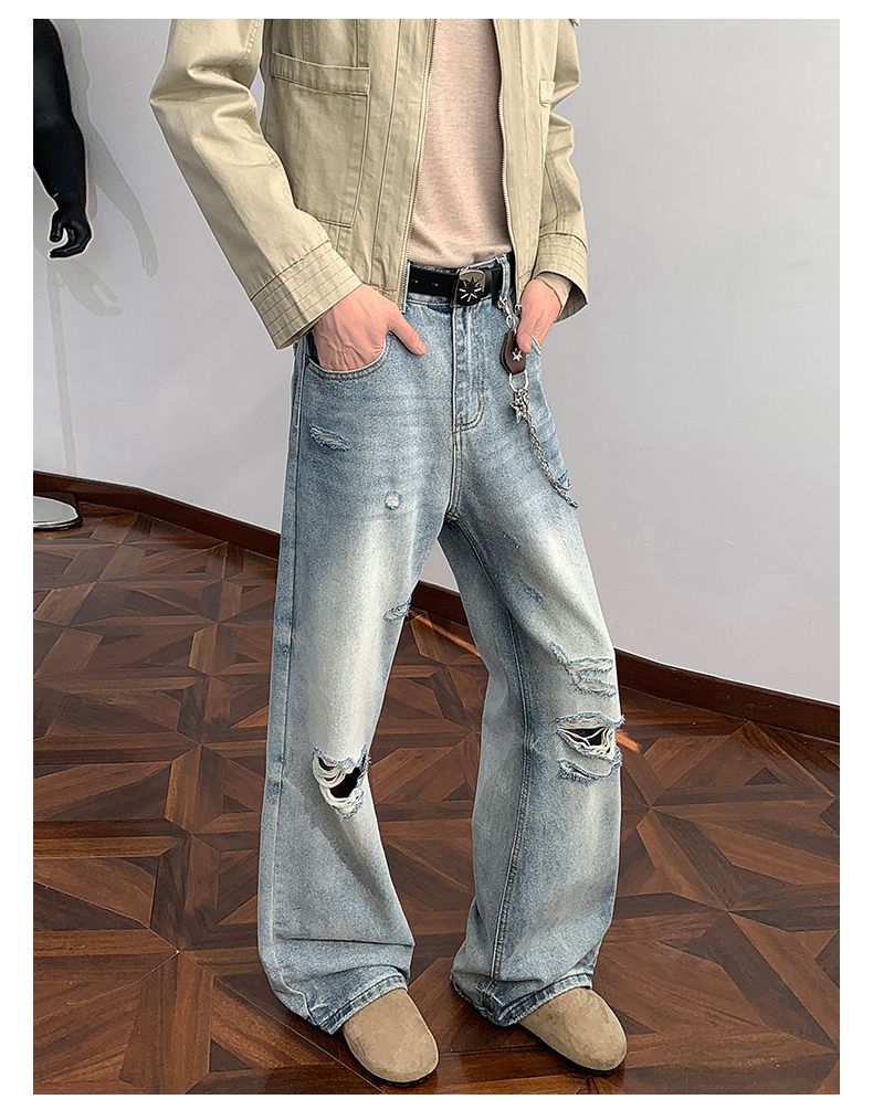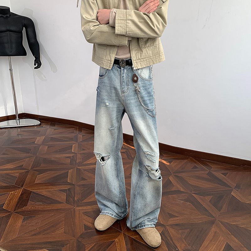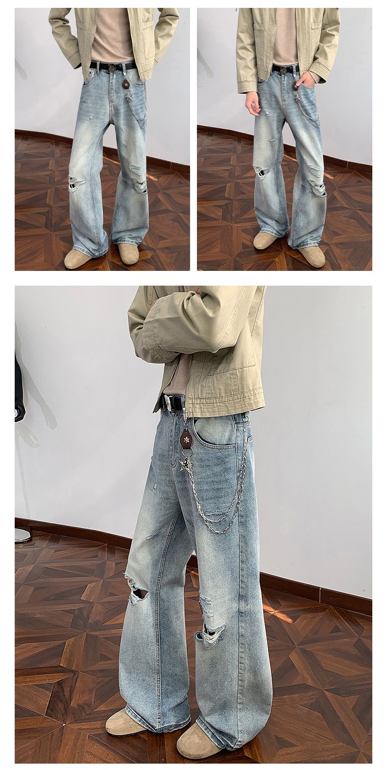 실사 2026 여름 새로운 아메리칸 높음 거리 항구 바람 레트로 노스탤지어 개성 찢어진 부분 루즈핏 넓은 다리 청바지 남자