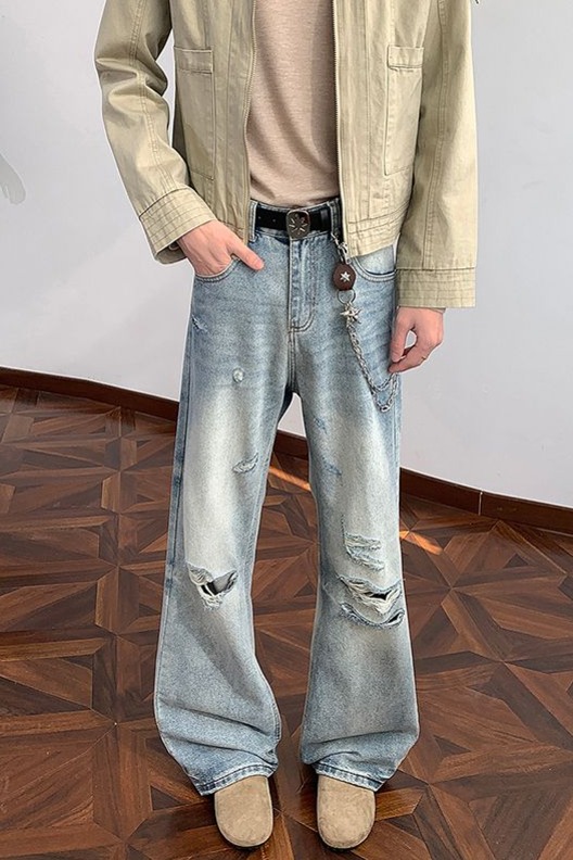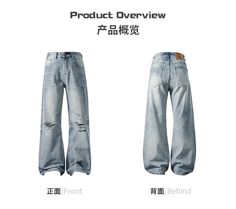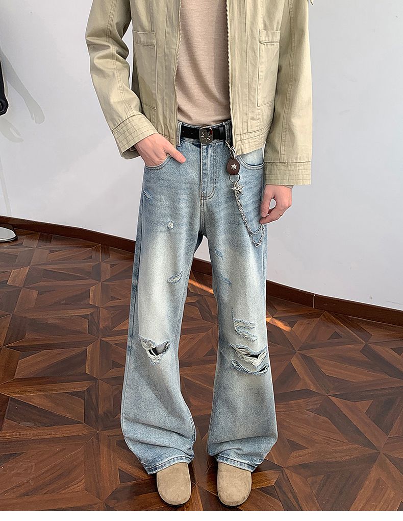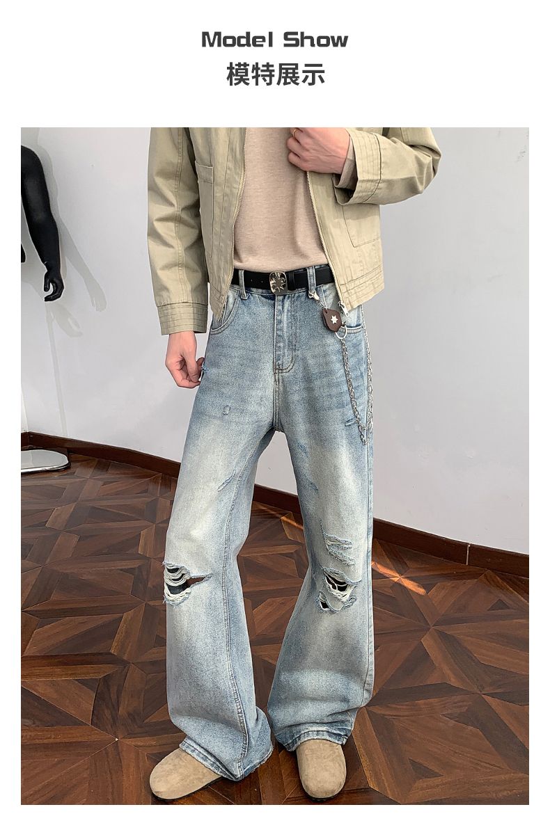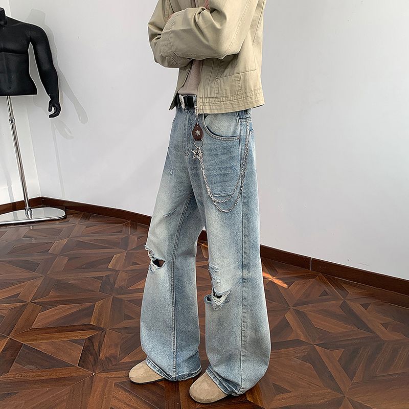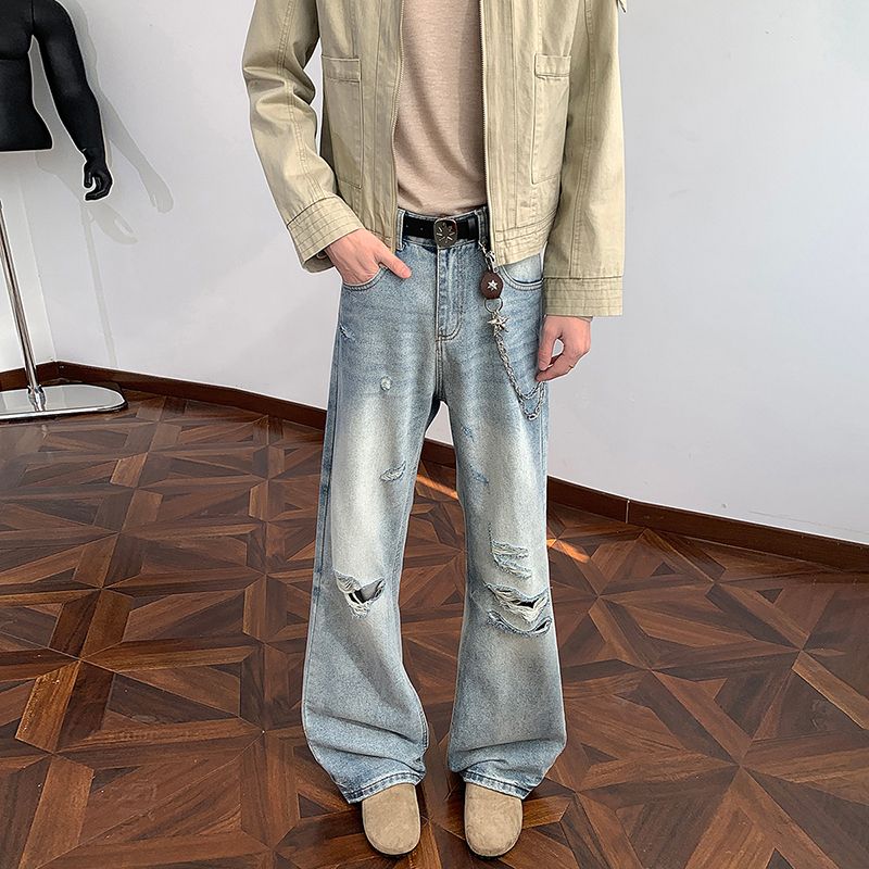실사 2026 여름 새로운 아메리칸 높음 거리 항구 바람 레트로 노스탤지어 개성 찢어진 부분 루즈핏 넓은 다리 청바지 남자