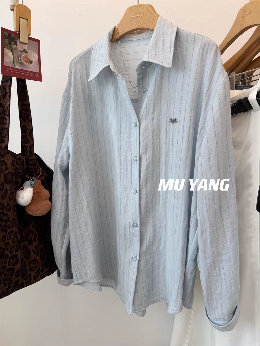 이른 봄 프랑스식 고급 센스 파란색 스트라이프 셔츠 맨위 여성 2026 새로운 루즈핏 자외선 차단 디자인 센스 셔츠 트렌디
