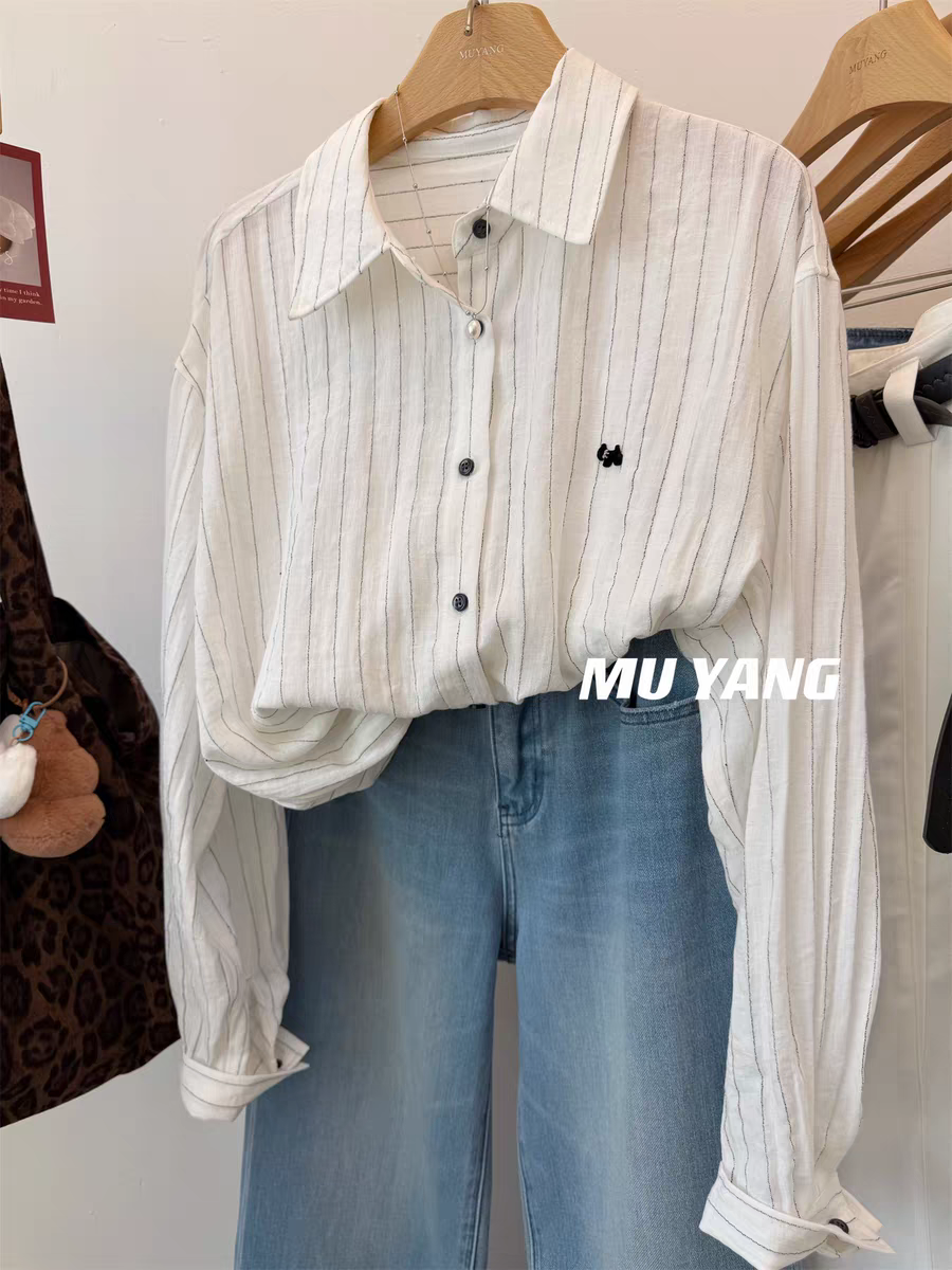 세로 줄무늬 자카드 느긋한 바람 셔츠 여성 봄 여름 한국 스타일 루즈핏 품격 출퇴근 다용도 캐주얼 맨위
