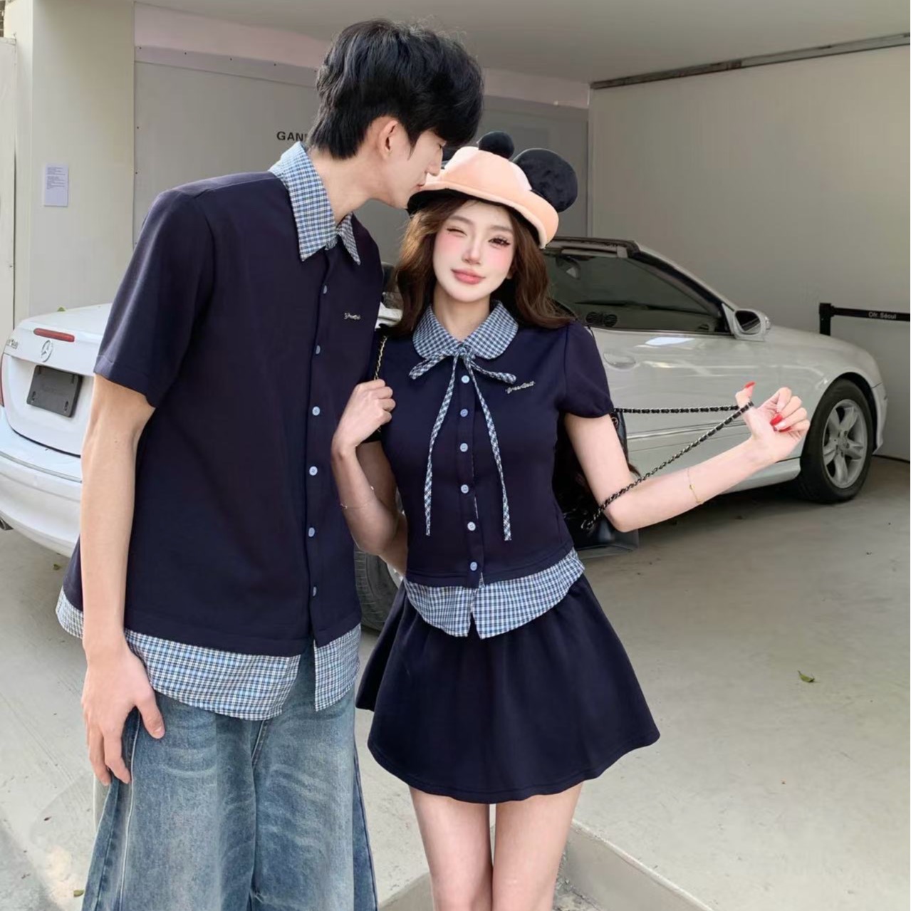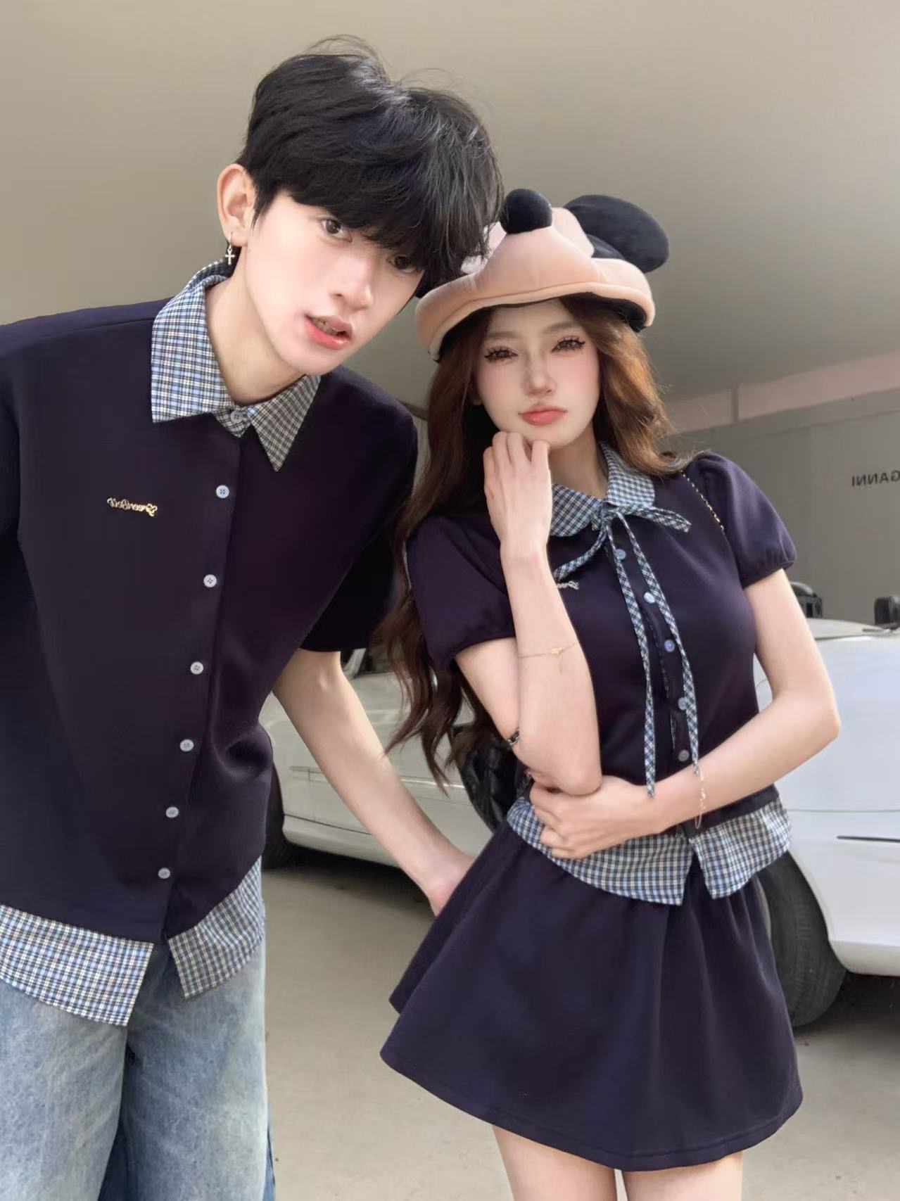 실사 페이크 레이어드 패치워크 폴로 칼라 체크무늬 여성 셔츠 한 부서 학원 스타일 맨위 짧은 치마 세트 커플룩