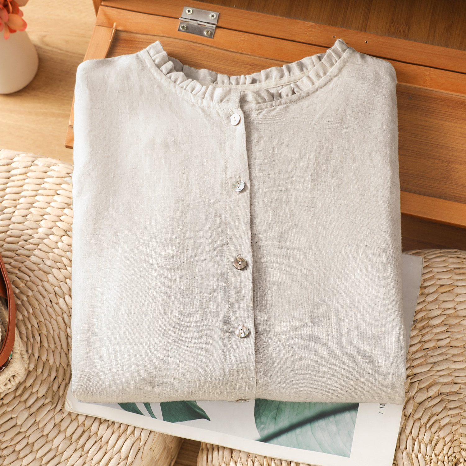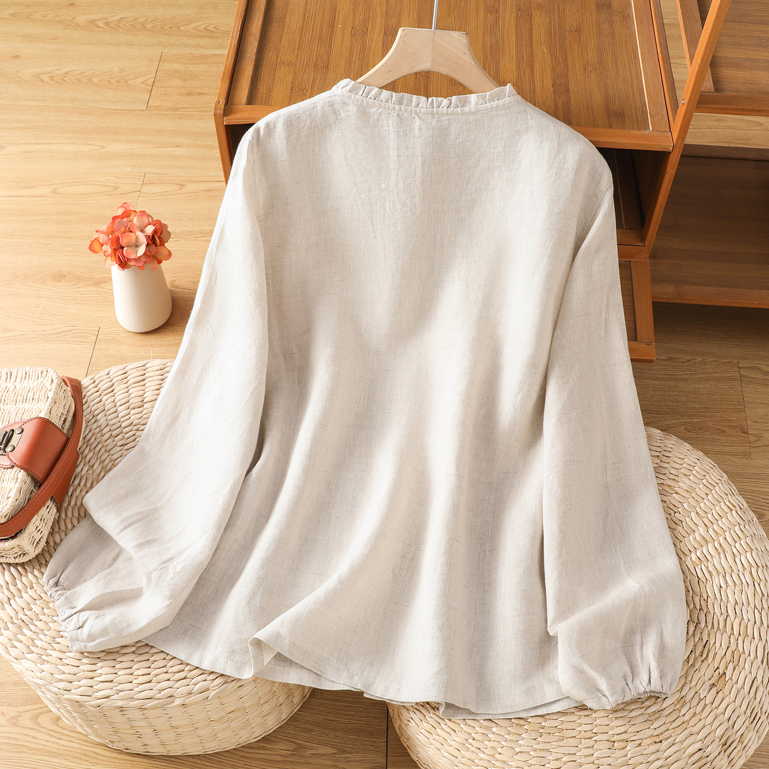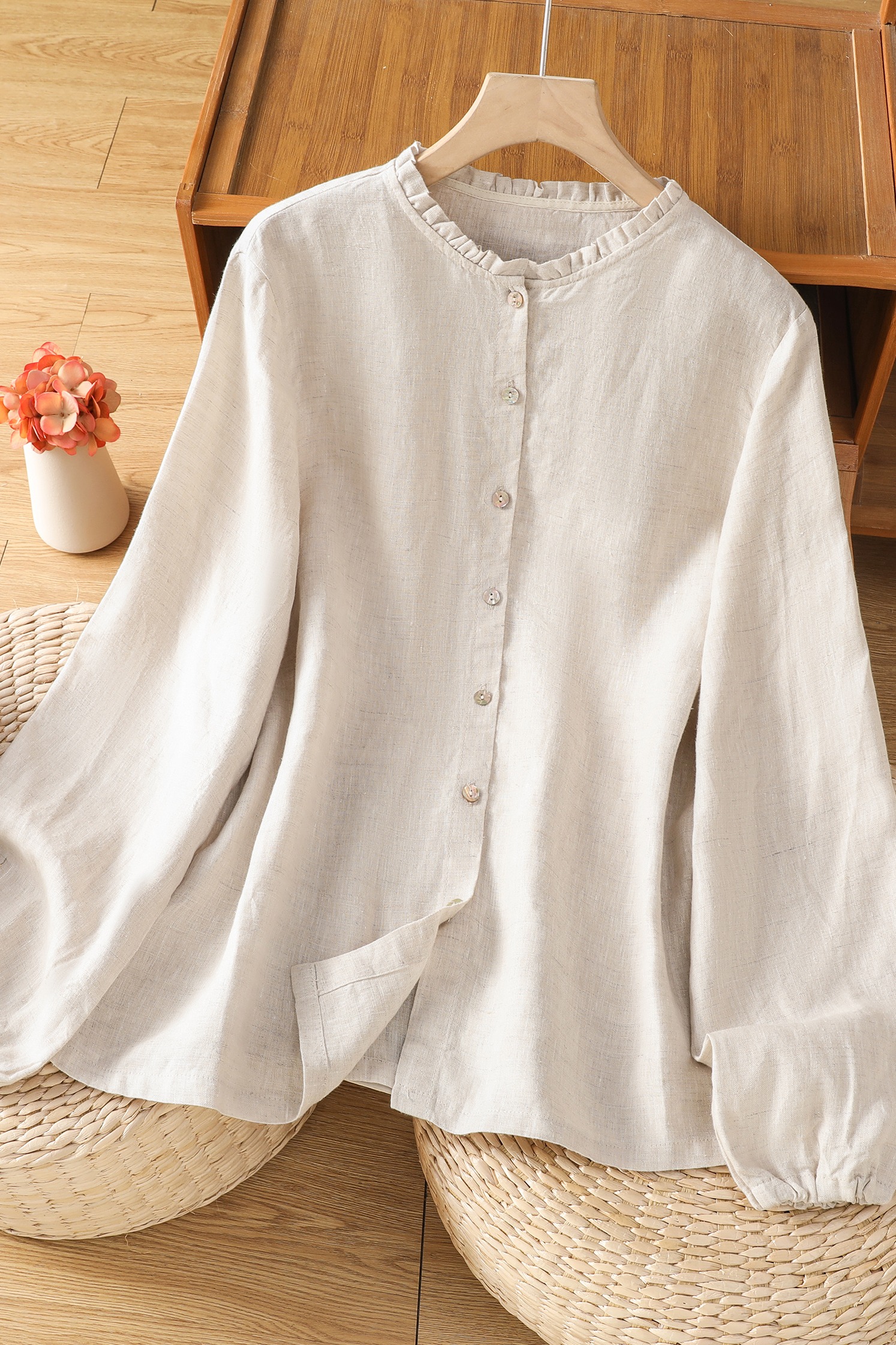 실사 2026 봄 새로운 면 린넨 긴팔 셔츠 프릴 칼라 문예 레트로 다용도 슬림해 보이는 품격 맨위 여성