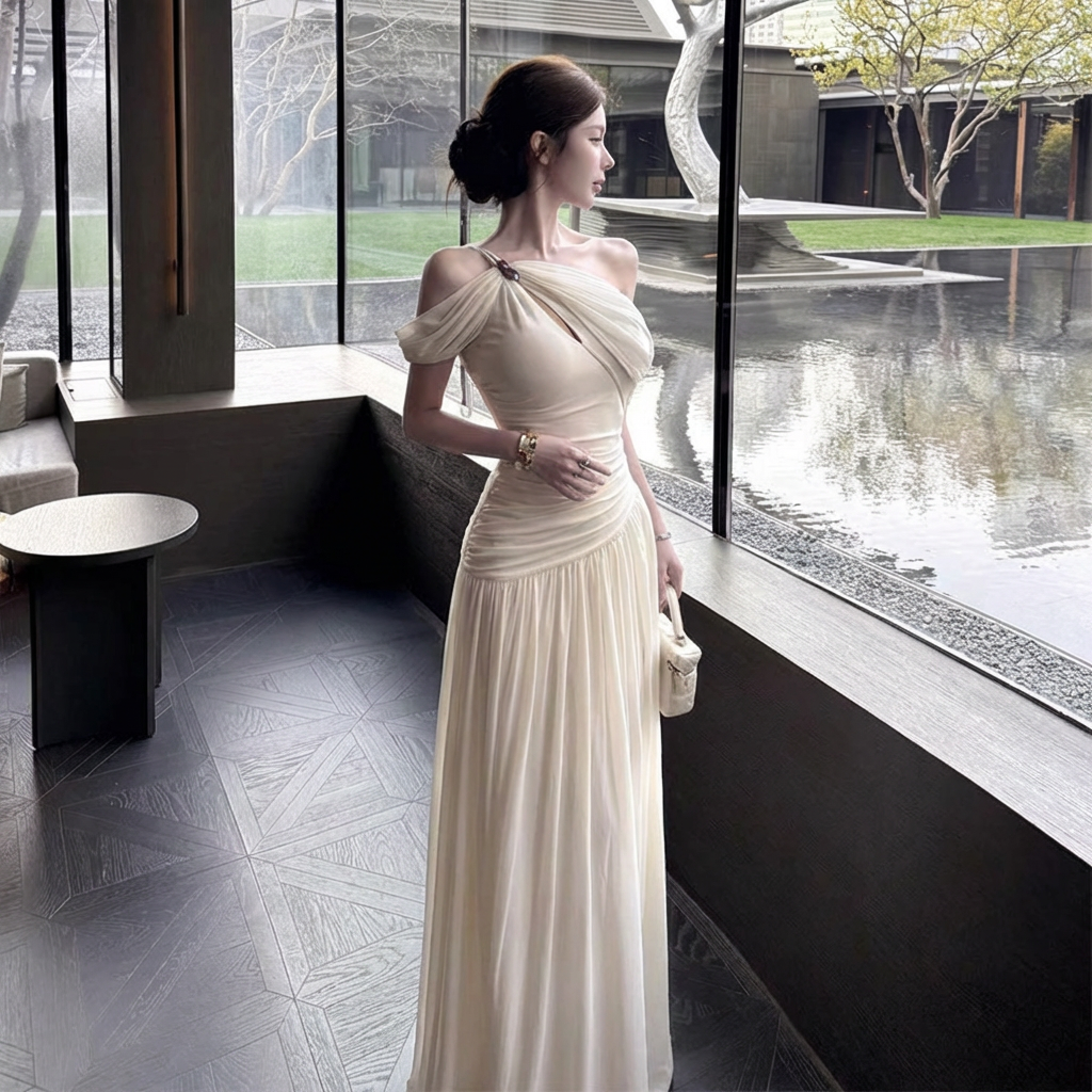 회화 솔루션 wahju 판매 부드러운 프랑스식 새틴 품격 비스듬한 어깨 천 금빛 바람 슬림해 보이는 한 마디 꼬집기 허리 드레스 봄