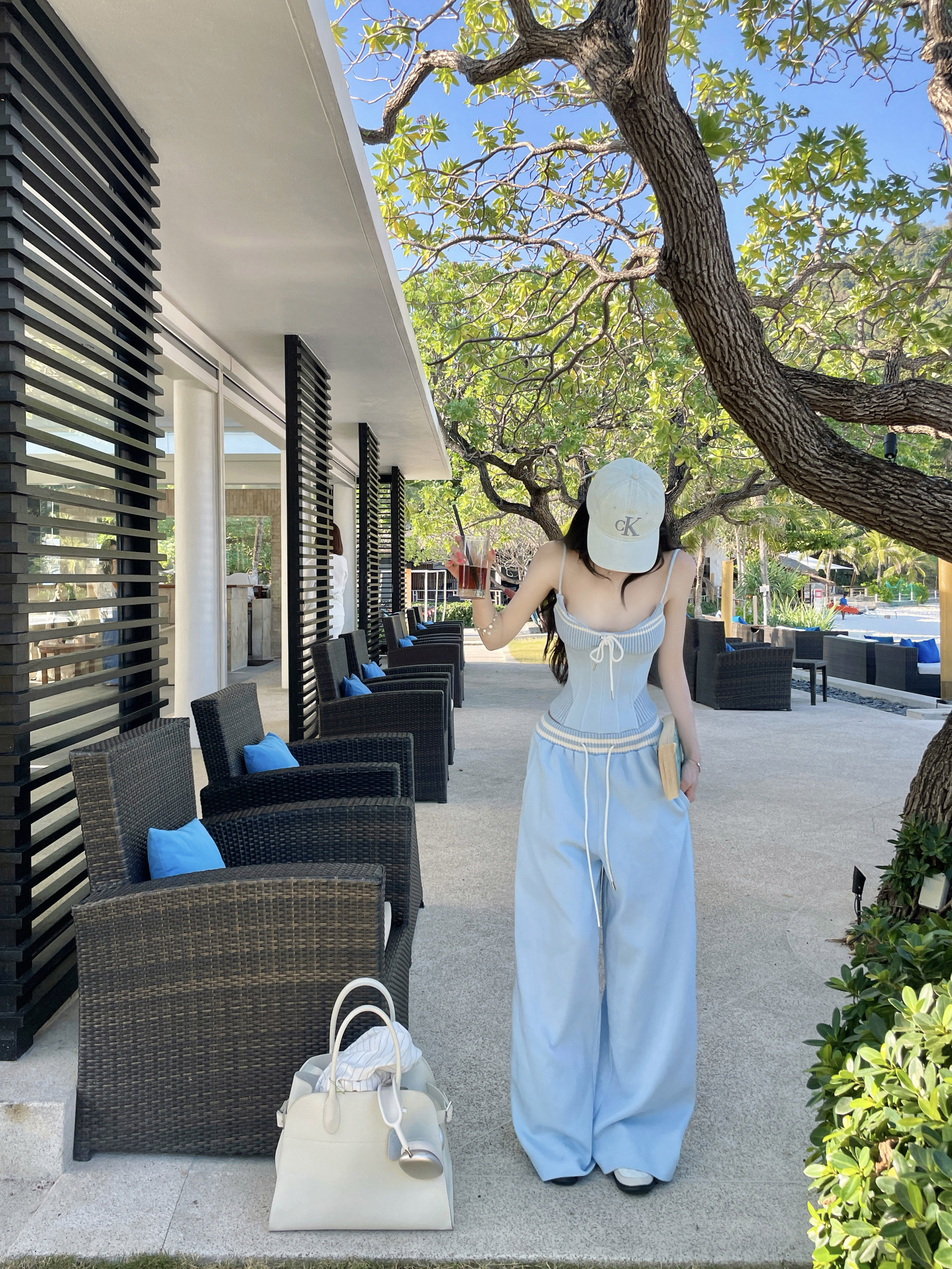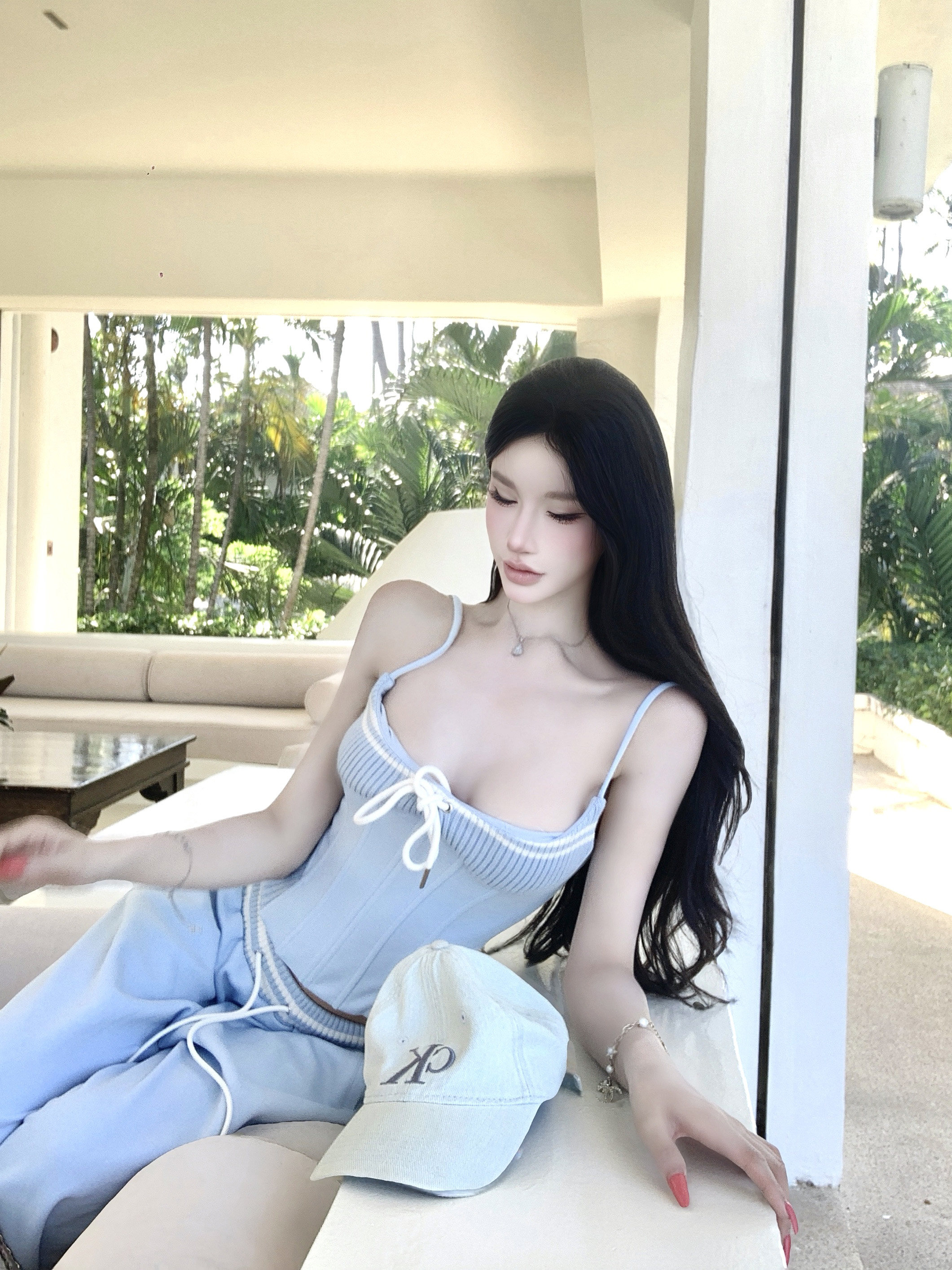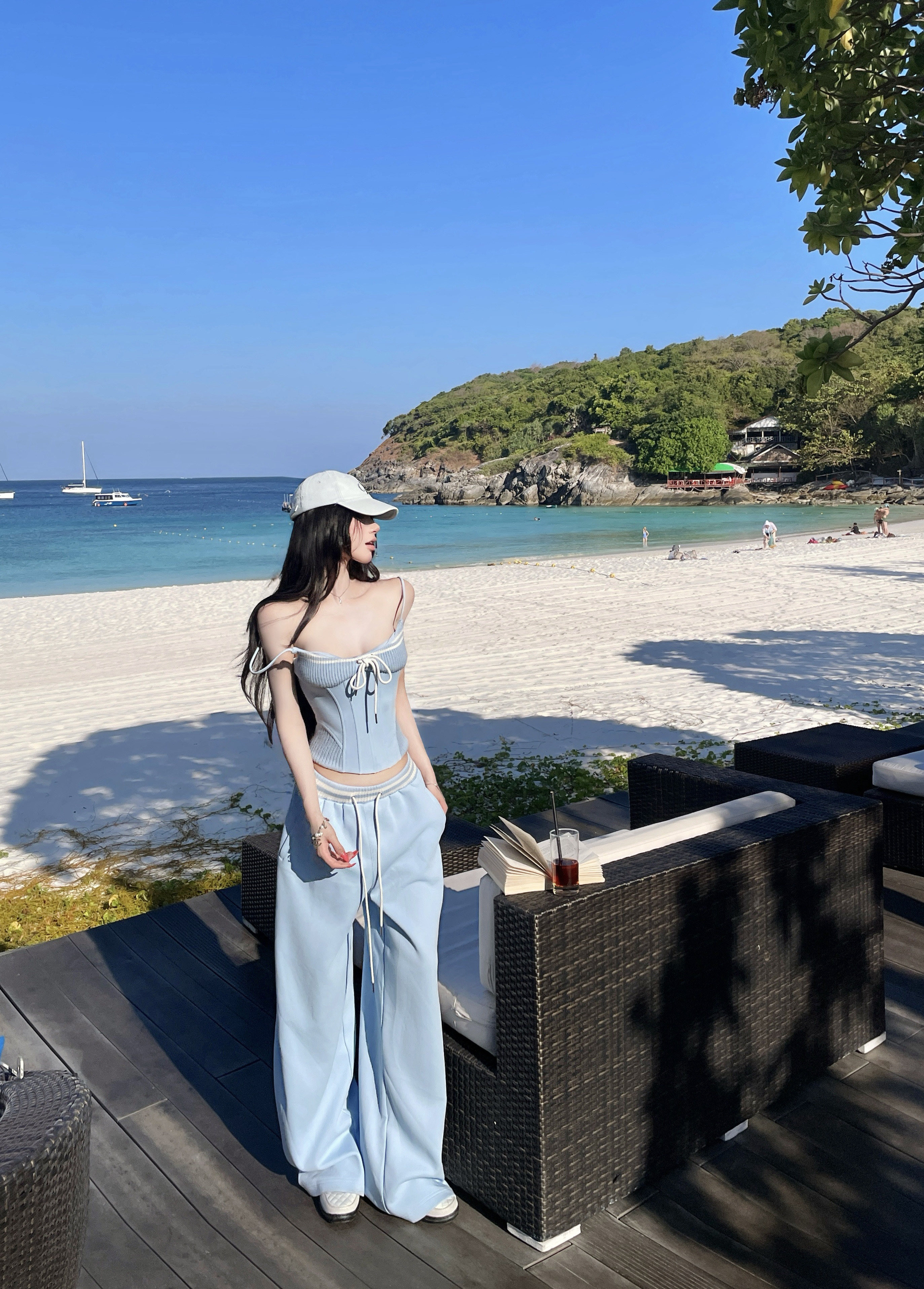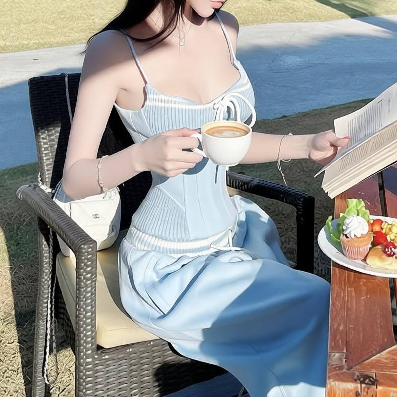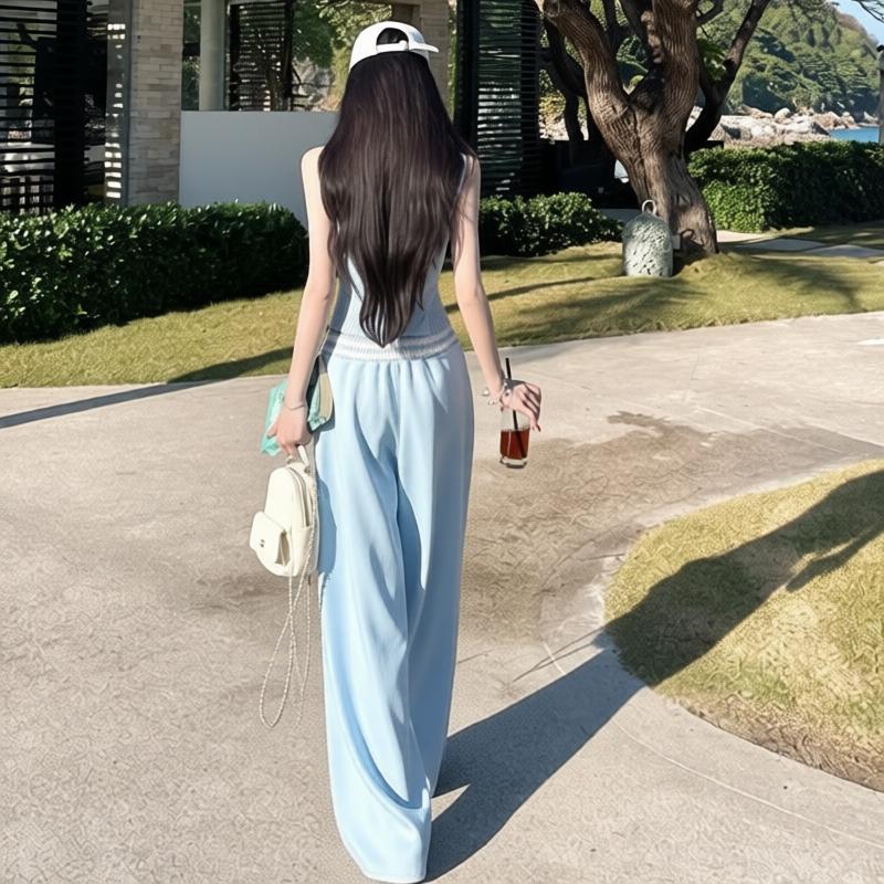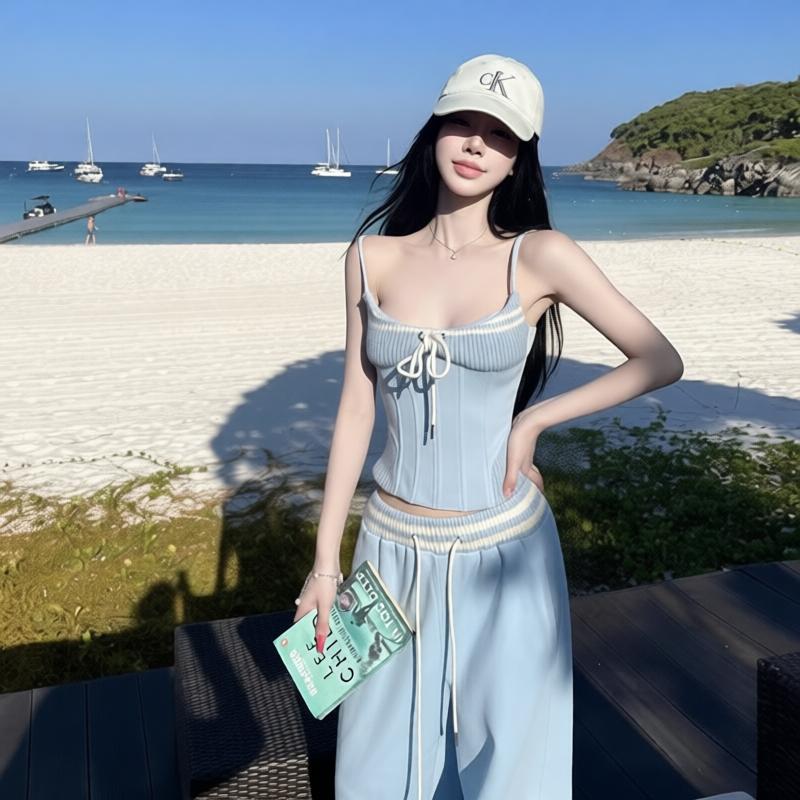 한 번 작은 짭짤한 휴가 바람 착용 가져 가라. 레이스 측면 캐미솔 세트 여성 2026 여름 루즈핏 와이드 레그 팬츠 투피스 세트
