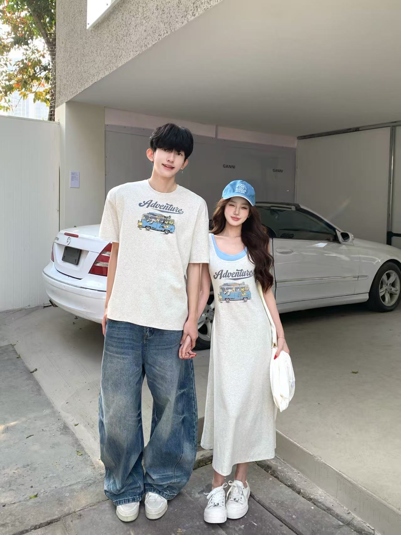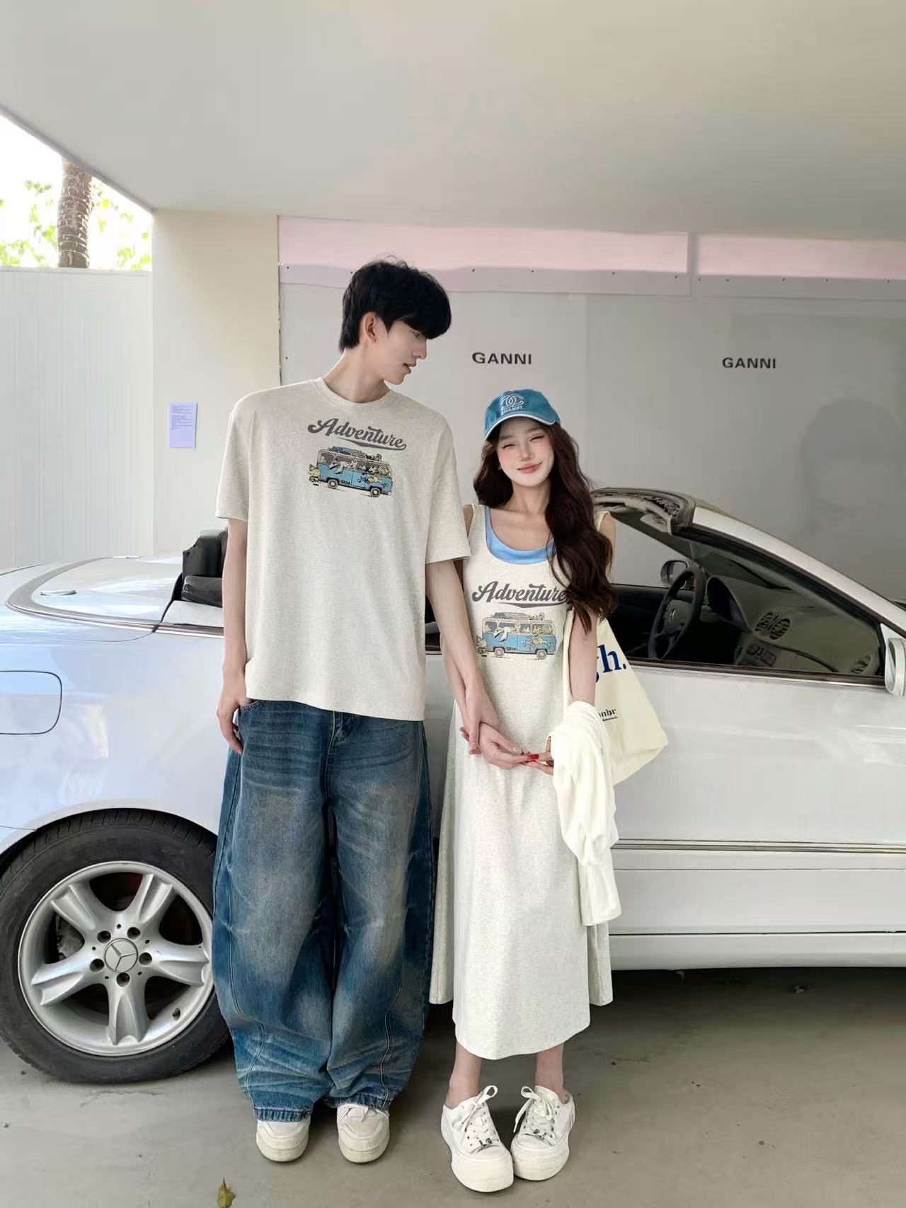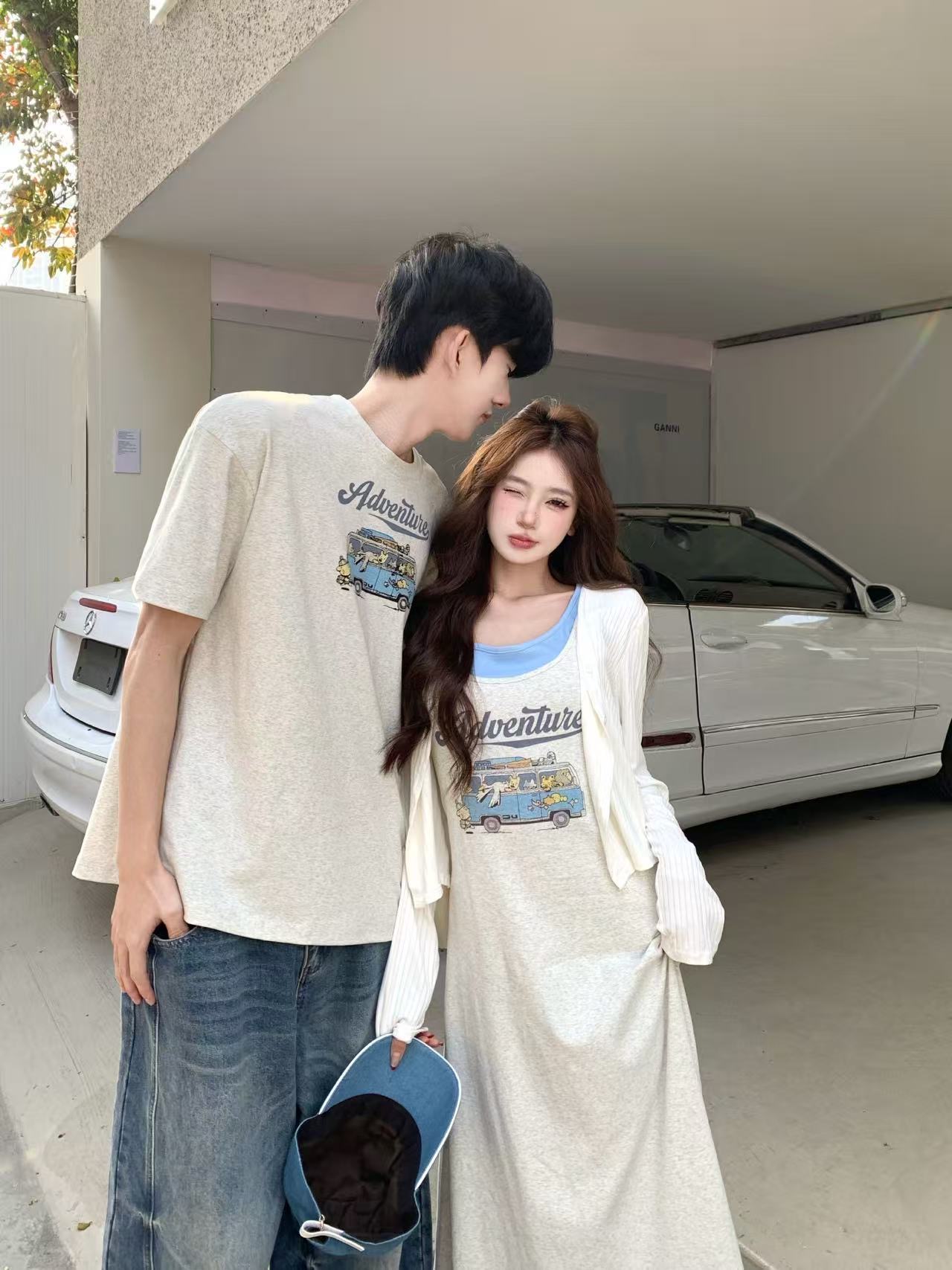 실사 여름 캐주얼 여성 품격 티셔츠 반신 스커트 여성 의류 맨위 치마 세트 커플룩