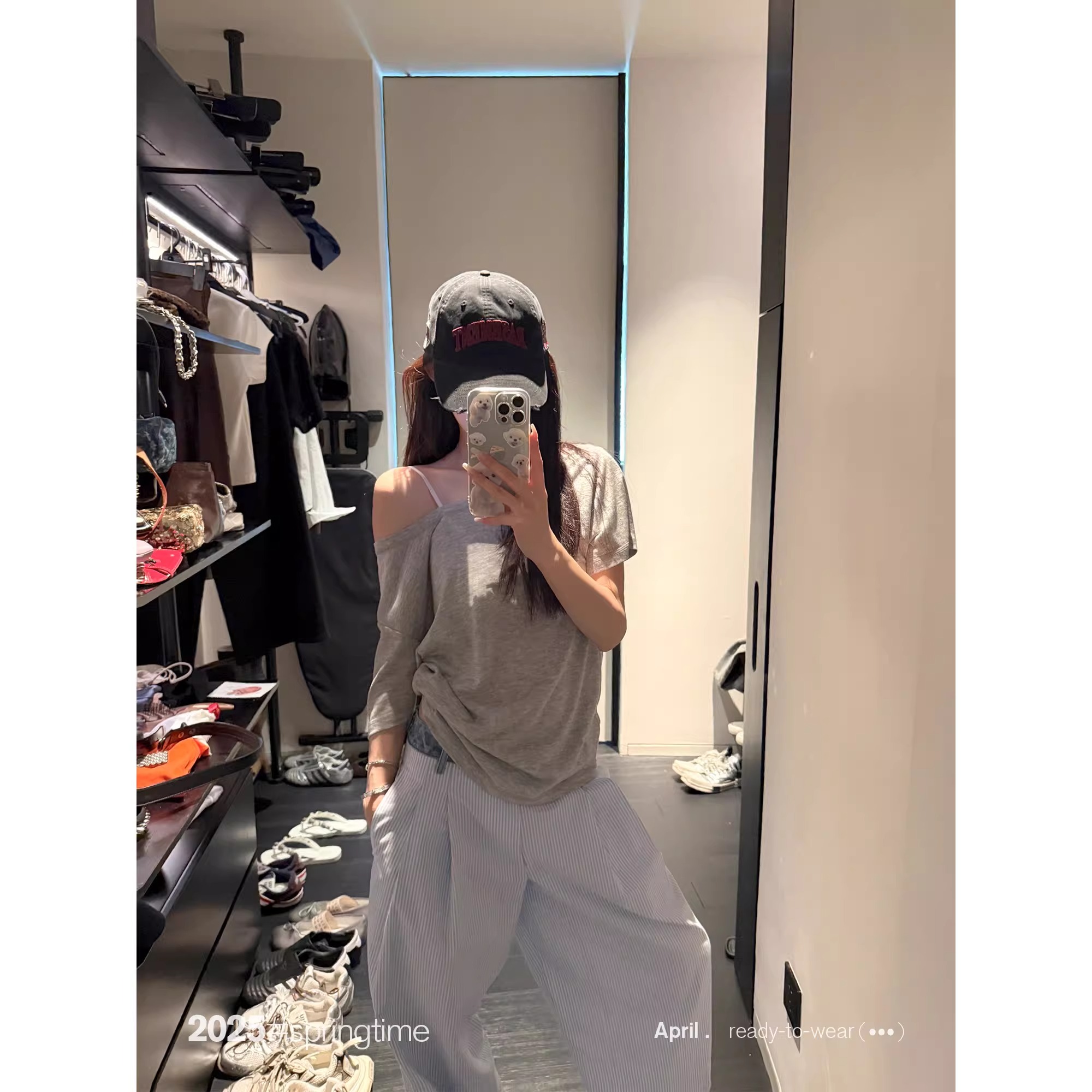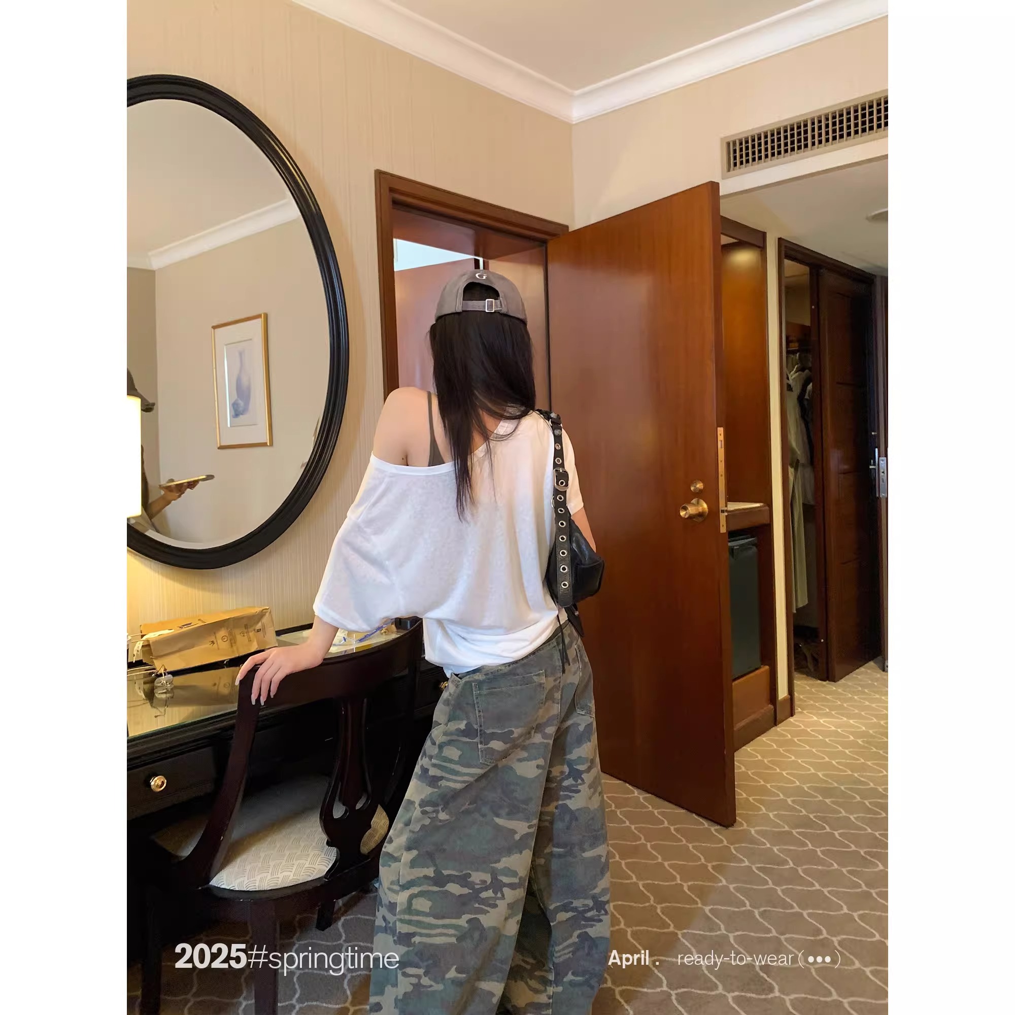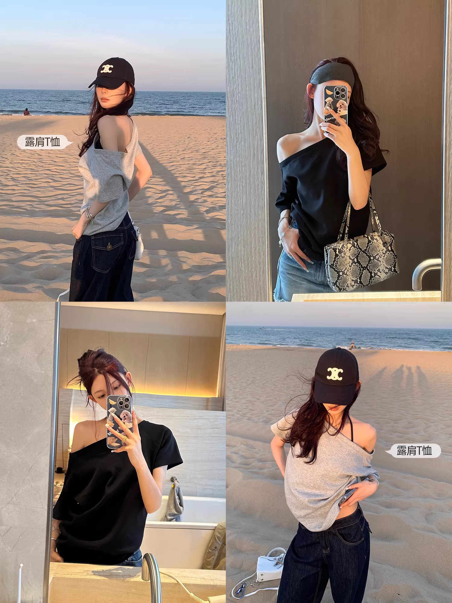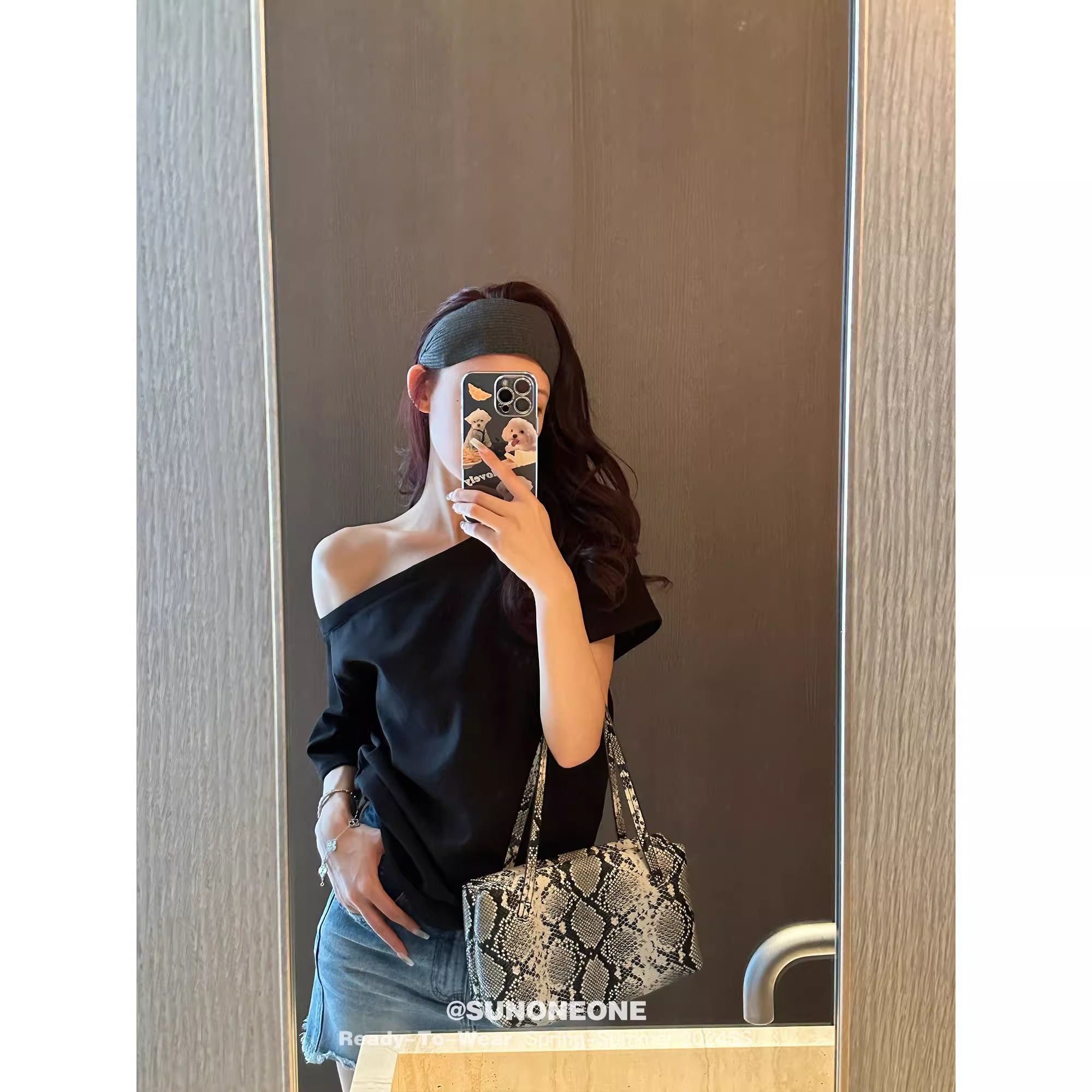 40 순면 220 그램 92 면 8 암모니아 Lun 비스듬한 칼라 오프숄더 오프숄더 반팔 티셔츠 여성 프린트