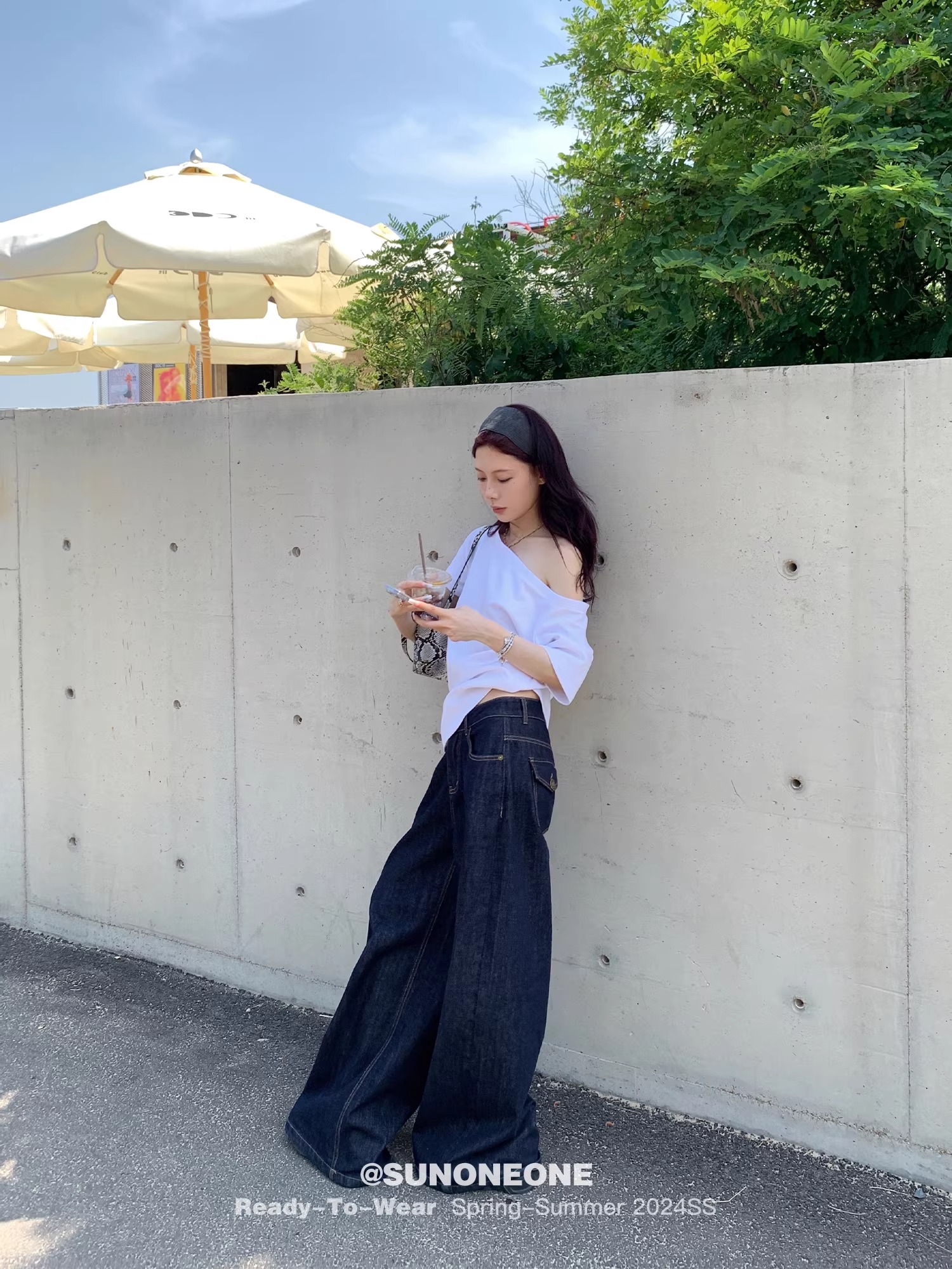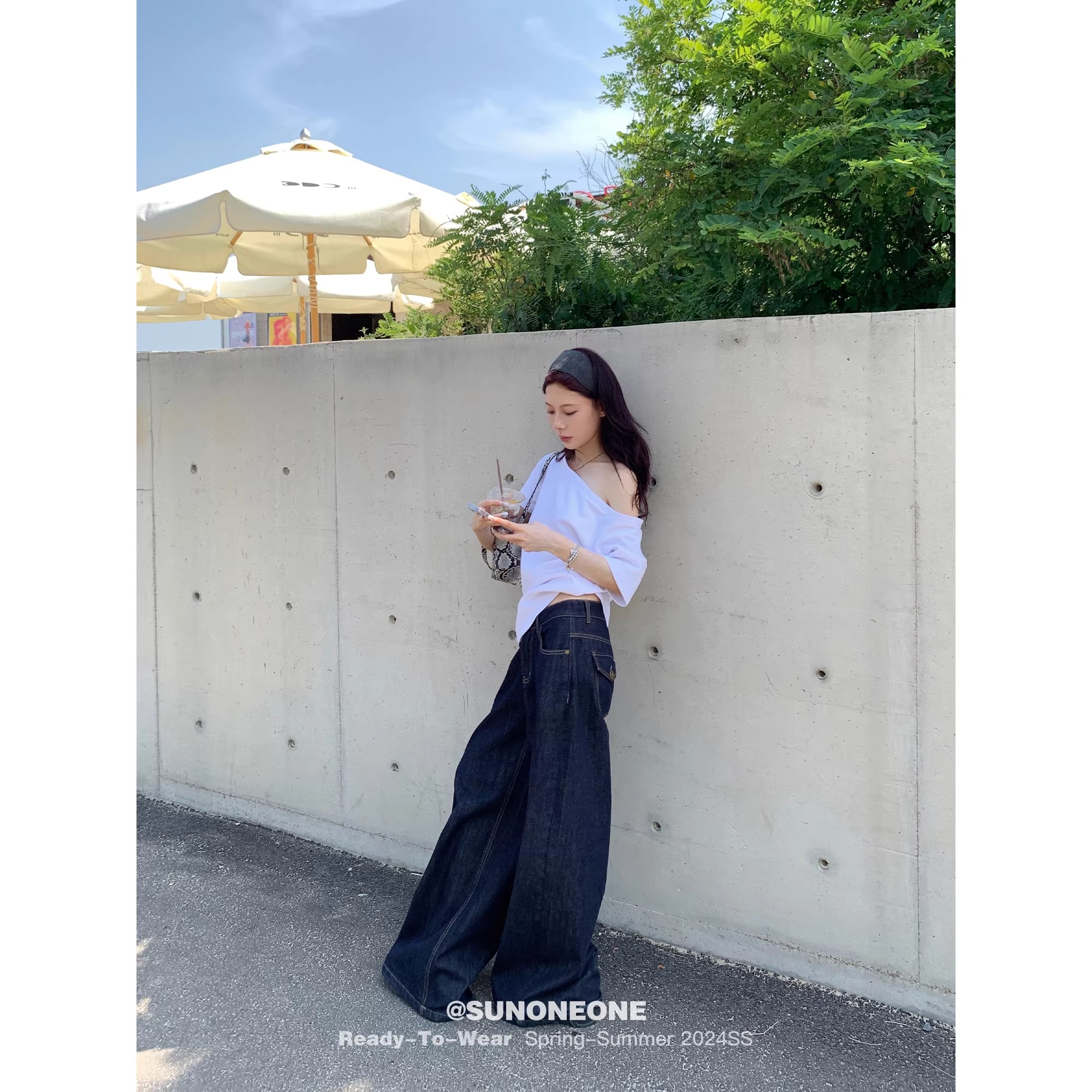 레트로 하이웨이스트 넓은 다리 청바지 여성 봄 가을 새로운 진한 파란색 다용도 슬림해 보이는 루즈핏 표지 고기 도루 센스 롱 바지