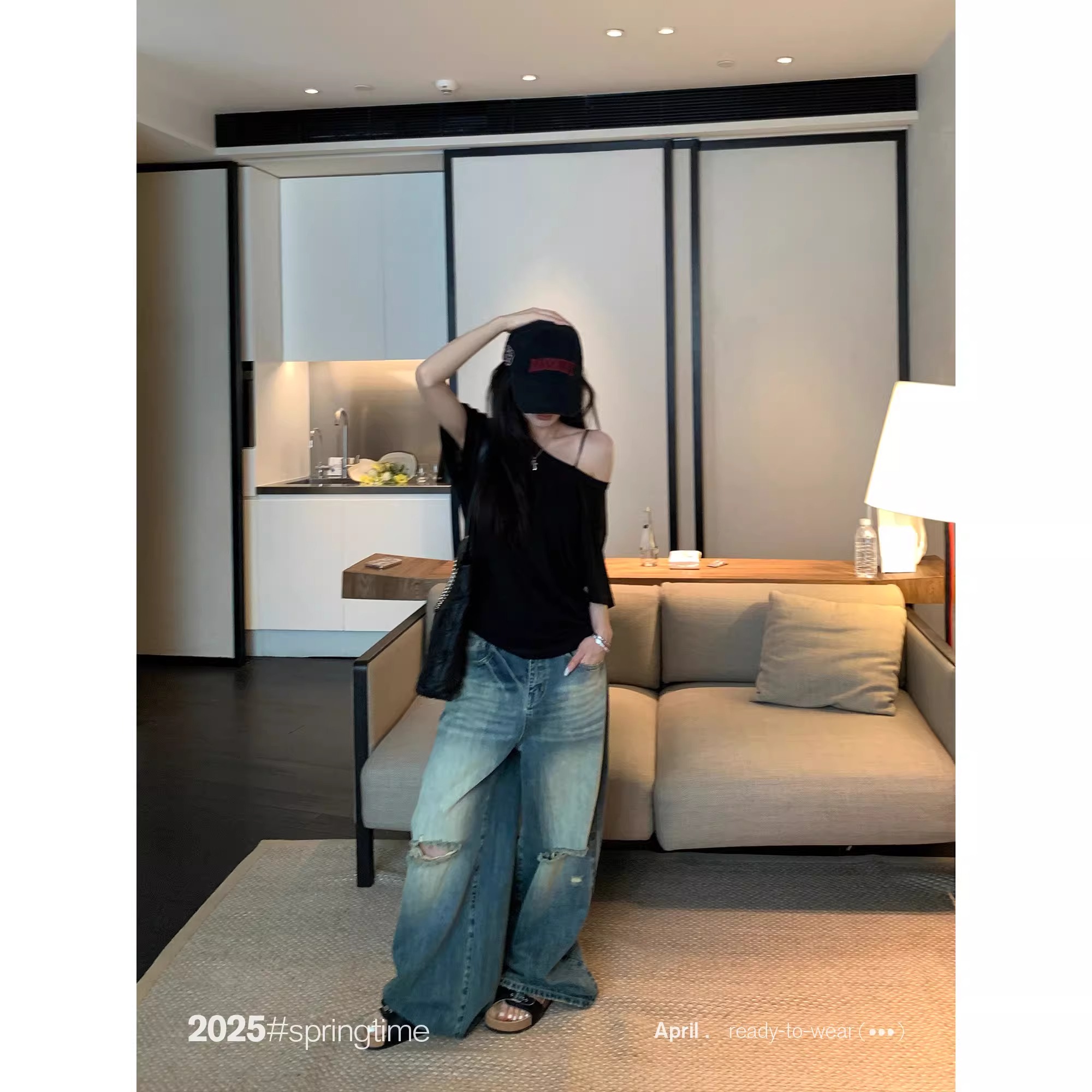 2026 봄 여름 새로운 아메리칸 레트로 워싱 마 오래된 질감 하이웨이스트 루즈핏 넓은 다리 7 점 청바지 여성 트렌디