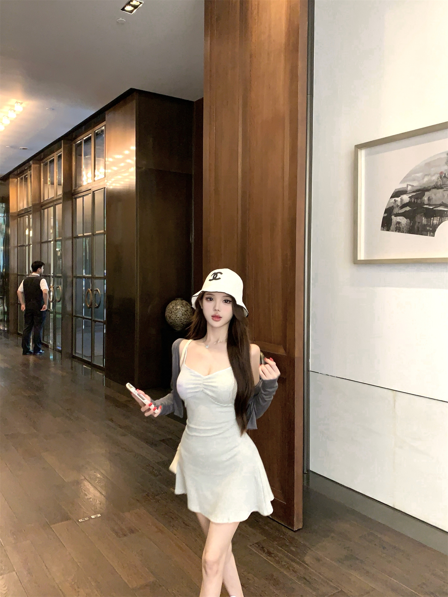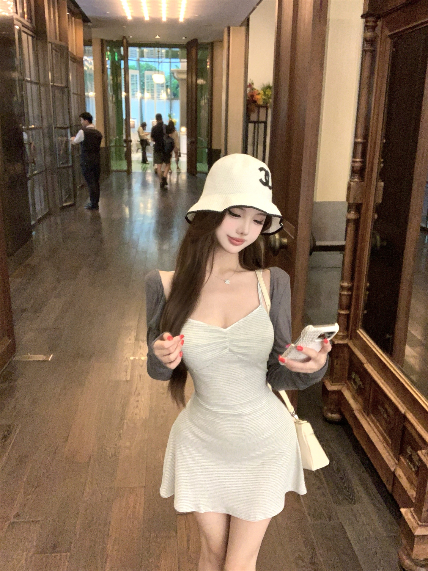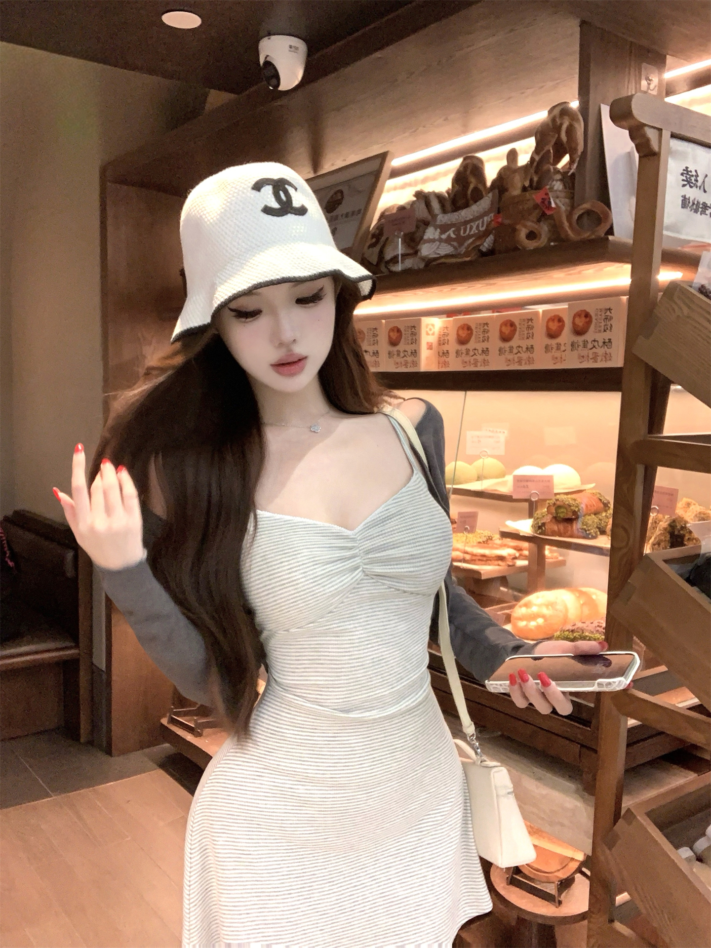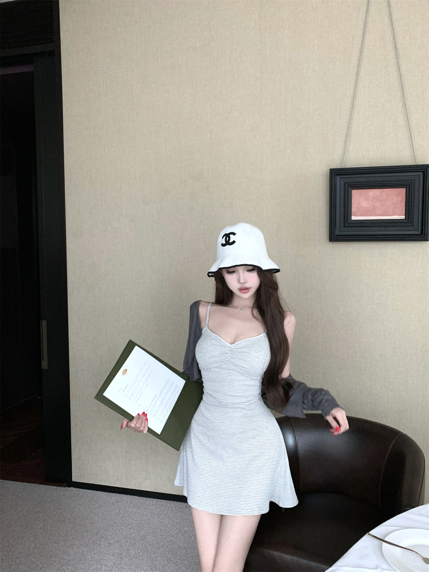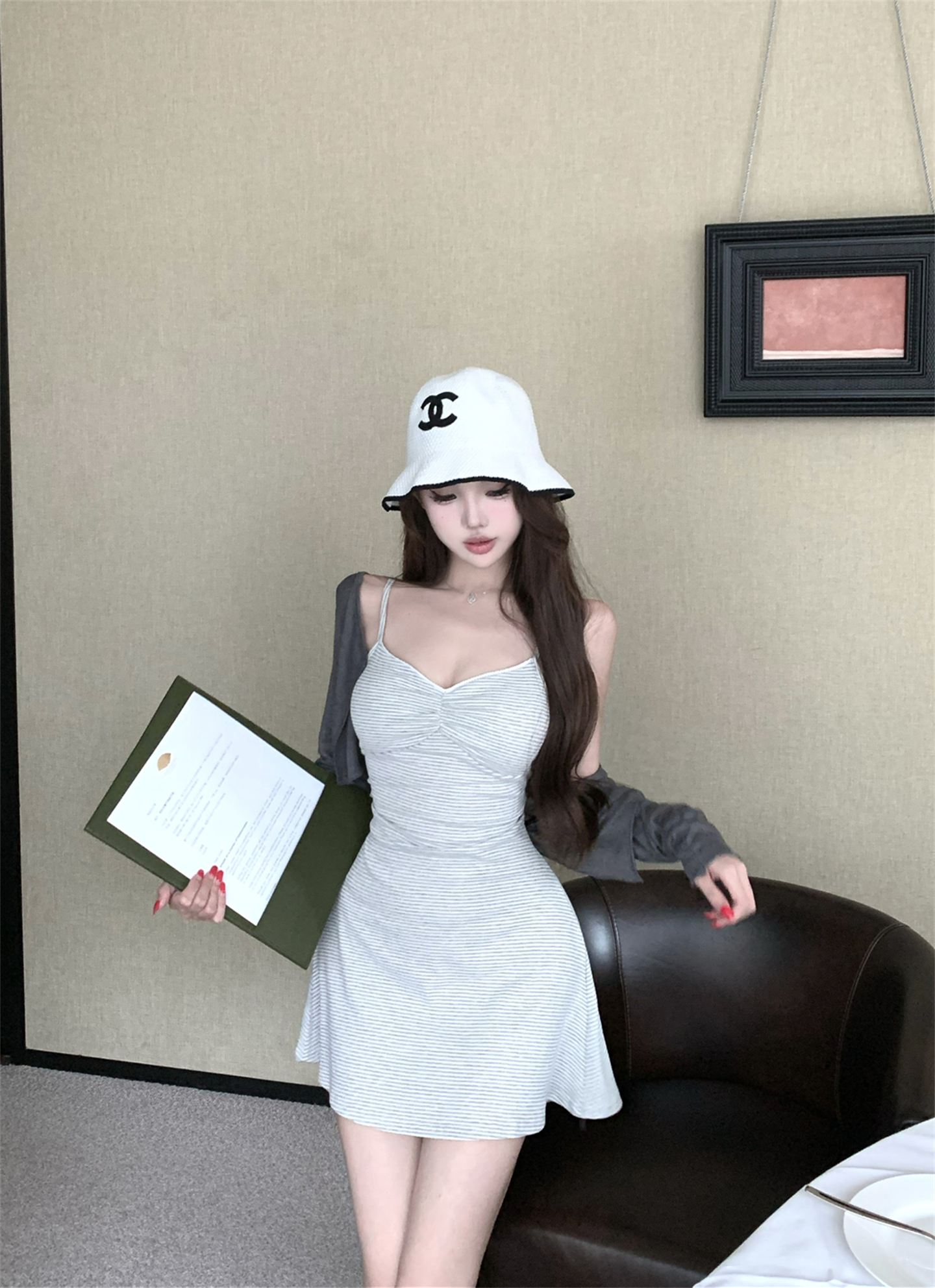 실사 봄 여름 빛 사람들 아름다움 센스 세트 그룹 주름 몸매 가꾸기 슬립 여성 드레스 주간 실크 오픈 가디건 투피스 세트